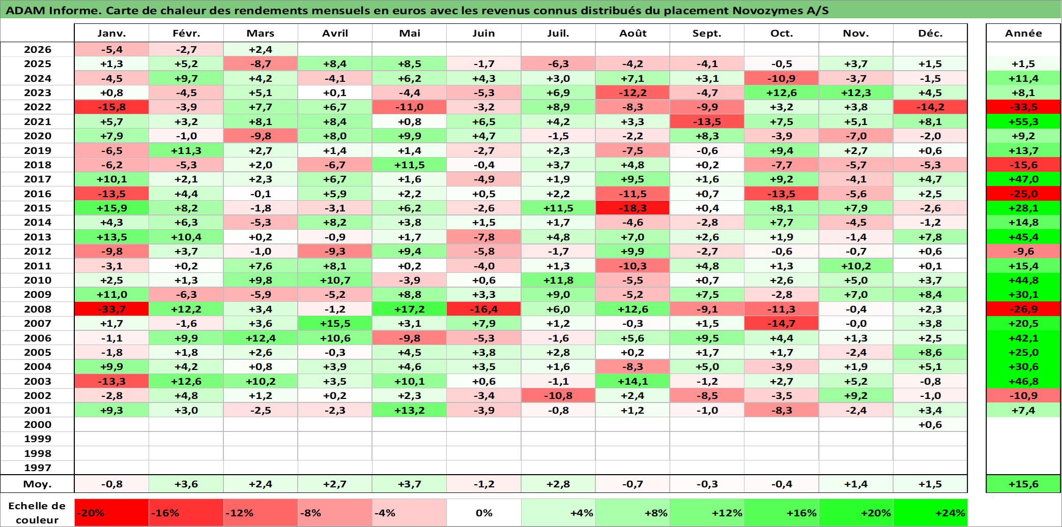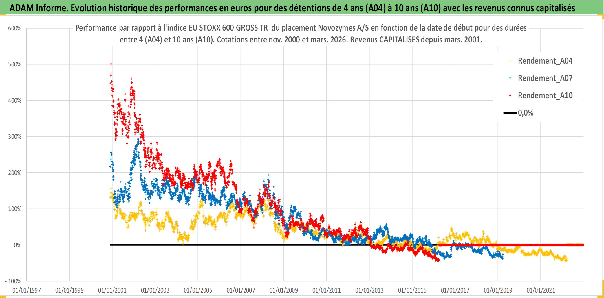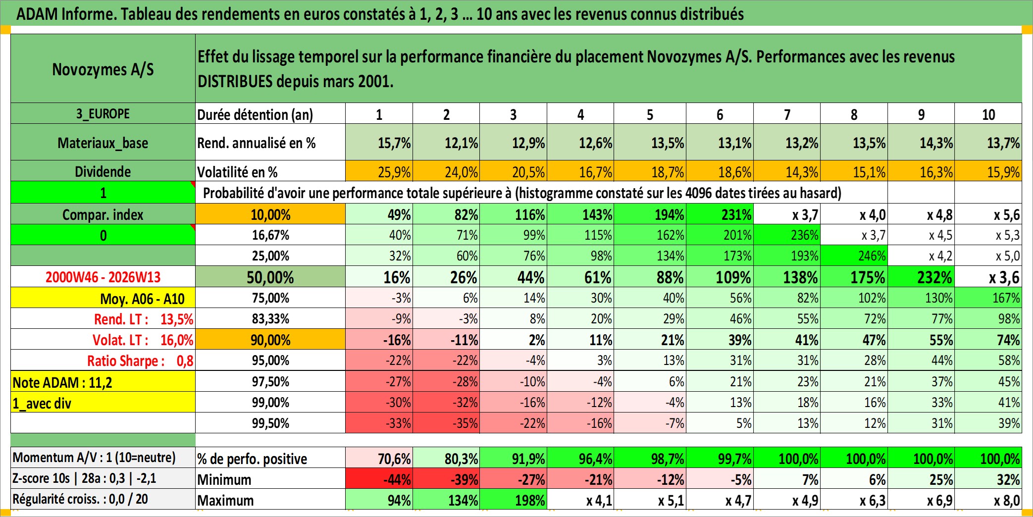 Site dédié aux investisseursPage dédiée sur site financeAnalyse des valorisations hebdomadaires de l'action Novozymes A/S. Cet actif est cote en DKK. Les valorisations sont en contrevaleur EURO et couvrent les semaines 2000W46 a 2026W13. Les revenus de cet actif financier sont pris en compte depuis la semaine 2001W12. La note globale ESG de cet actif est estimee a 13.0 (apres rebasage entre 0 et 20).