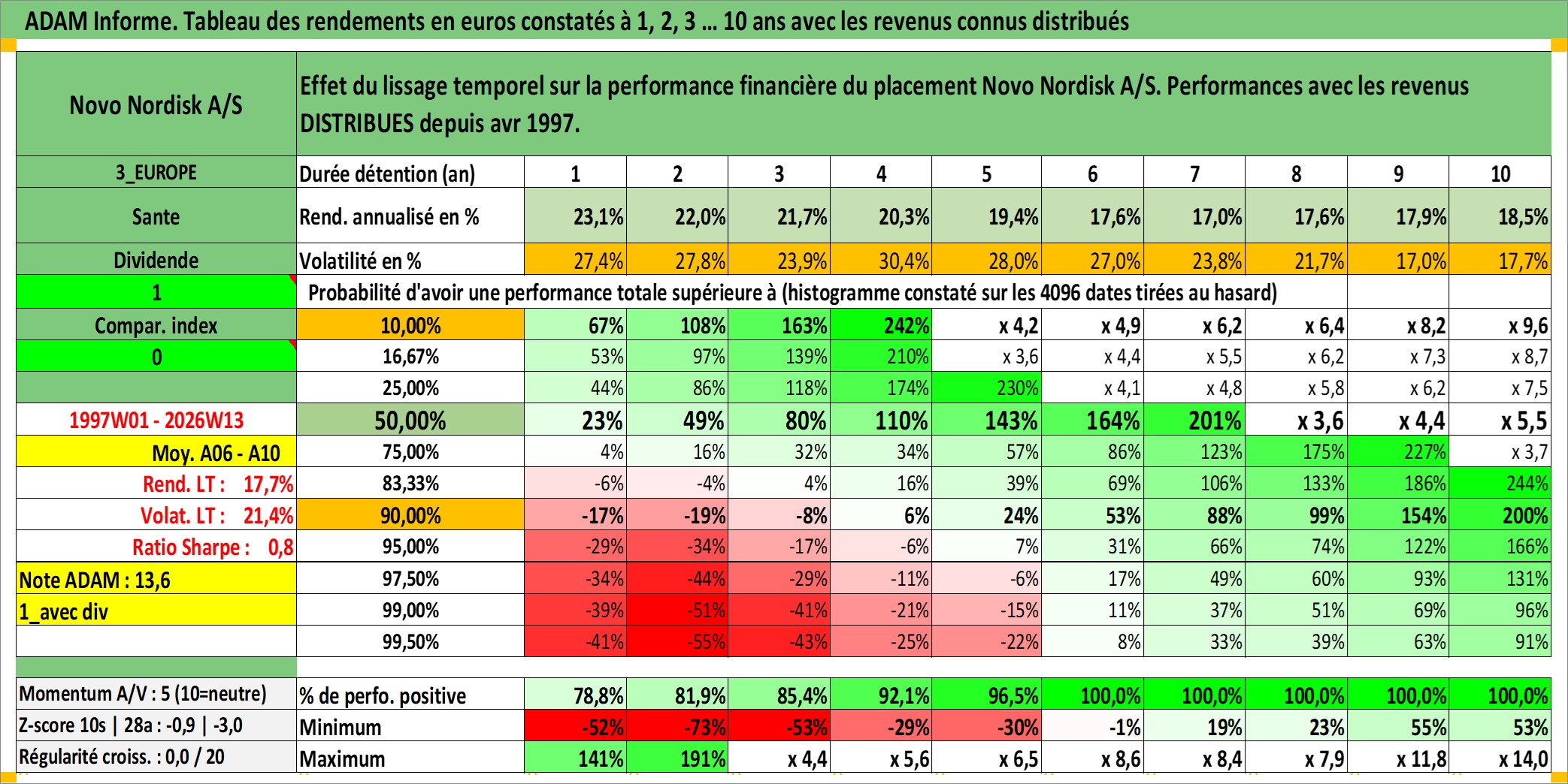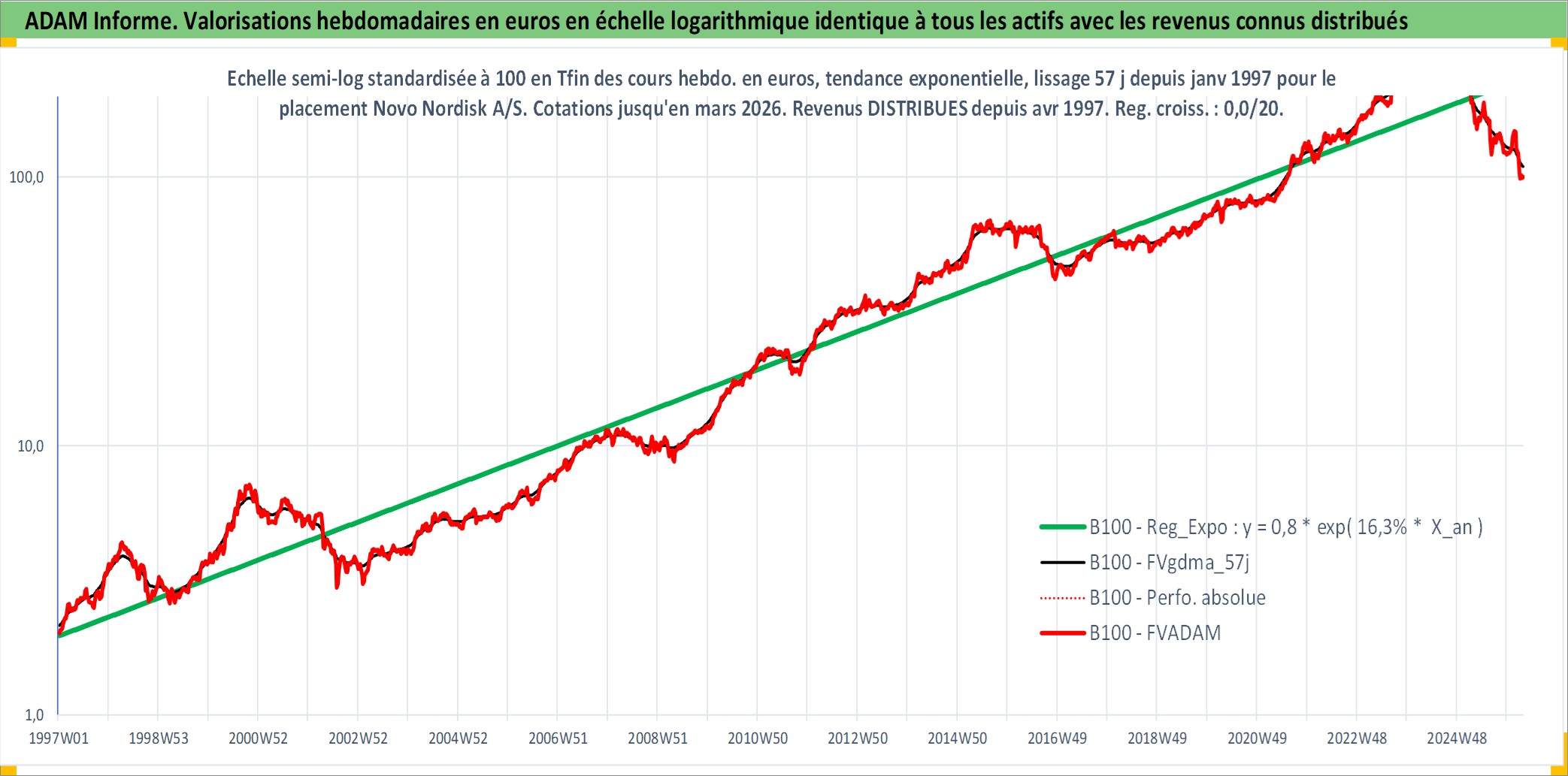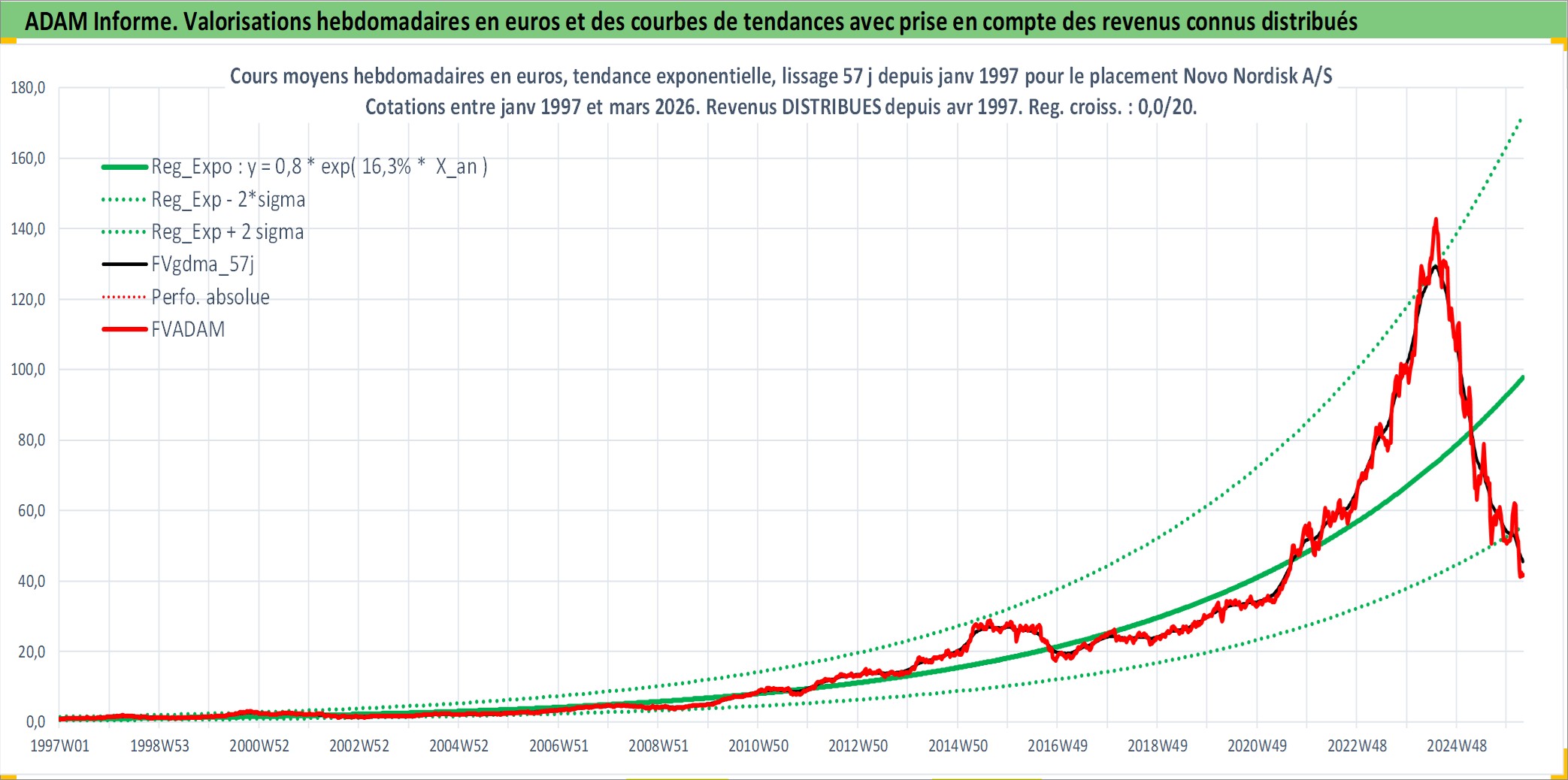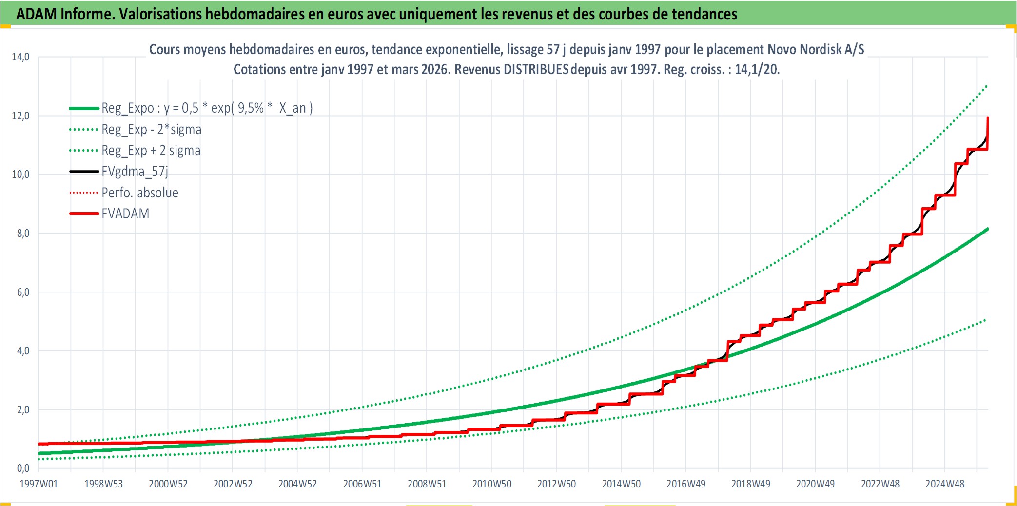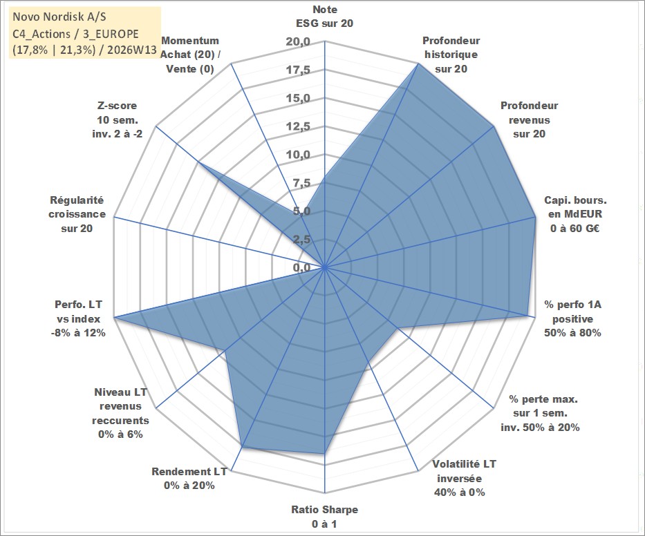 Site dédié aux investisseursPage dédiée sur site financeAnalyse des valorisations hebdomadaires de l'action Novo Nordisk A/S. Cet actif est cote en DKK. Les valorisations sont en contrevaleur EURO et couvrent les semaines 1997W01 a 2026W13. Les revenus de cet actif financier sont pris en compte depuis la semaine 1997W17. La note globale ESG de cet actif est estimee a 8.0 (apres rebasage entre 0 et 20).