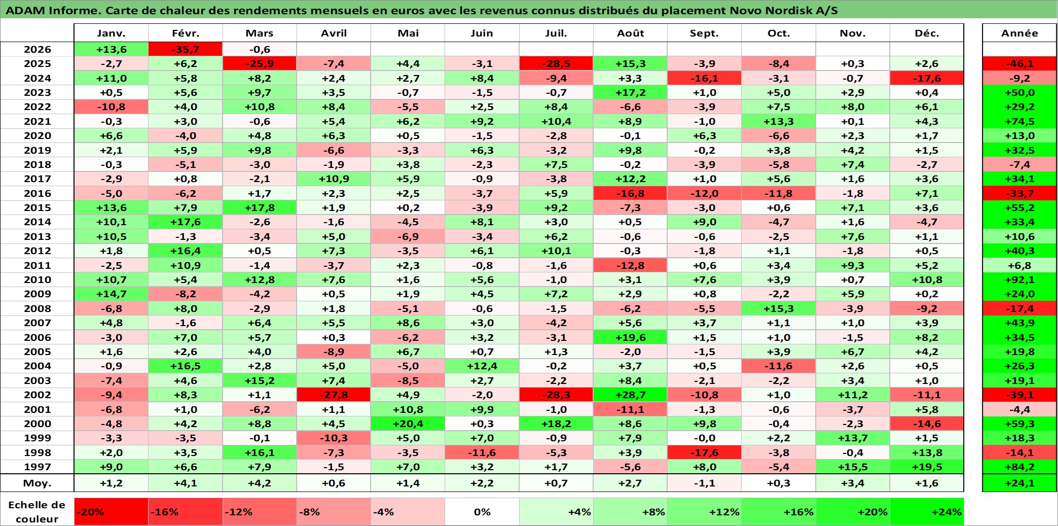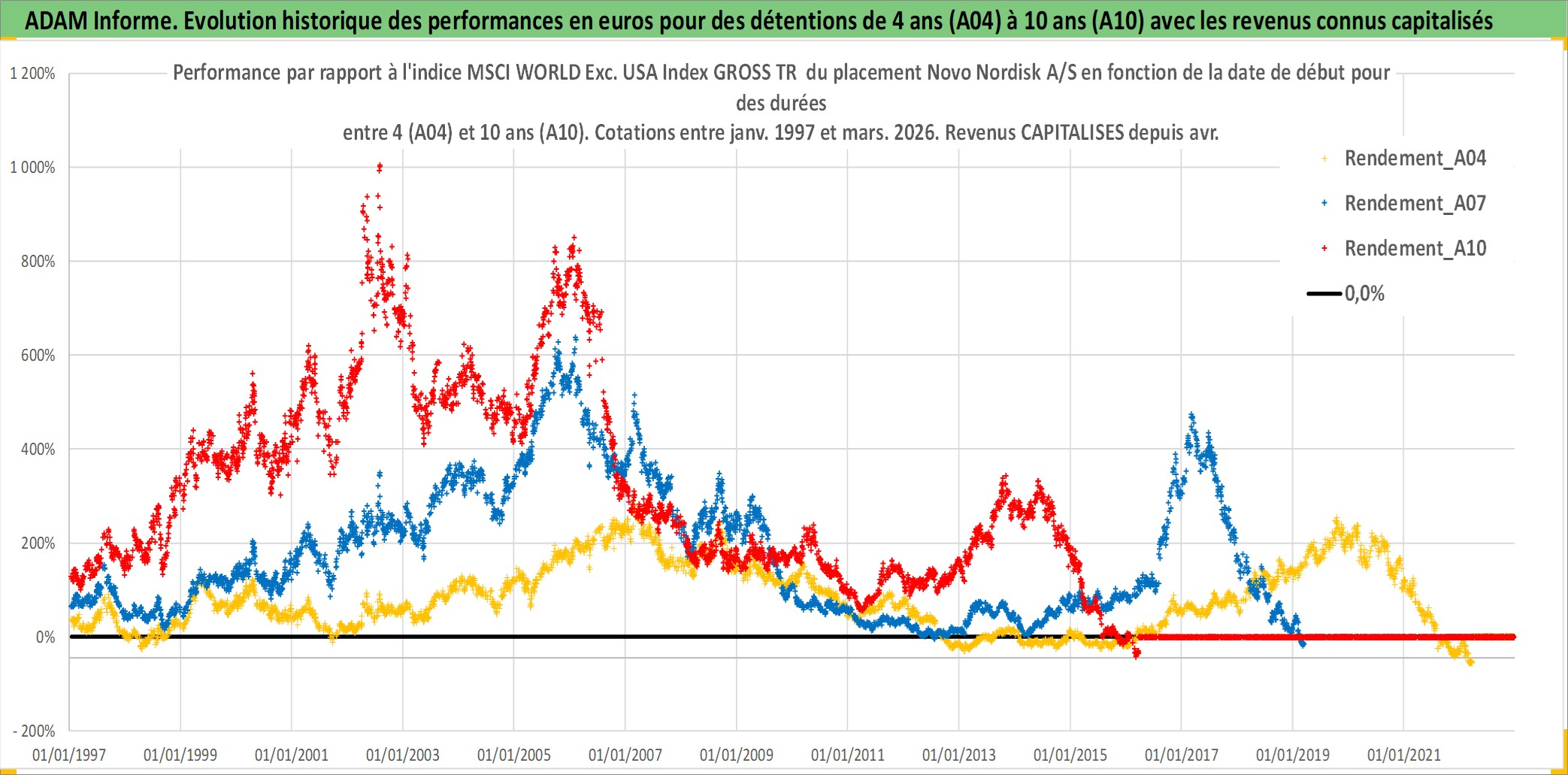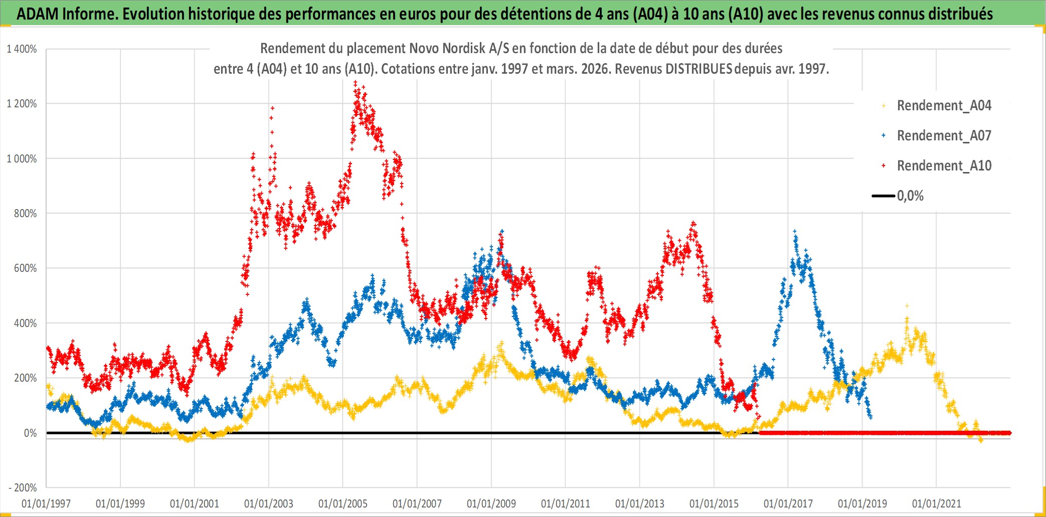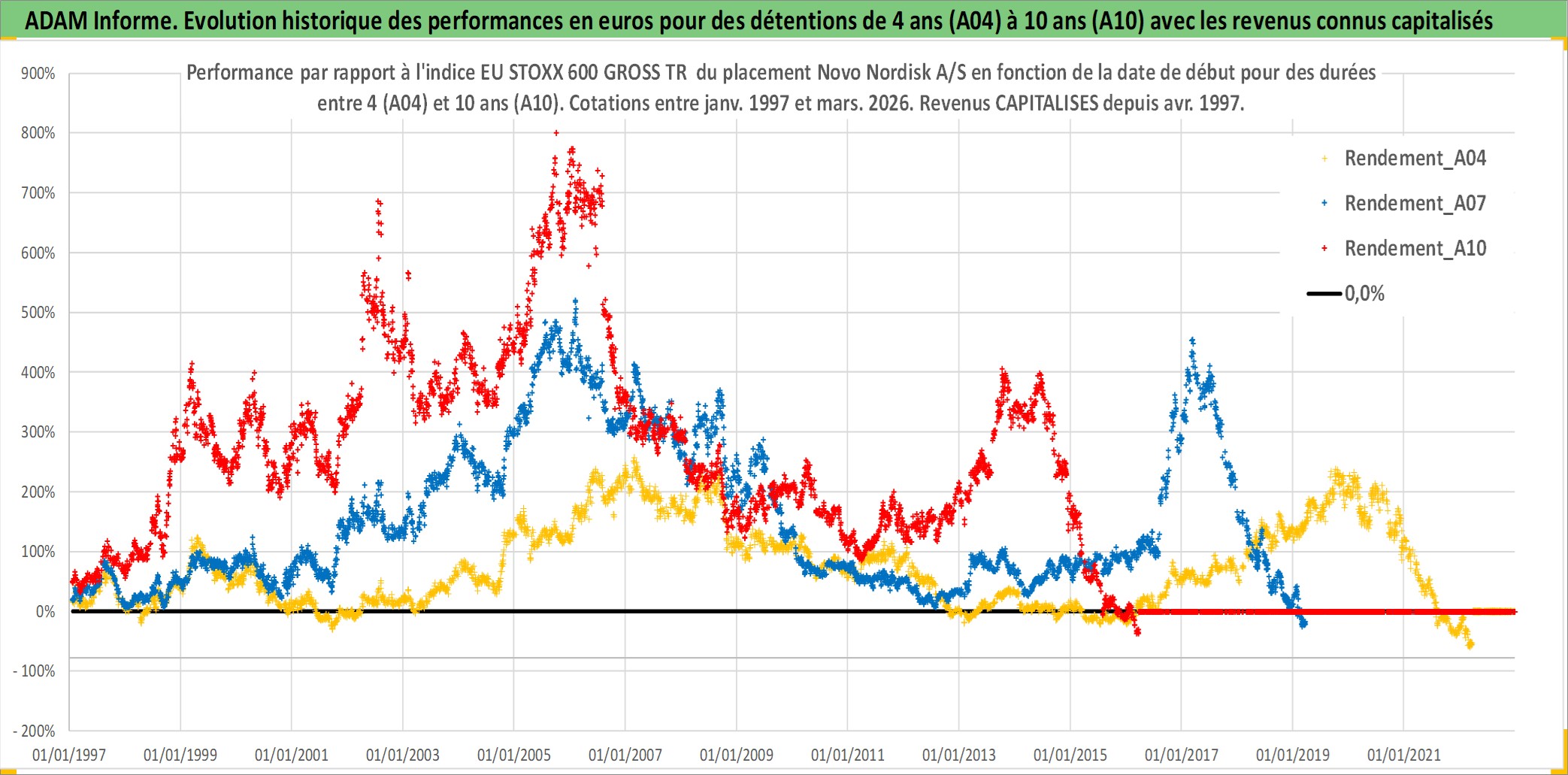 Site dédié aux investisseursPage dédiée sur site financeAnalyse des valorisations hebdomadaires de l'action Novo Nordisk A/S. Cet actif est cote en DKK. Les valorisations sont en contrevaleur EURO et couvrent les semaines 1997W01 a 2026W13. Les revenus de cet actif financier sont pris en compte depuis la semaine 1997W17. La note globale ESG de cet actif est estimee a 8.0 (apres rebasage entre 0 et 20).