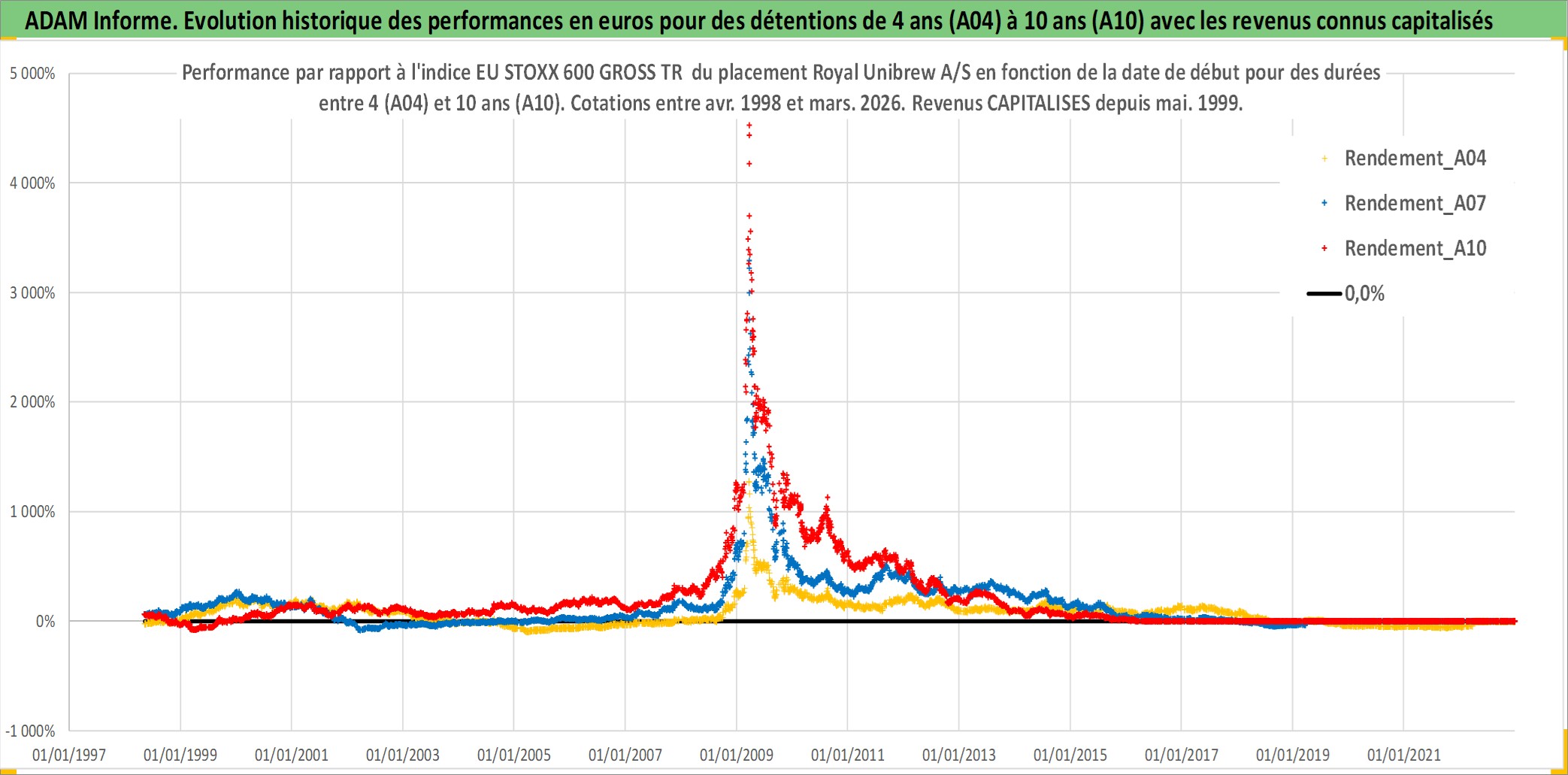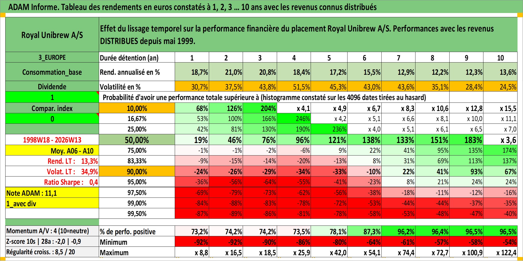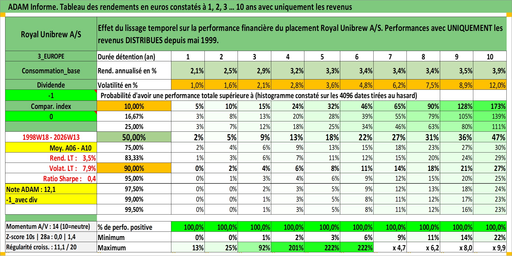 Site dédié aux investisseursPage dédiée sur site financeAnalyse des valorisations hebdomadaires de l'action Royal Unibrew A/S. Cet actif est cote en DKK. Les valorisations sont en contrevaleur EURO et couvrent les semaines 1998W18 a 2026W13. Les revenus de cet actif financier sont pris en compte depuis la semaine 1999W19. La note ESG de cet actif n'est pas connue.
