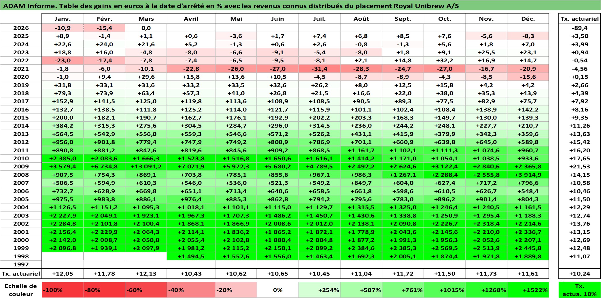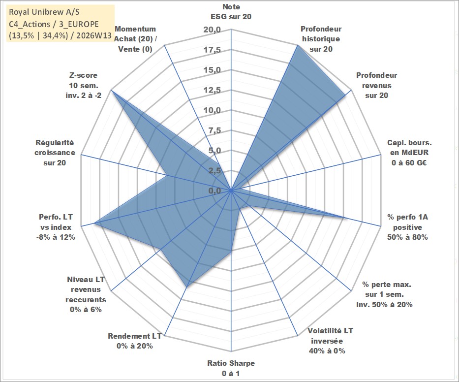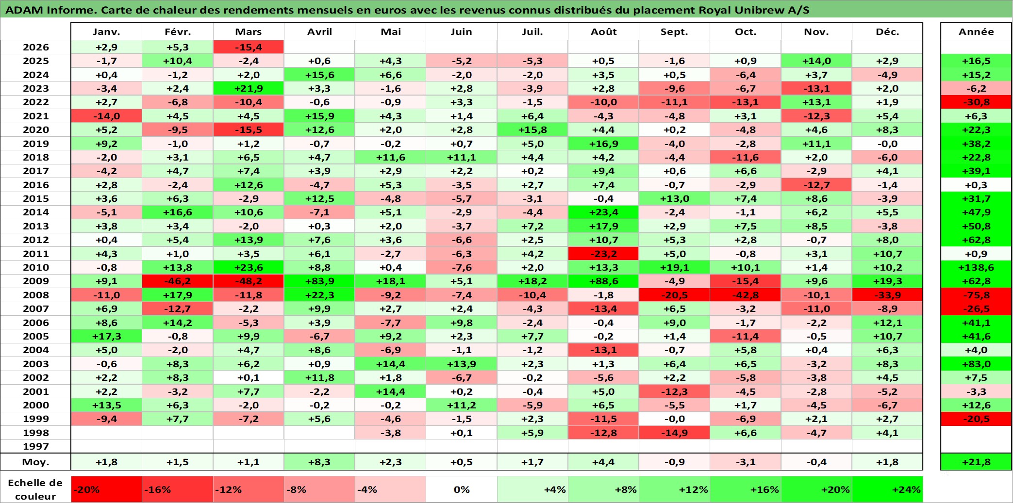 Site dédié aux investisseursPage dédiée sur site financeAnalyse des valorisations hebdomadaires de l'action Royal Unibrew A/S. Cet actif est cote en DKK. Les valorisations sont en contrevaleur EURO et couvrent les semaines 1998W18 a 2026W13. Les revenus de cet actif financier sont pris en compte depuis la semaine 1999W19. La note ESG de cet actif n'est pas connue.