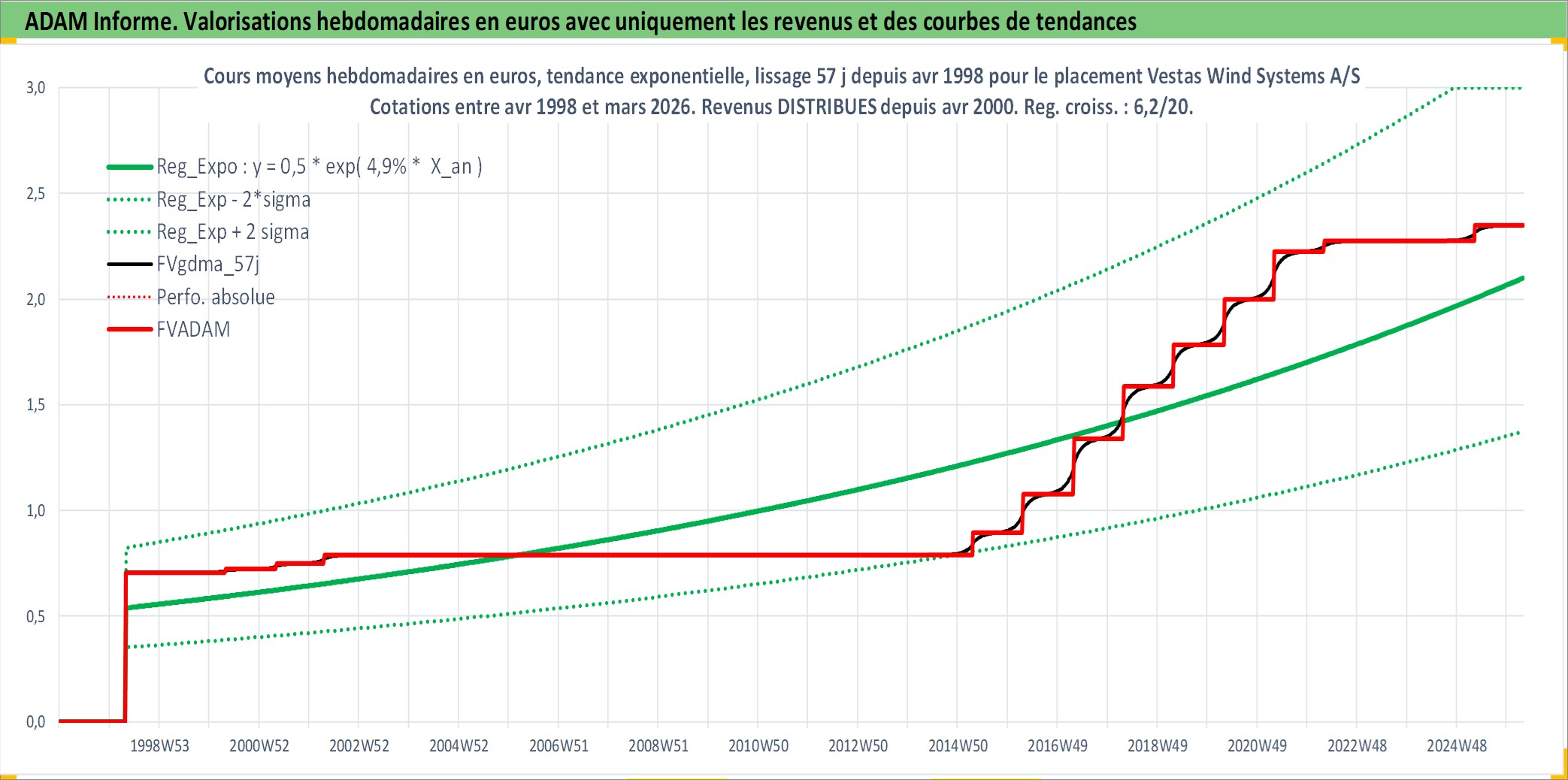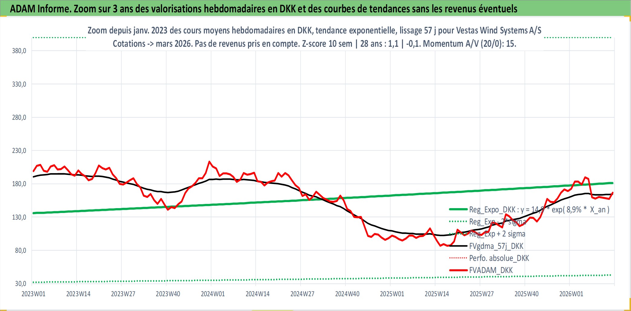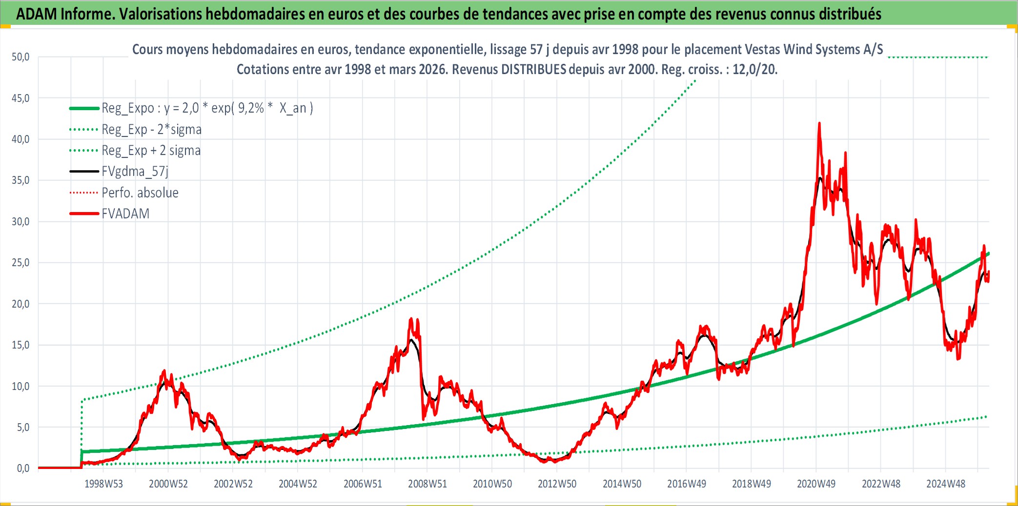Site dédié aux investisseursPage dédiée sur site financeAnalyse des valorisations hebdomadaires de l'action Vestas Wind Systems A/S. Cet actif est cote en DKK. Les valorisations sont en contrevaleur EURO et couvrent les semaines 1998W18 a 2026W13. Les revenus de cet actif financier sont pris en compte depuis la semaine 2000W17. La note globale ESG de cet actif est estimee a 11.0 (apres rebasage entre 0 et 20).