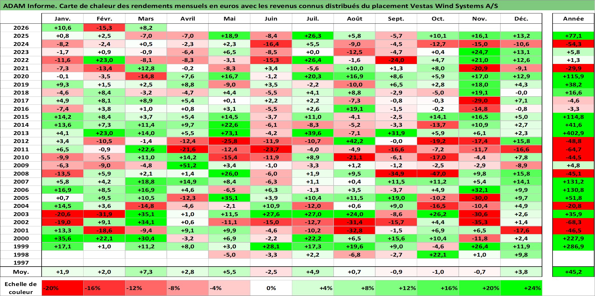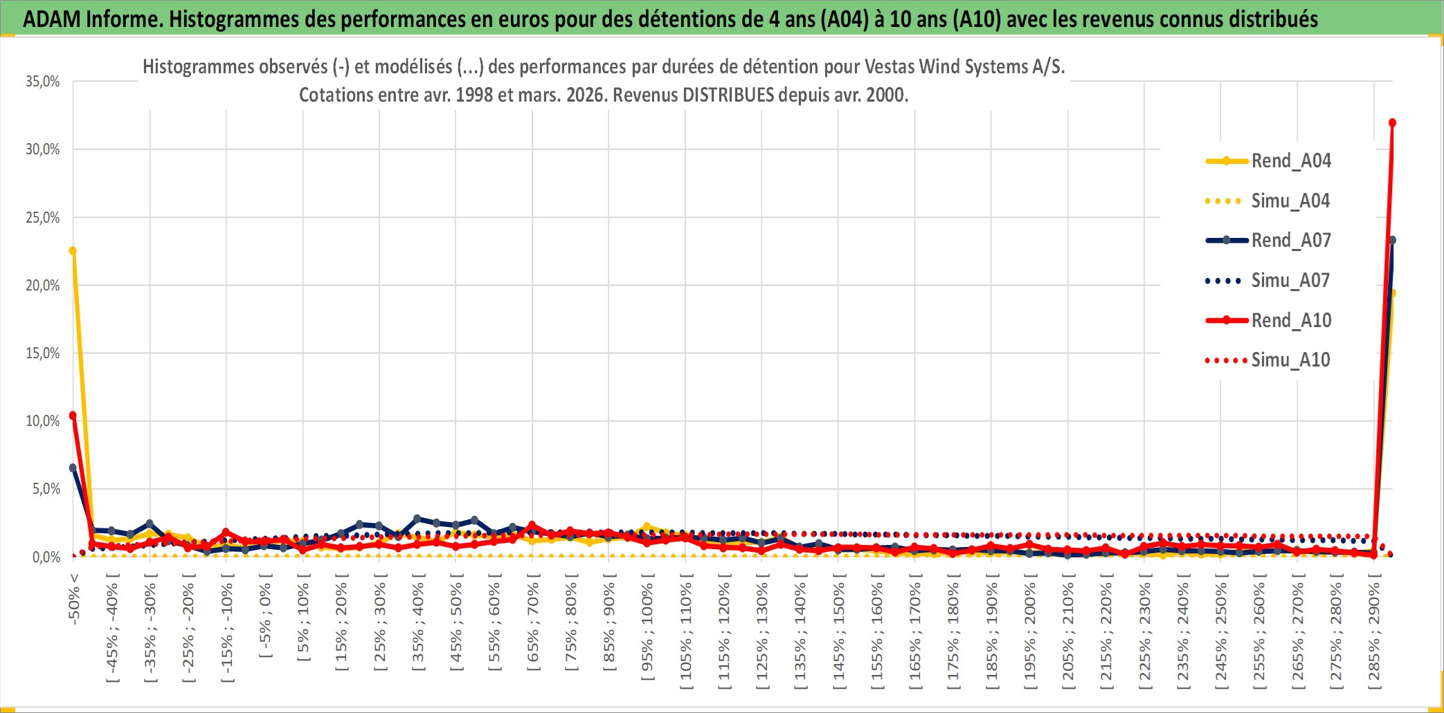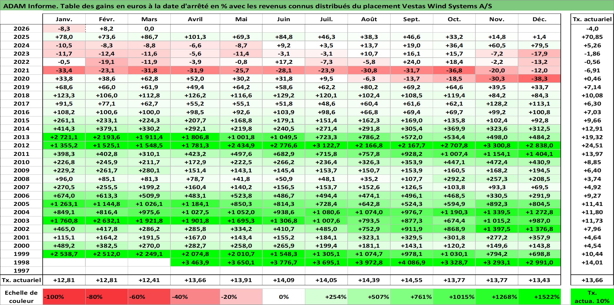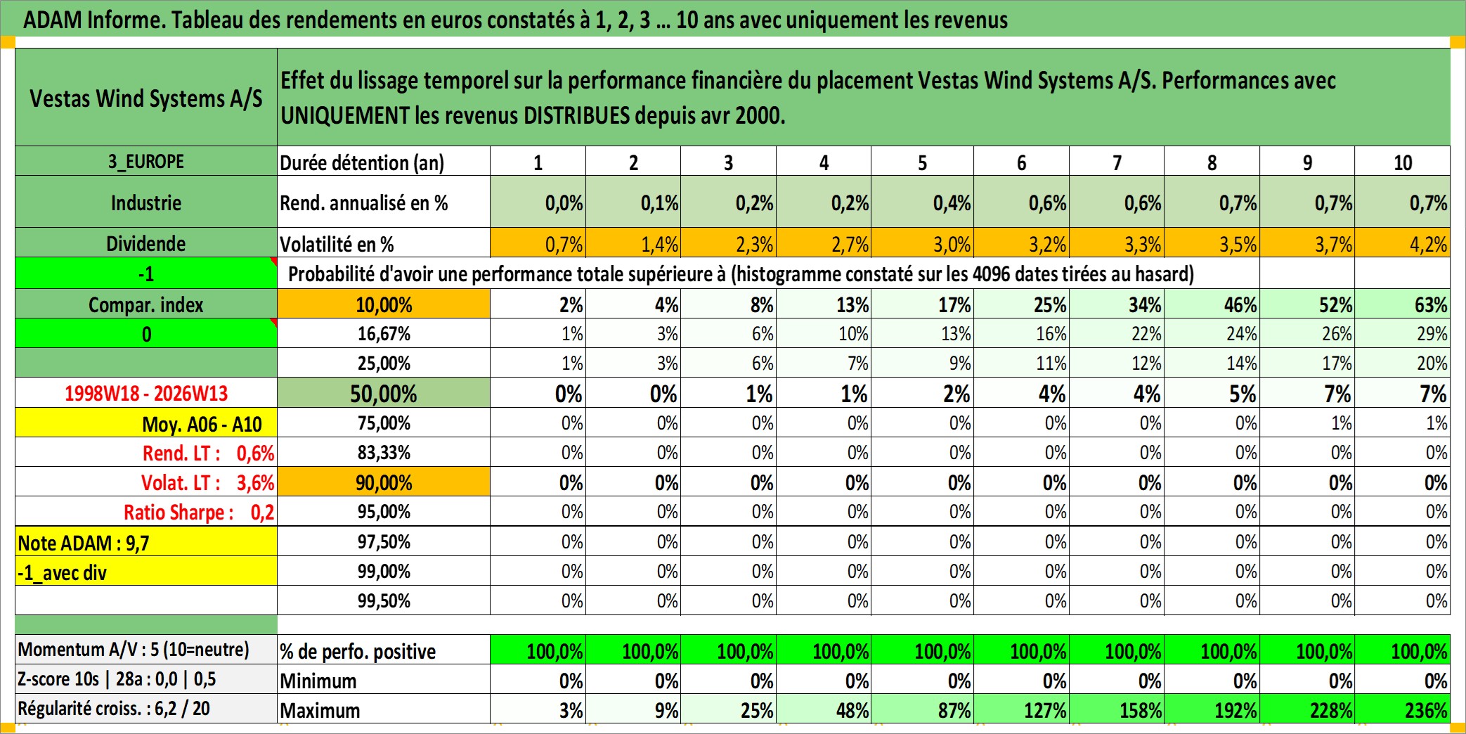 Site dédié aux investisseursPage dédiée sur site financeAnalyse des valorisations hebdomadaires de l'action Vestas Wind Systems A/S. Cet actif est cote en DKK. Les valorisations sont en contrevaleur EURO et couvrent les semaines 1998W18 a 2026W13. Les revenus de cet actif financier sont pris en compte depuis la semaine 2000W17. La note globale ESG de cet actif est estimee a 11.0 (apres rebasage entre 0 et 20).