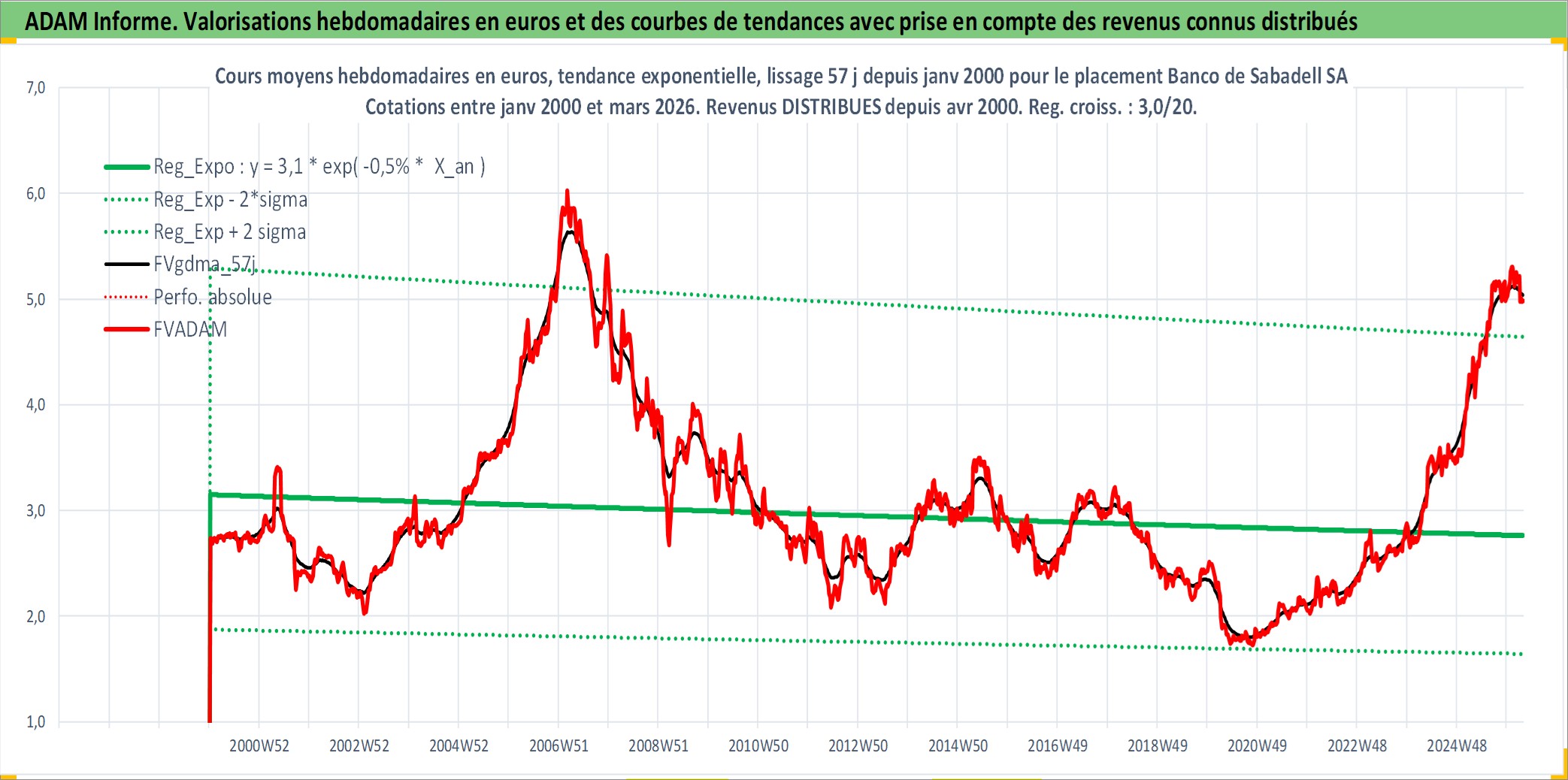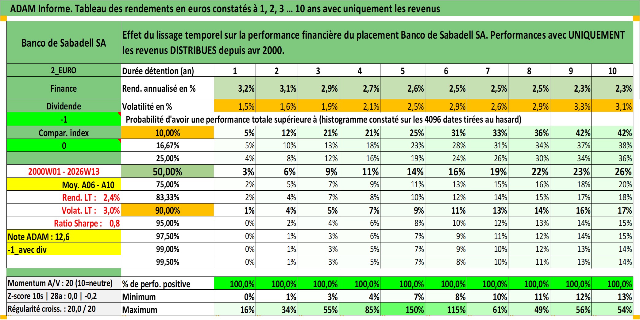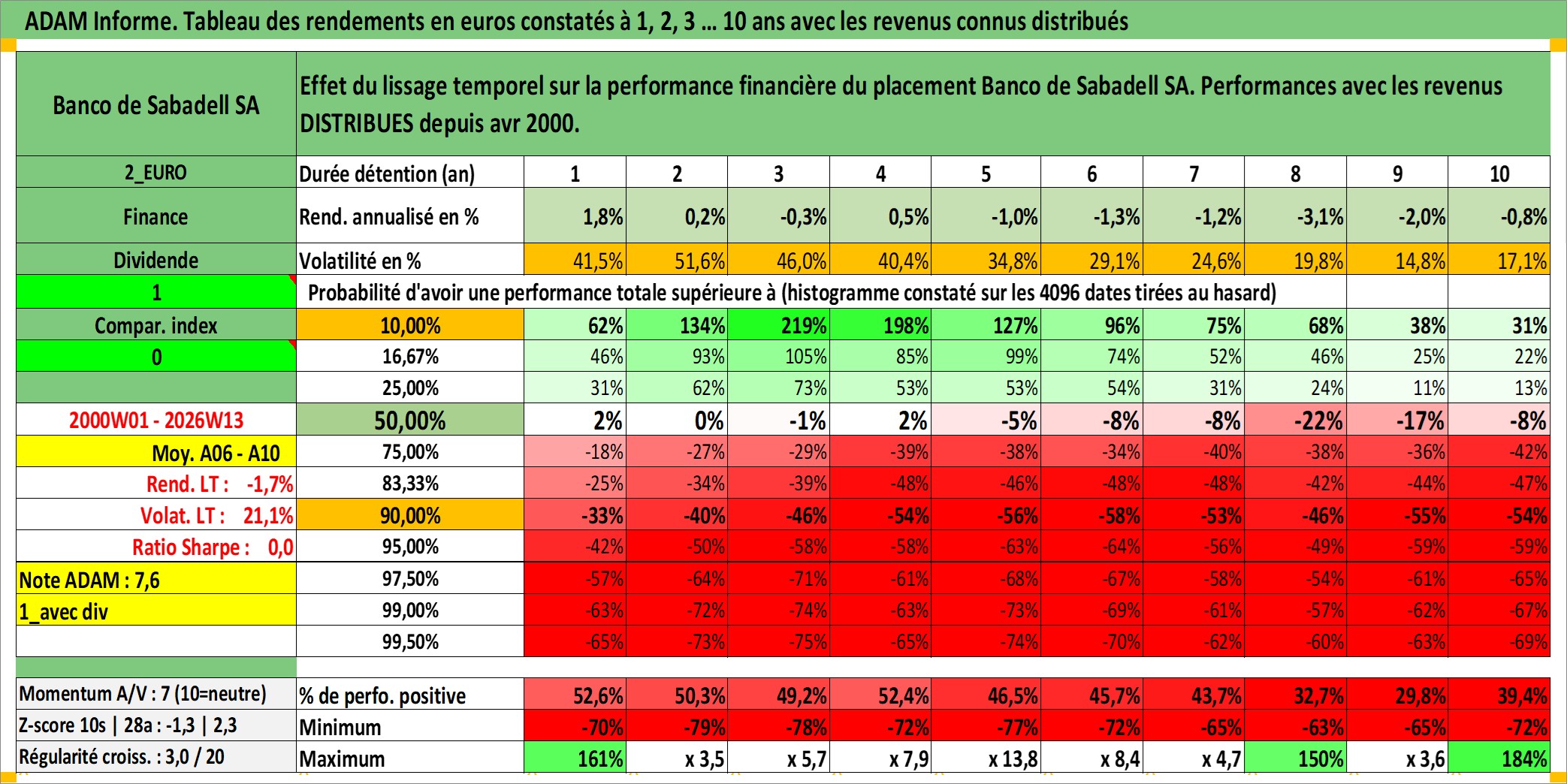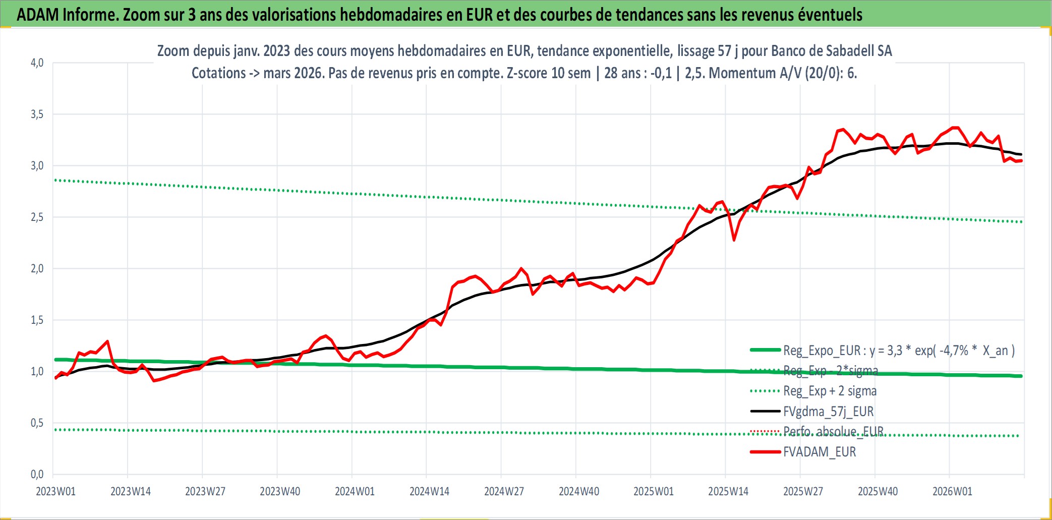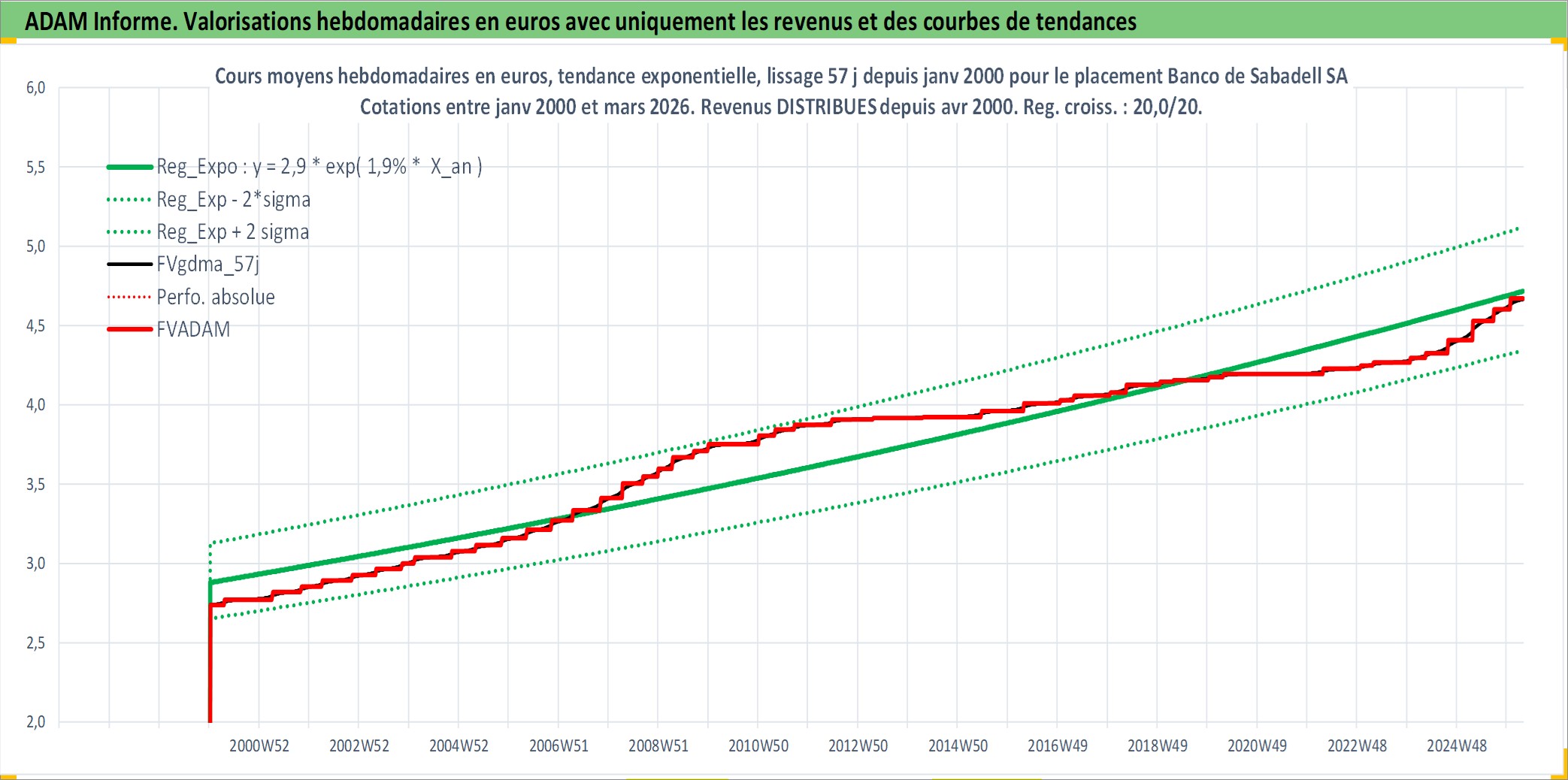 Site dédié aux investisseursPage dédiée sur site financeAnalyse des valorisations hebdomadaires de l'action Banco de Sabadell SA. Cet actif est cote en EUR. Les valorisations couvrent les semaines 2000W01 a 2026W13. Les revenus de cet actif financier sont pris en compte depuis la semaine 2000W16. La note globale ESG de cet actif est estimee a 11.0 (apres rebasage entre 0 et 20).