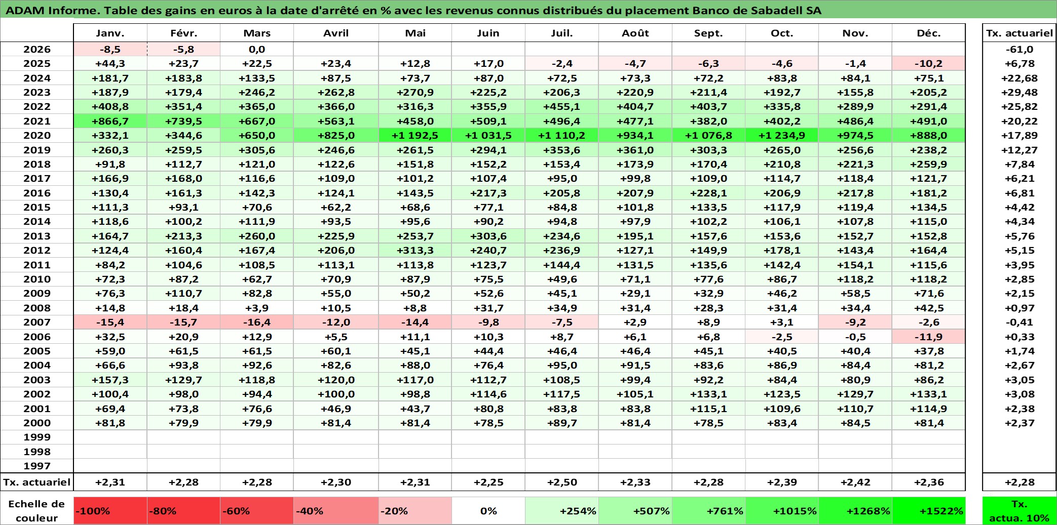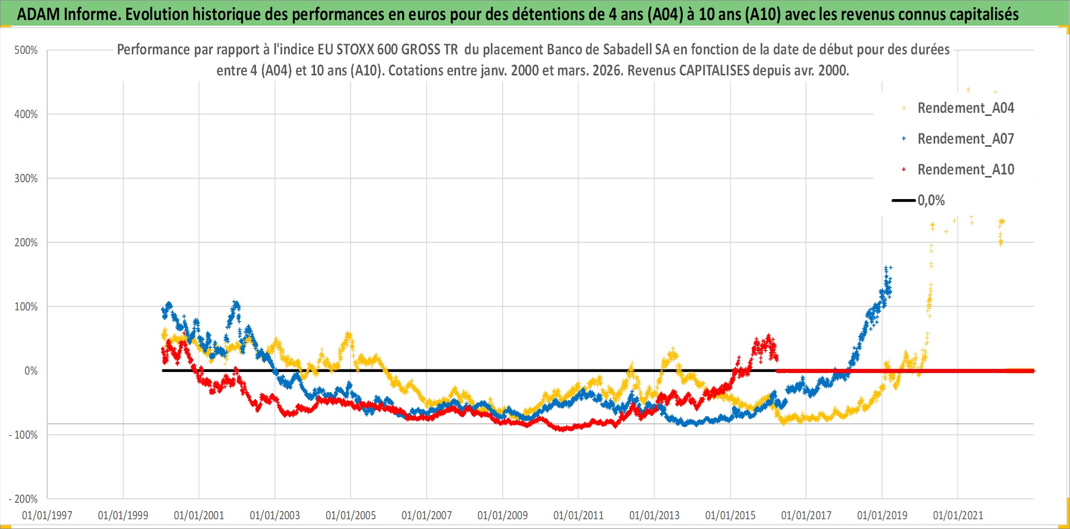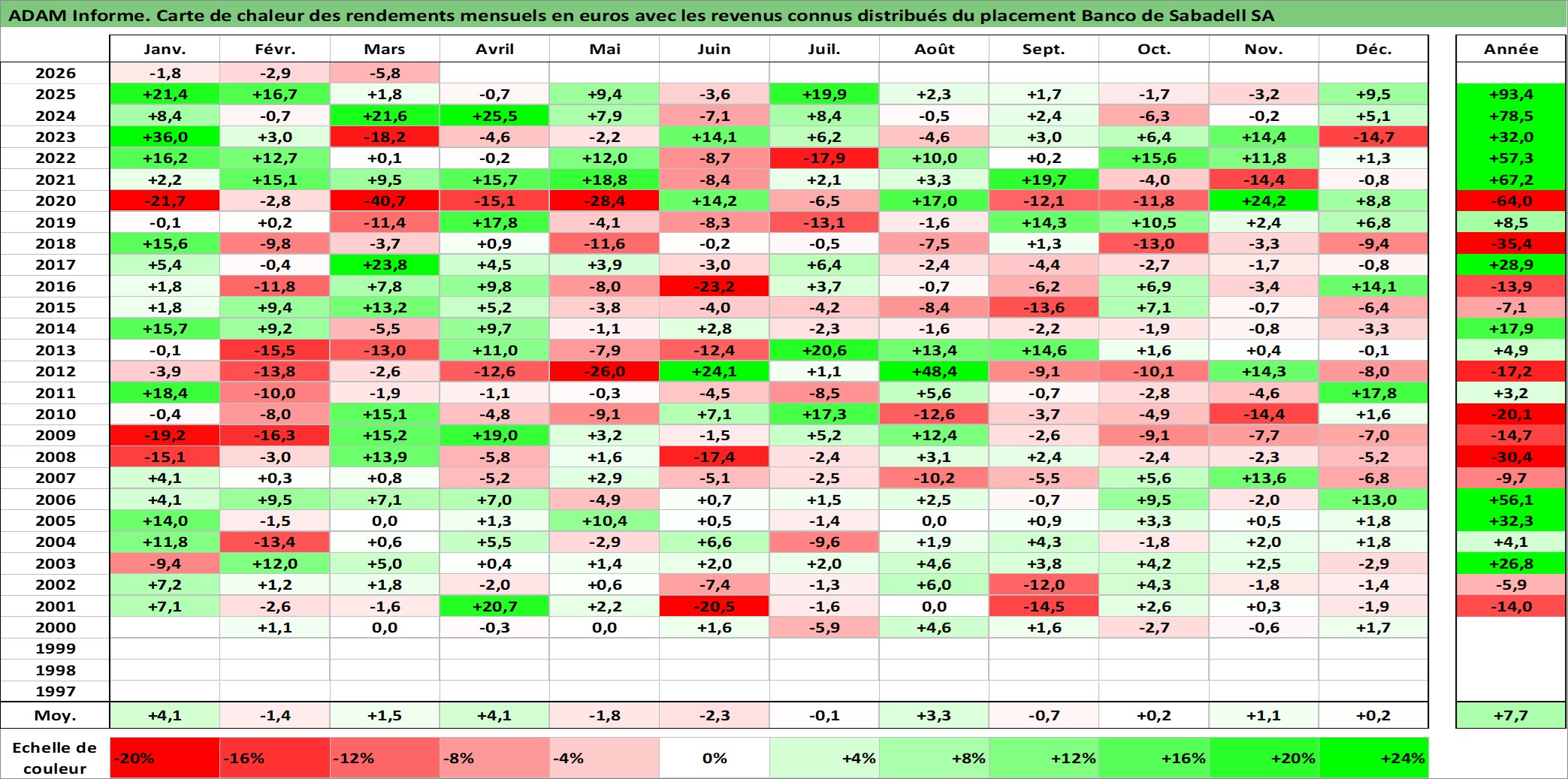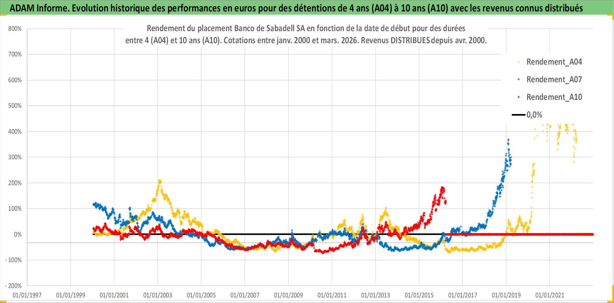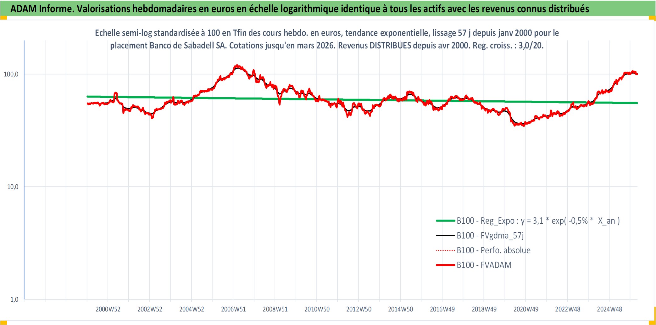 Site dédié aux investisseursPage dédiée sur site financeAnalyse des valorisations hebdomadaires de l'action Banco de Sabadell SA. Cet actif est cote en EUR. Les valorisations couvrent les semaines 2000W01 a 2026W13. Les revenus de cet actif financier sont pris en compte depuis la semaine 2000W16. La note globale ESG de cet actif est estimee a 11.0 (apres rebasage entre 0 et 20).
