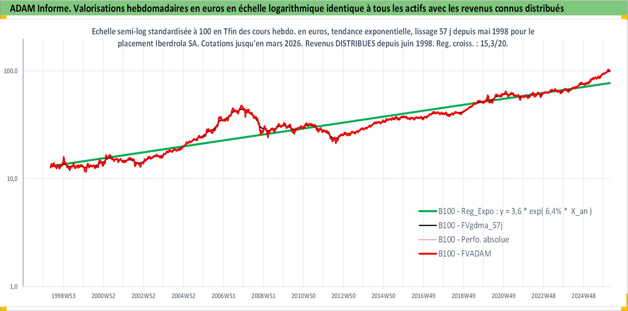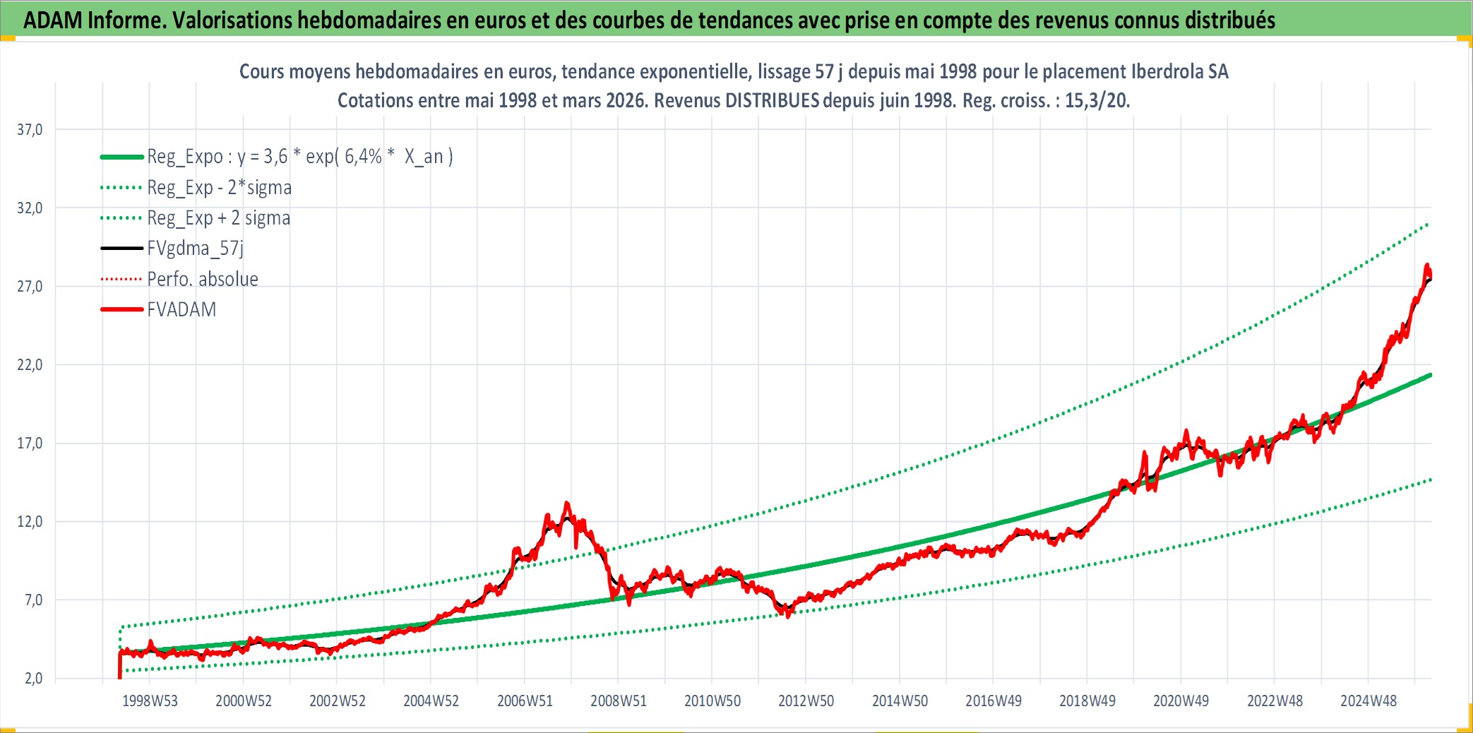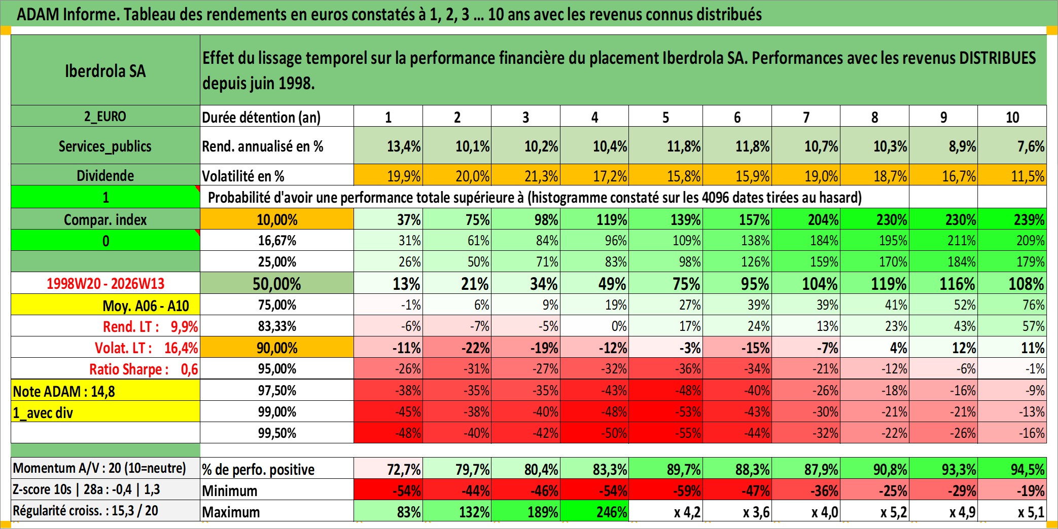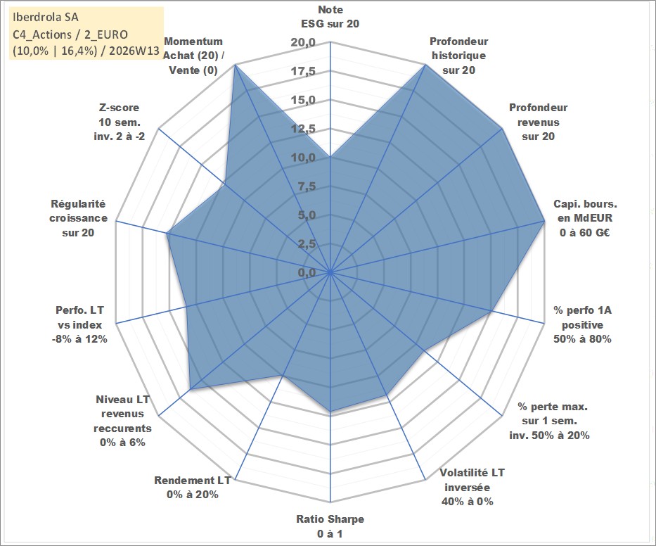 Site dédié aux investisseursPage dédiée sur site financeAnalyse des valorisations hebdomadaires de l'action Iberdrola SA. Cet actif est cote en EUR. Les valorisations couvrent les semaines 1998W20 a 2026W13. Les revenus de cet actif financier sont pris en compte depuis la semaine 1998W27. La note globale ESG de cet actif est estimee a 10.0 (apres rebasage entre 0 et 20).
