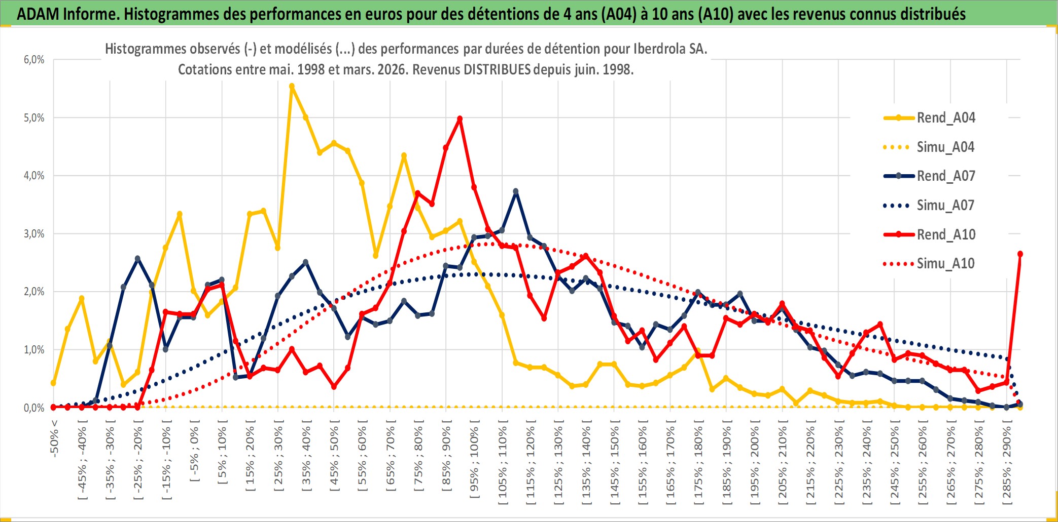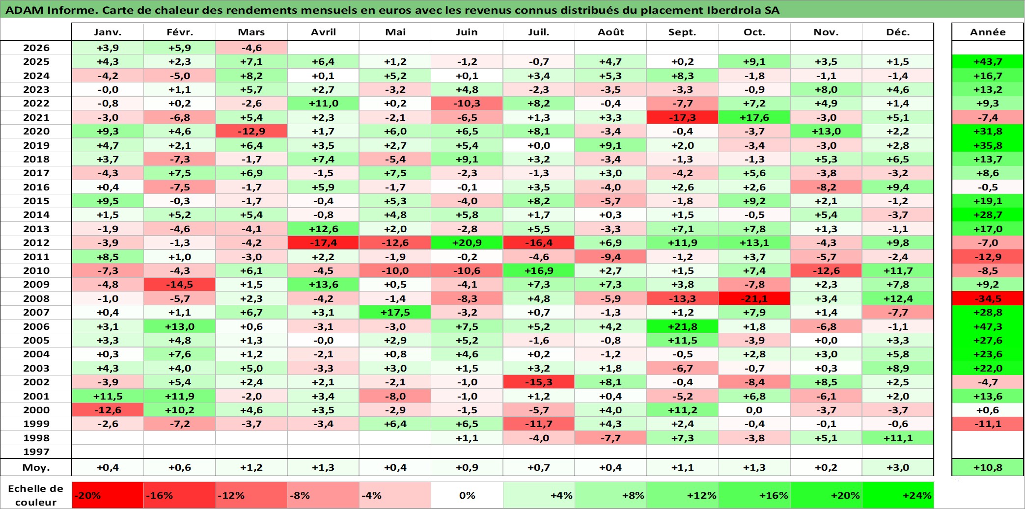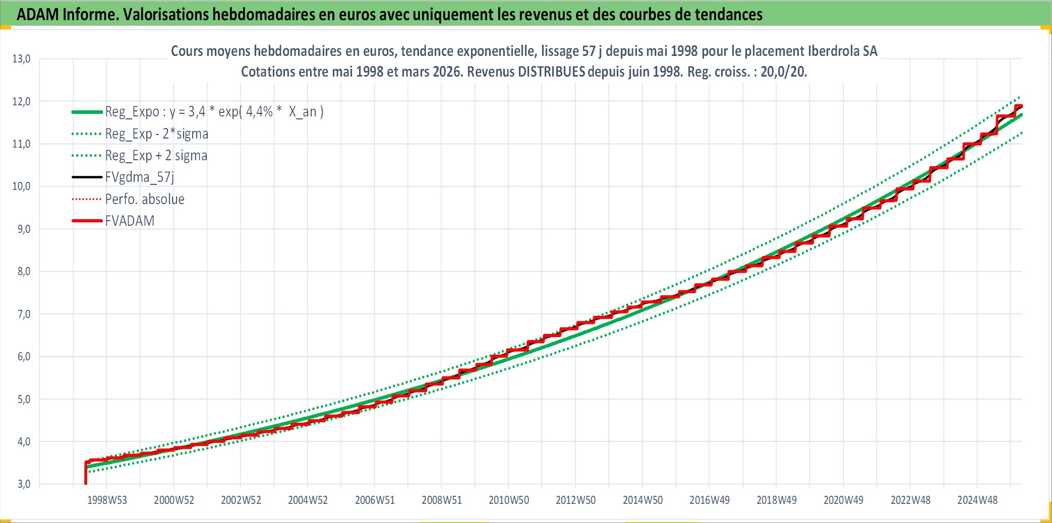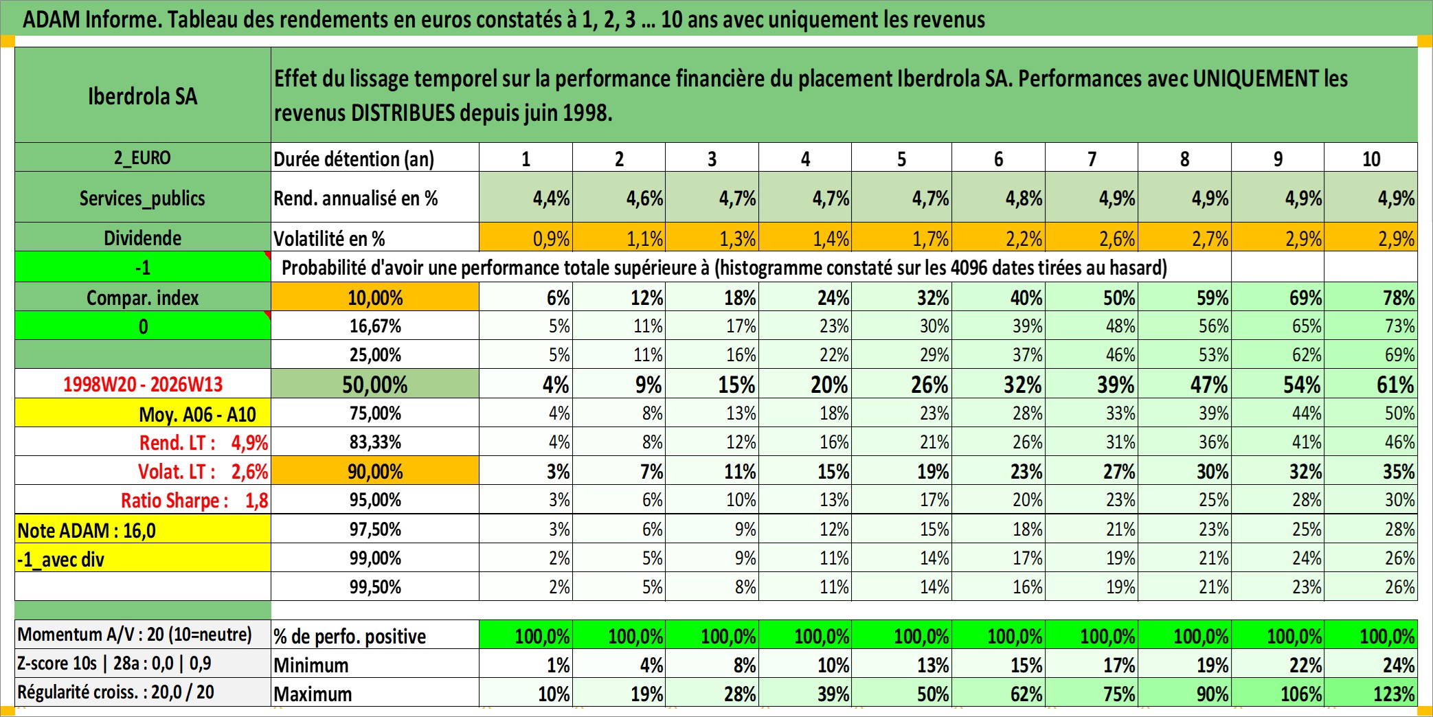 Site dédié aux investisseursPage dédiée sur site financeAnalyse des valorisations hebdomadaires de l'action Iberdrola SA. Cet actif est cote en EUR. Les valorisations couvrent les semaines 1998W20 a 2026W13. Les revenus de cet actif financier sont pris en compte depuis la semaine 1998W27. La note globale ESG de cet actif est estimee a 10.0 (apres rebasage entre 0 et 20).