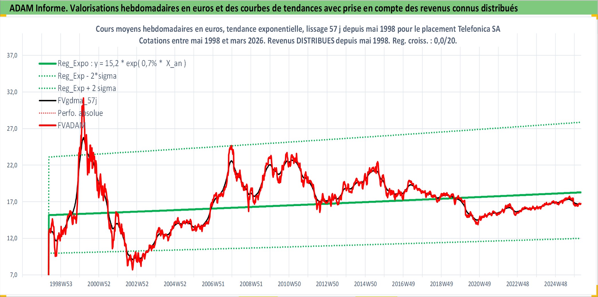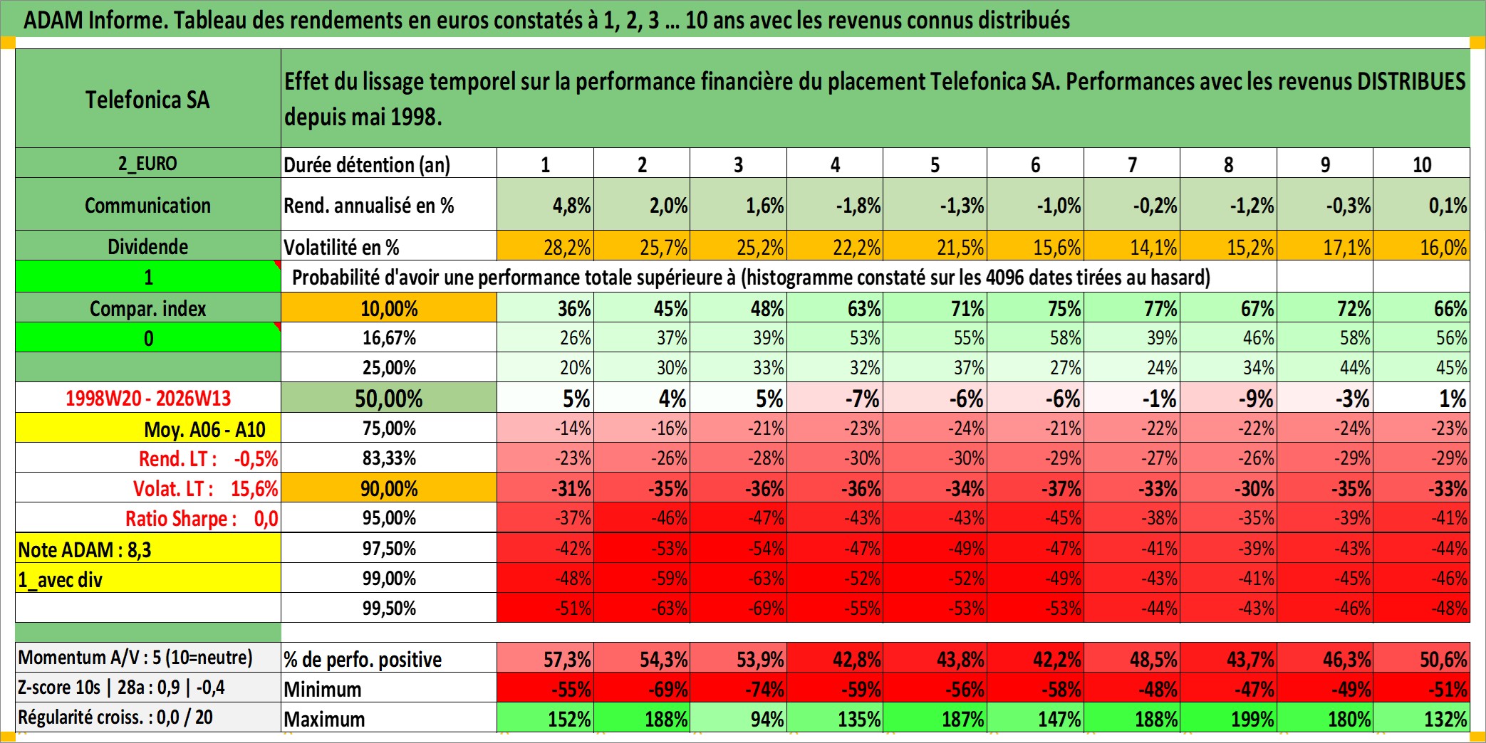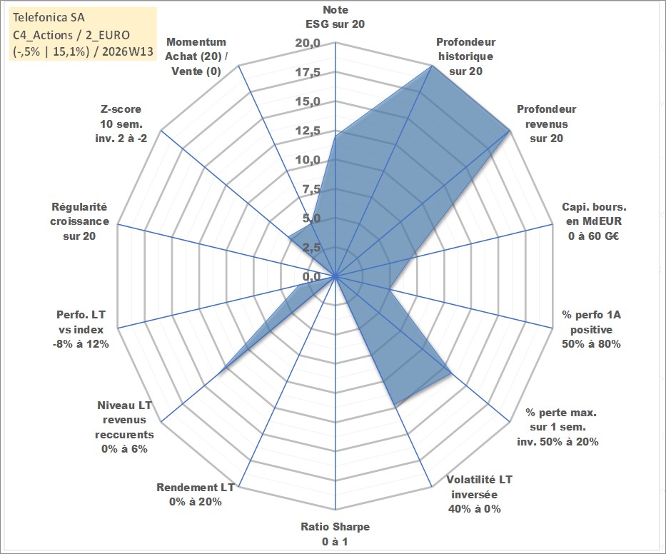 Site dédié aux investisseursPage dédiée sur site financeAnalyse des valorisations hebdomadaires de l'action Telefonica SA. Cet actif est cote en EUR. Les valorisations couvrent les semaines 1998W20 a 2026W13. Les revenus de cet actif financier sont pris en compte depuis la semaine 1998W21. La note globale ESG de cet actif est estimee a 12.0 (apres rebasage entre 0 et 20).