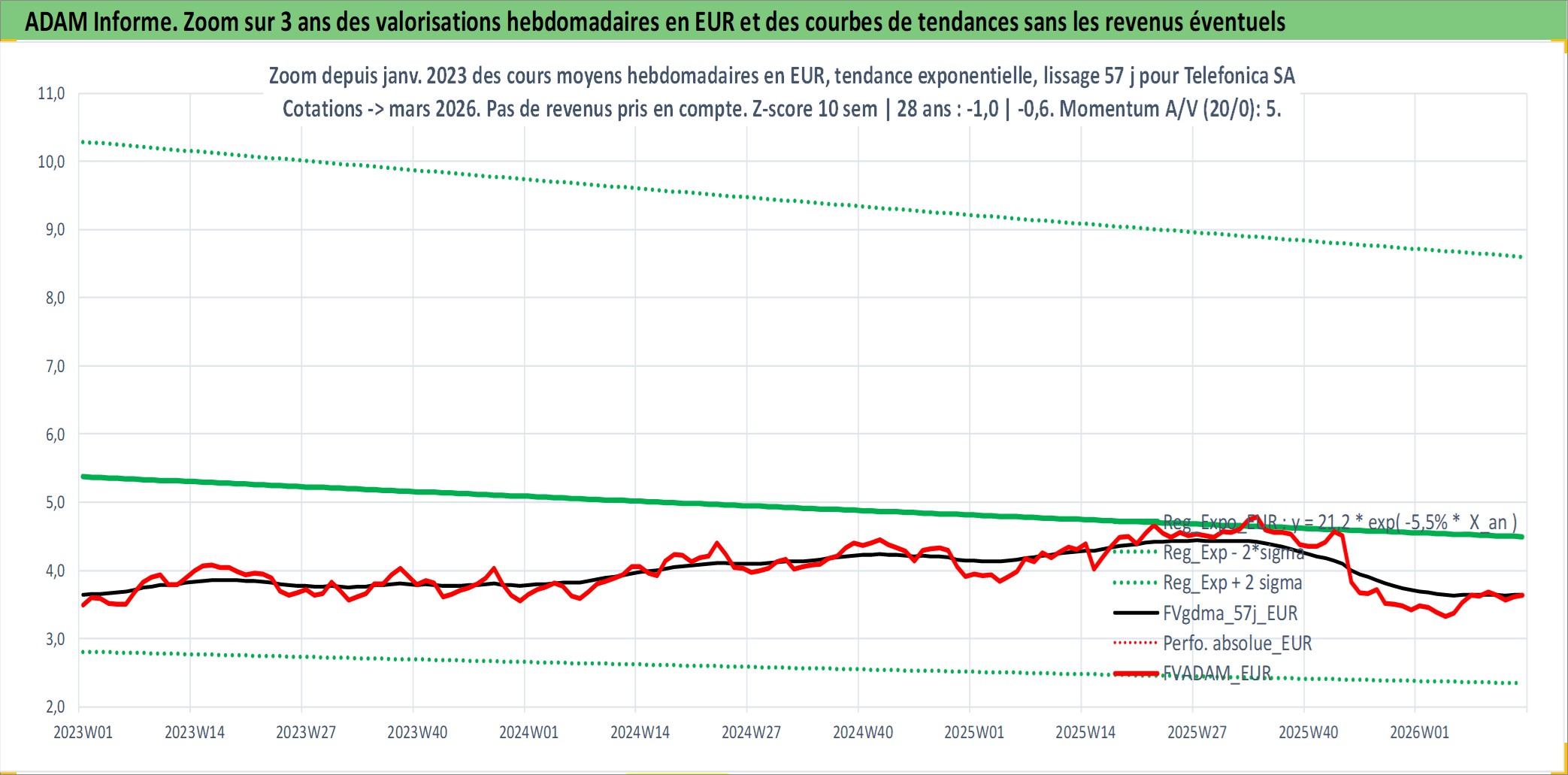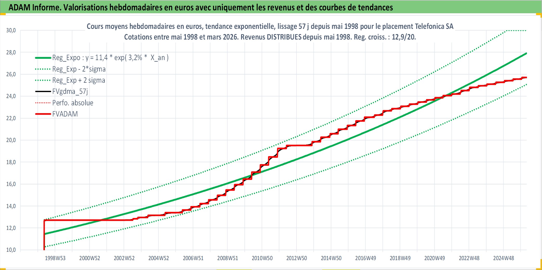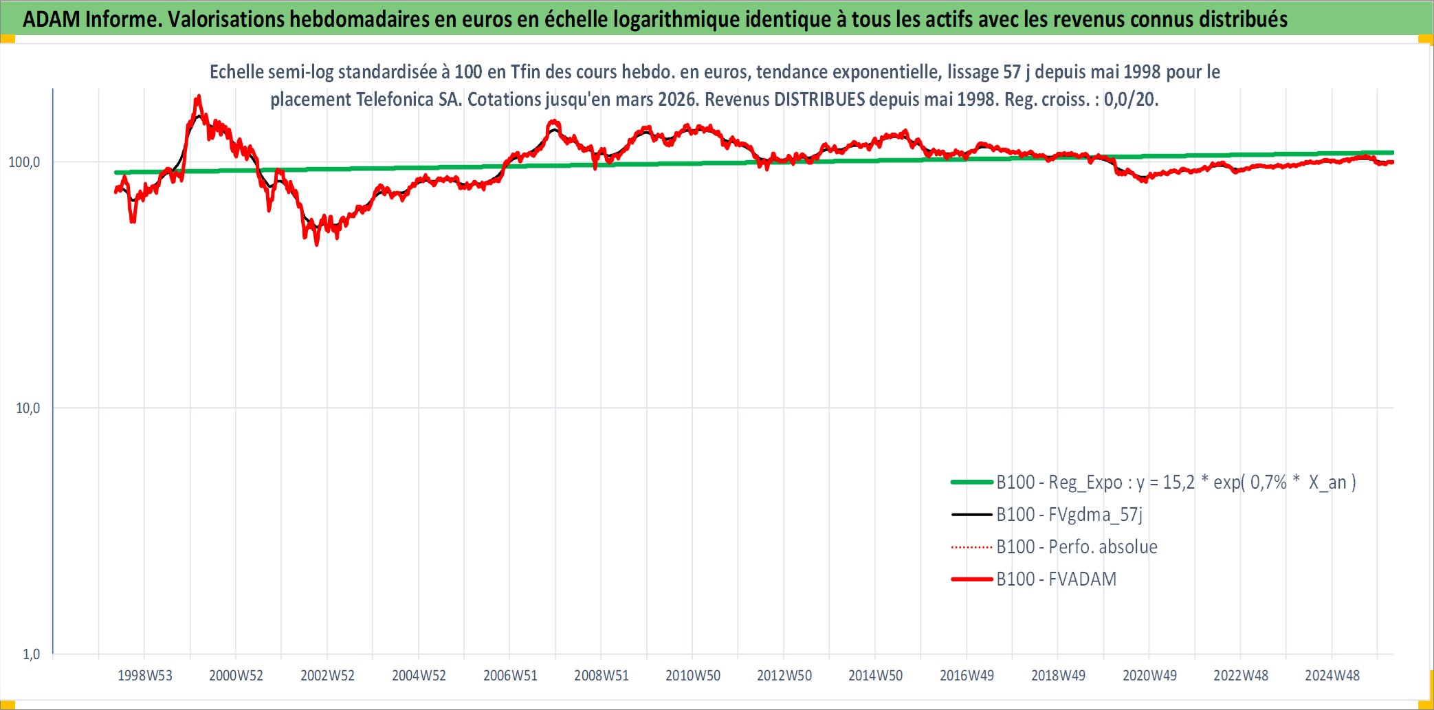 Site dédié aux investisseursPage dédiée sur site financeAnalyse des valorisations hebdomadaires de l'action Telefonica SA. Cet actif est cote en EUR. Les valorisations couvrent les semaines 1998W20 a 2026W13. Les revenus de cet actif financier sont pris en compte depuis la semaine 1998W21. La note globale ESG de cet actif est estimee a 12.0 (apres rebasage entre 0 et 20).