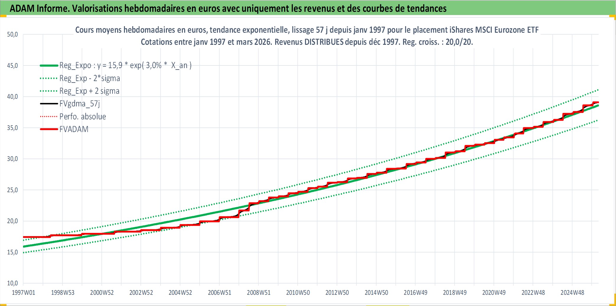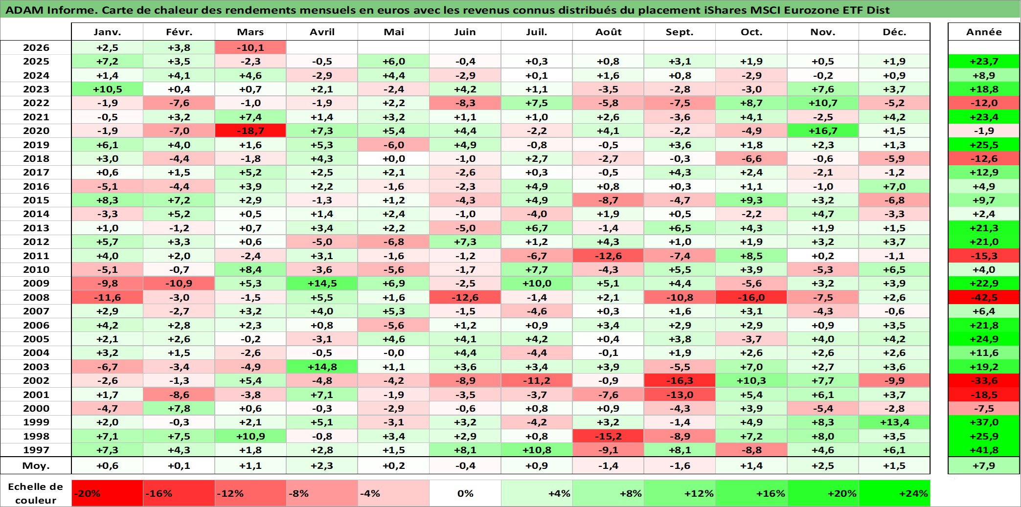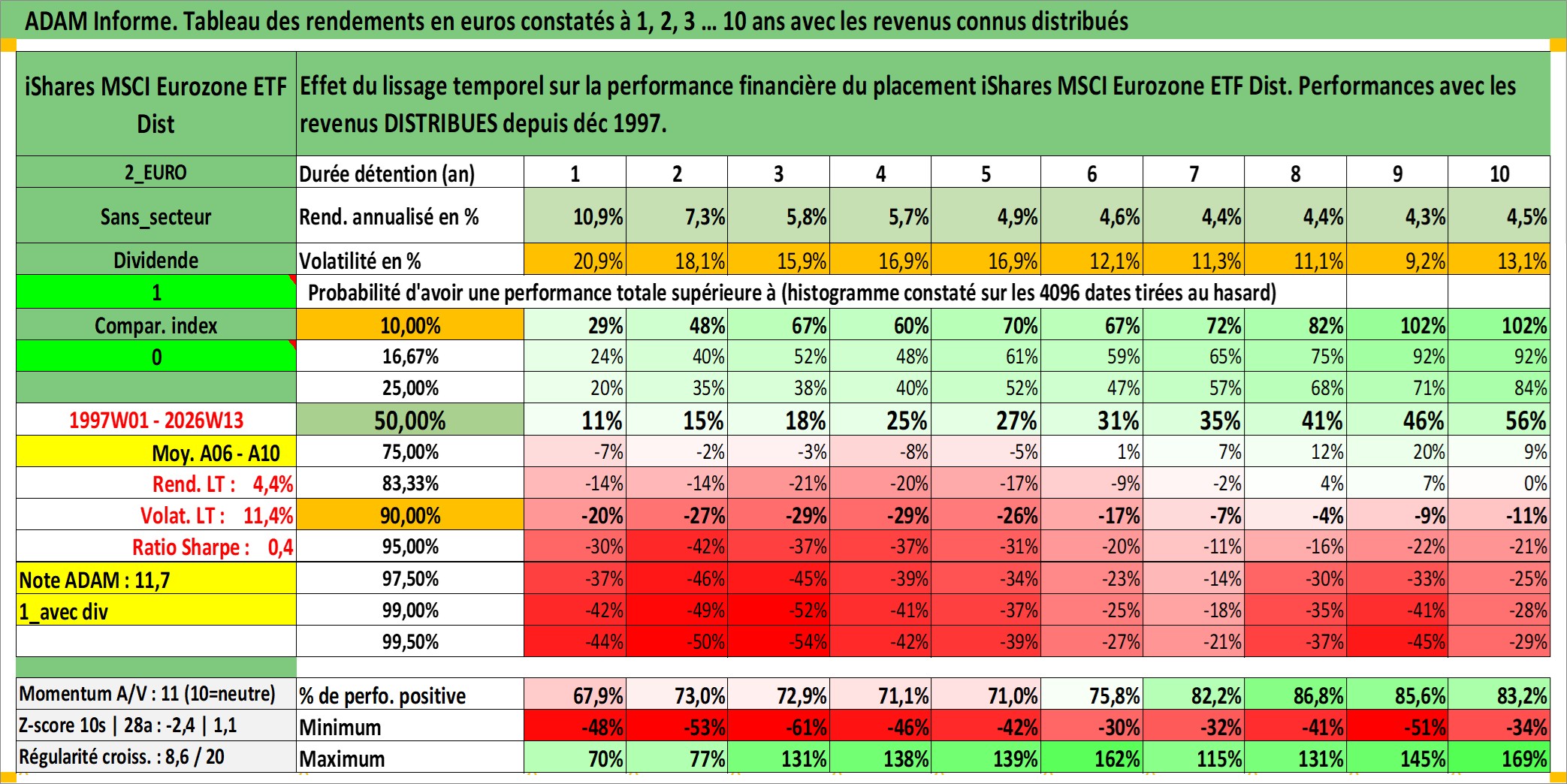 Site dédié aux investisseursPage dédiée sur site financeAnalyse des valorisations hebdomadaires du fonds iShares MSCI Eurozone ETF Dist. Cet actif est cote en USD. Les valorisations sont en contrevaleur EURO et couvrent les semaines 1997W01 a 2026W13. Les revenus de cet actif financier sont pris en compte depuis la semaine 1997W51. La note ESG de cet actif n'est pas connue.