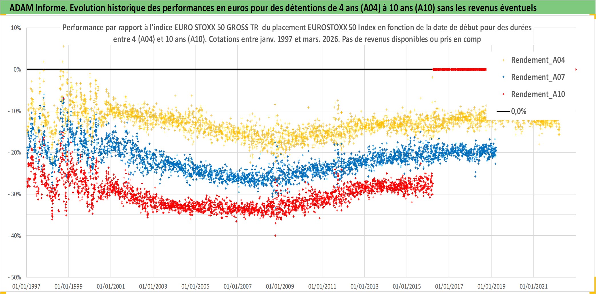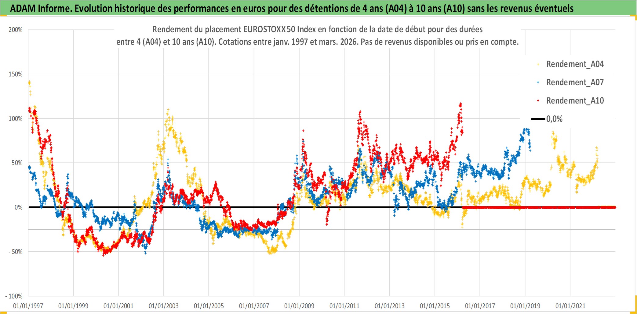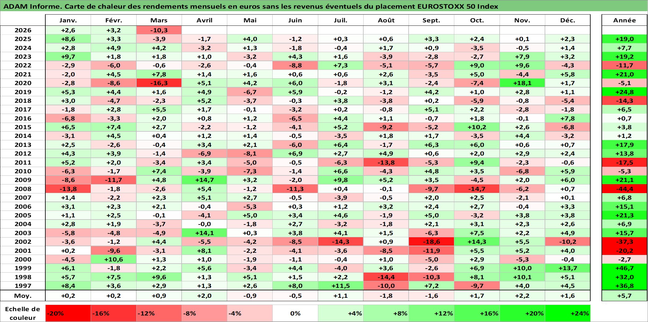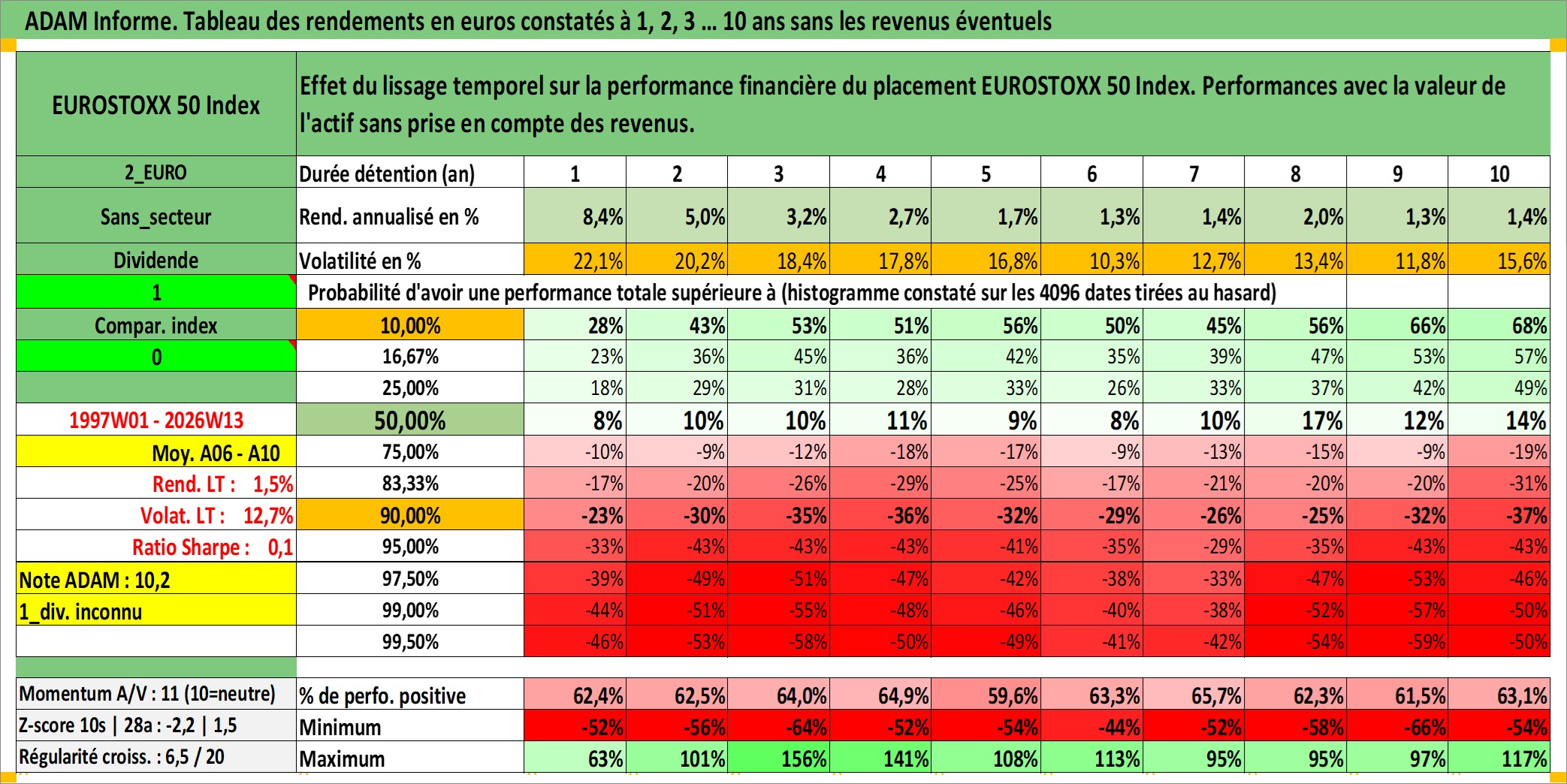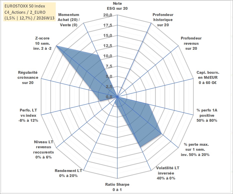 Site dédié aux investisseursPage dédiée sur site financeAnalyse des valorisations hebdomadaires de l'actif EUROSTOXX 50 Index. Cet actif est cote en EUR. Les valorisations couvrent les semaines 1997W01 a 2026W13. Les revenus de cet actif financier ne sont pas connus car non existants ou non disponibles sur le site Yahoo Finance. La note ESG de cet actif n'est pas connue.