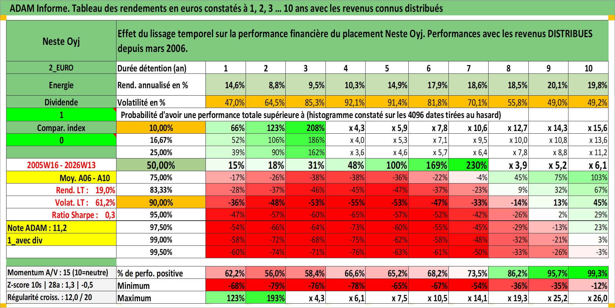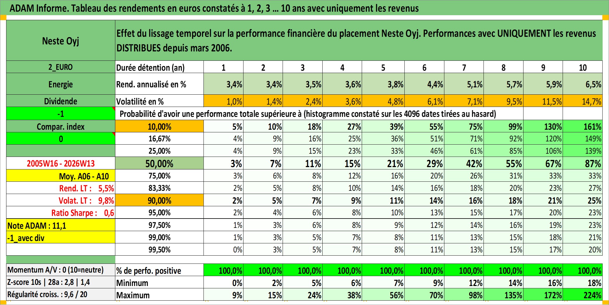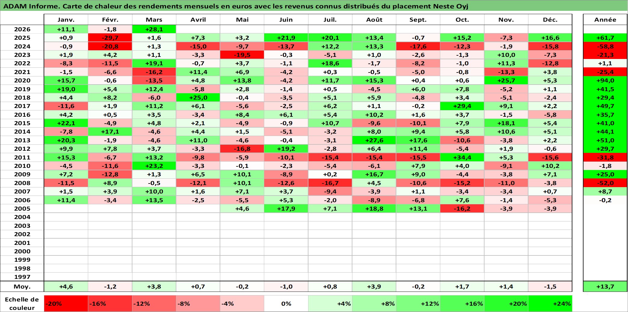 Site dédié aux investisseursPage dédiée sur site financeAnalyse des valorisations hebdomadaires de l'action Neste Oyj. Cet actif est cote en EUR. Les valorisations couvrent les semaines 2005W16 a 2026W13. Les revenus de cet actif financier sont pris en compte depuis la semaine 2006W12. La note globale ESG de cet actif est estimee a 10.0 (apres rebasage entre 0 et 20).