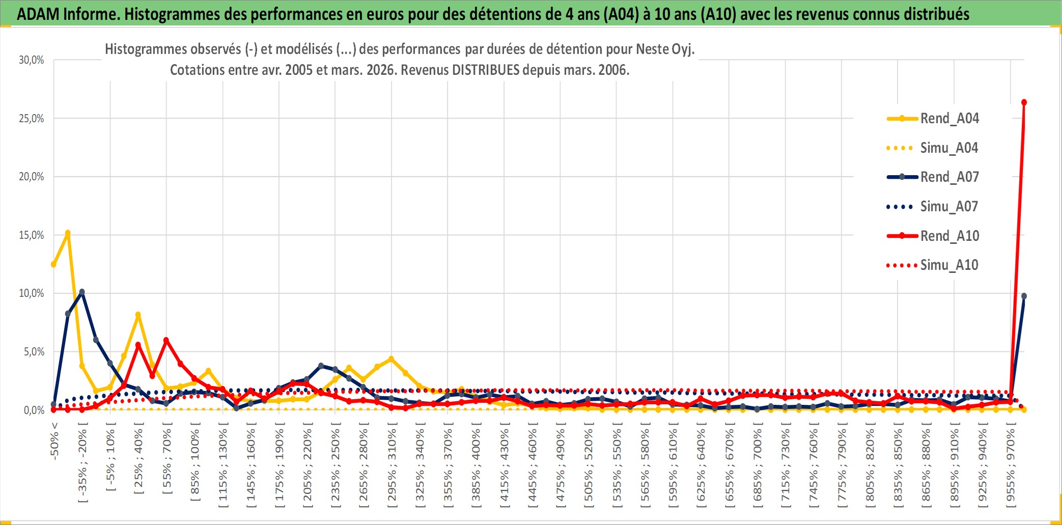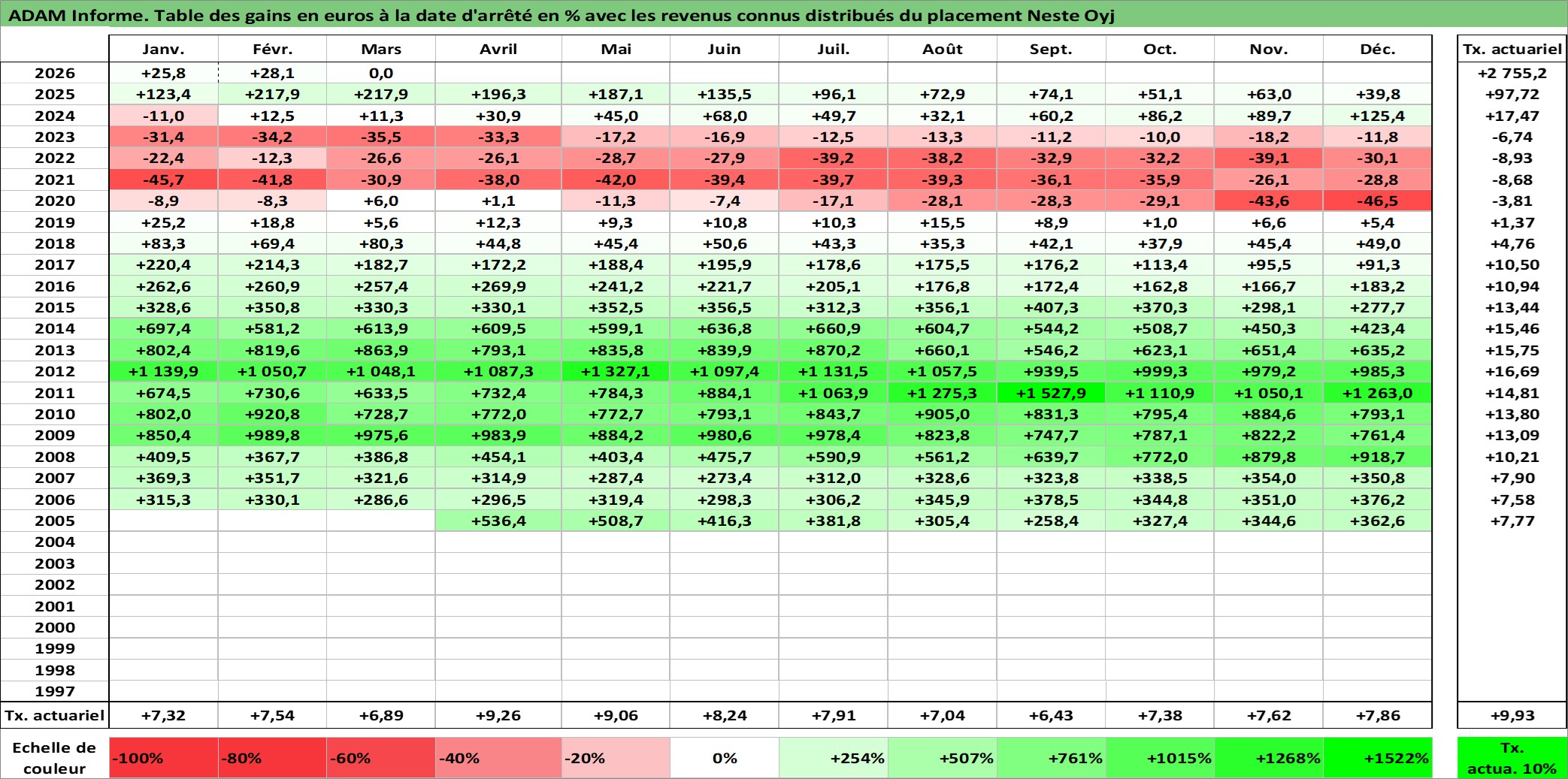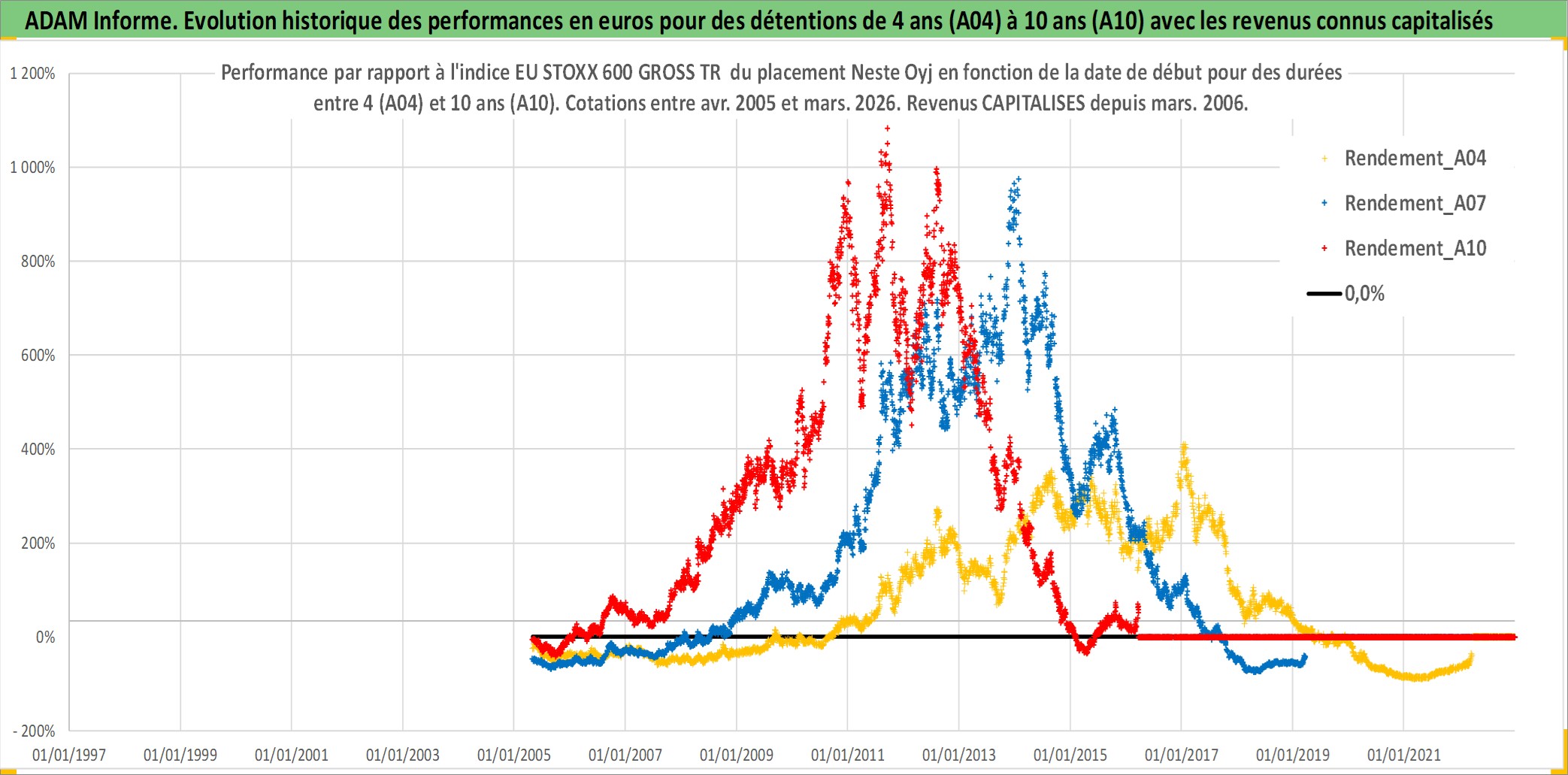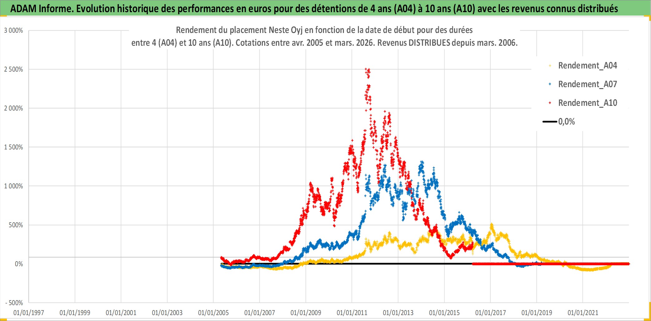 Site dédié aux investisseursPage dédiée sur site financeAnalyse des valorisations hebdomadaires de l'action Neste Oyj. Cet actif est cote en EUR. Les valorisations couvrent les semaines 2005W16 a 2026W13. Les revenus de cet actif financier sont pris en compte depuis la semaine 2006W12. La note globale ESG de cet actif est estimee a 10.0 (apres rebasage entre 0 et 20).