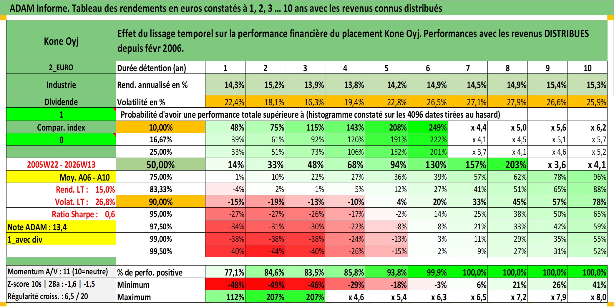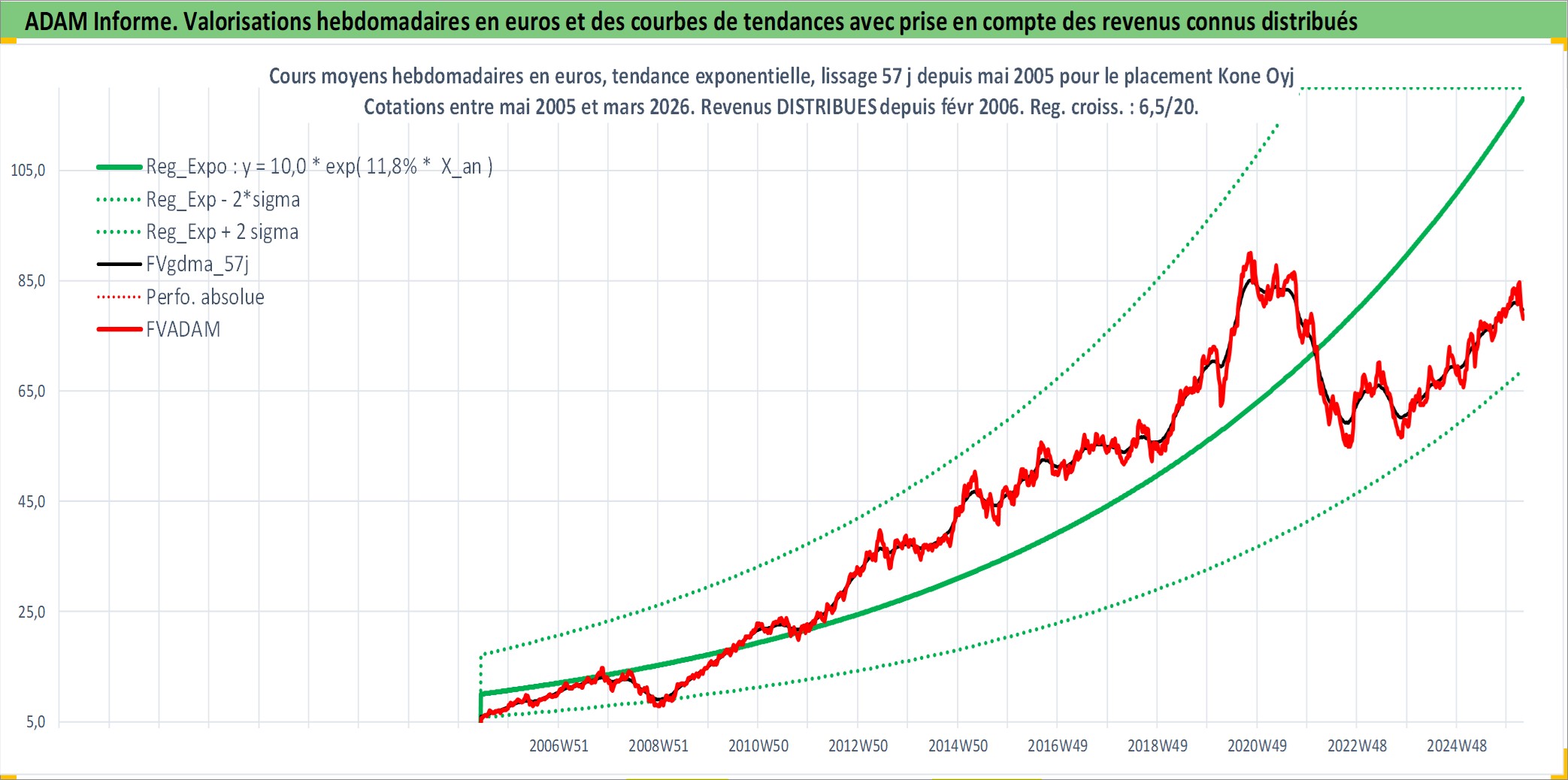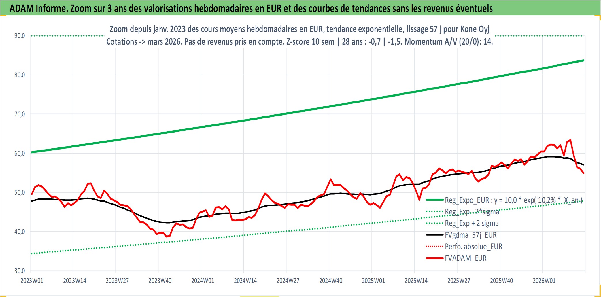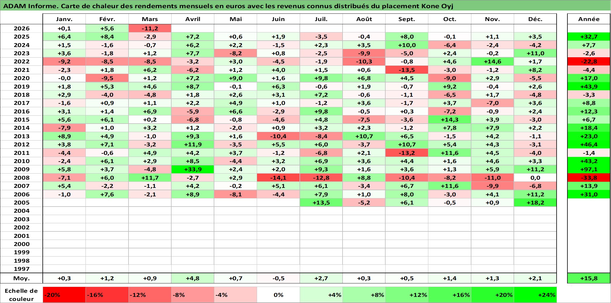 Site dédié aux investisseursPage dédiée sur site financeAnalyse des valorisations hebdomadaires de l'action Kone Oyj. Cet actif est cote en EUR. Les valorisations couvrent les semaines 2005W22 a 2026W13. Les revenus de cet actif financier sont pris en compte depuis la semaine 2006W09. La note globale ESG de cet actif est estimee a 11.0 (apres rebasage entre 0 et 20).
