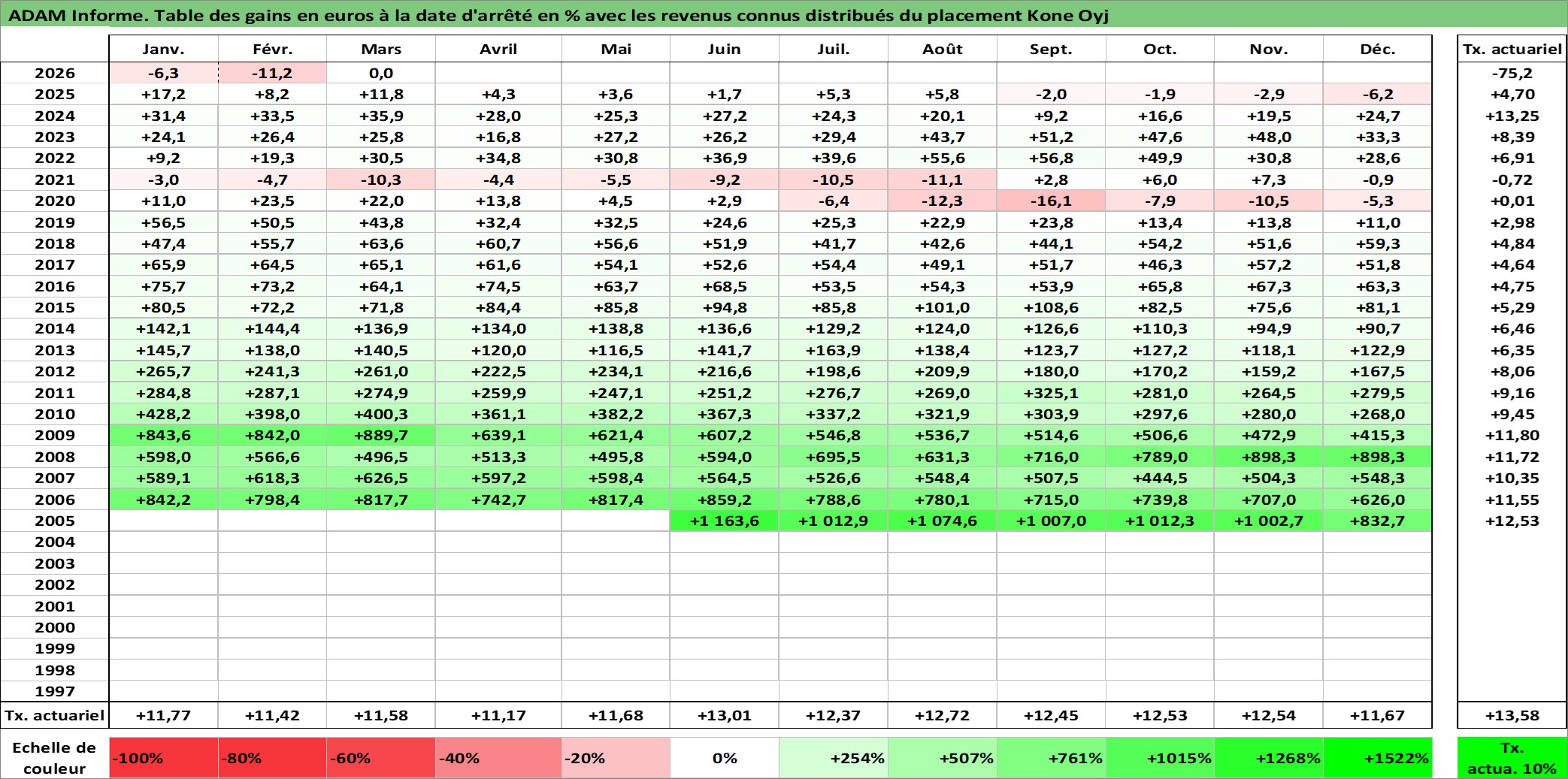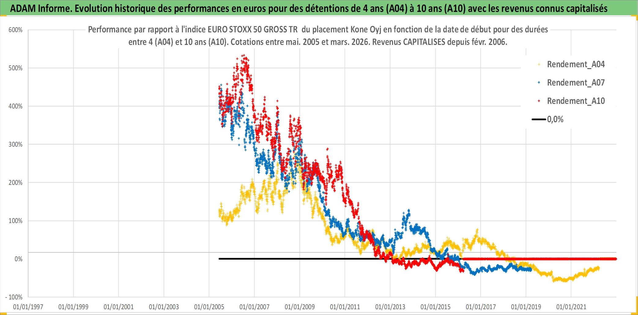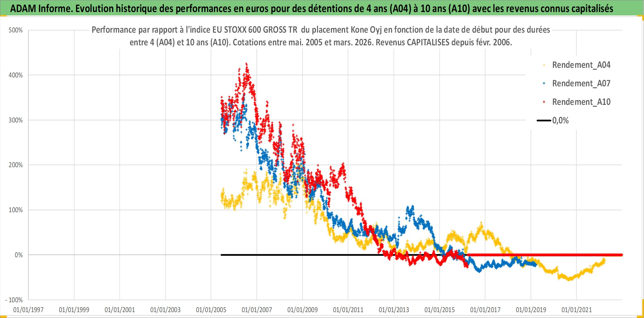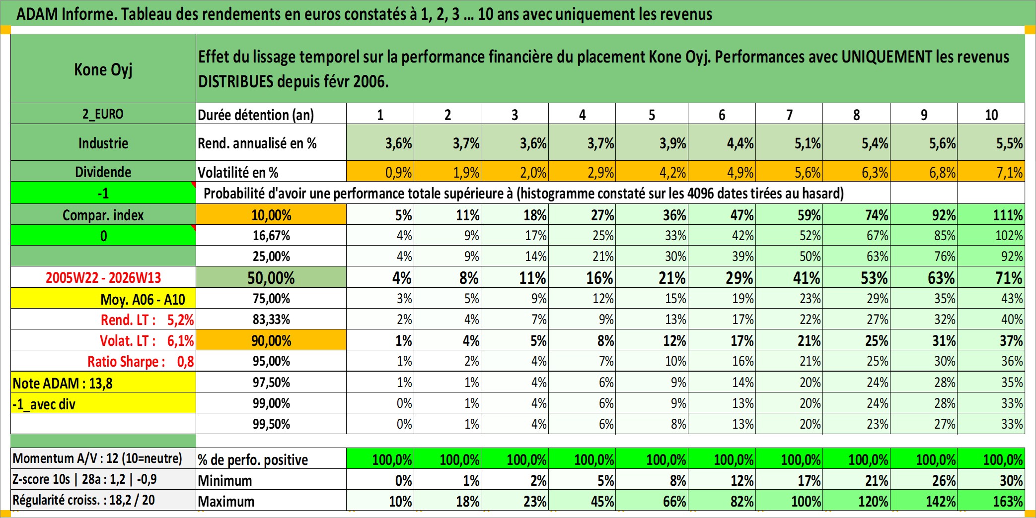 Site dédié aux investisseursPage dédiée sur site financeAnalyse des valorisations hebdomadaires de l'action Kone Oyj. Cet actif est cote en EUR. Les valorisations couvrent les semaines 2005W22 a 2026W13. Les revenus de cet actif financier sont pris en compte depuis la semaine 2006W09. La note globale ESG de cet actif est estimee a 11.0 (apres rebasage entre 0 et 20).
