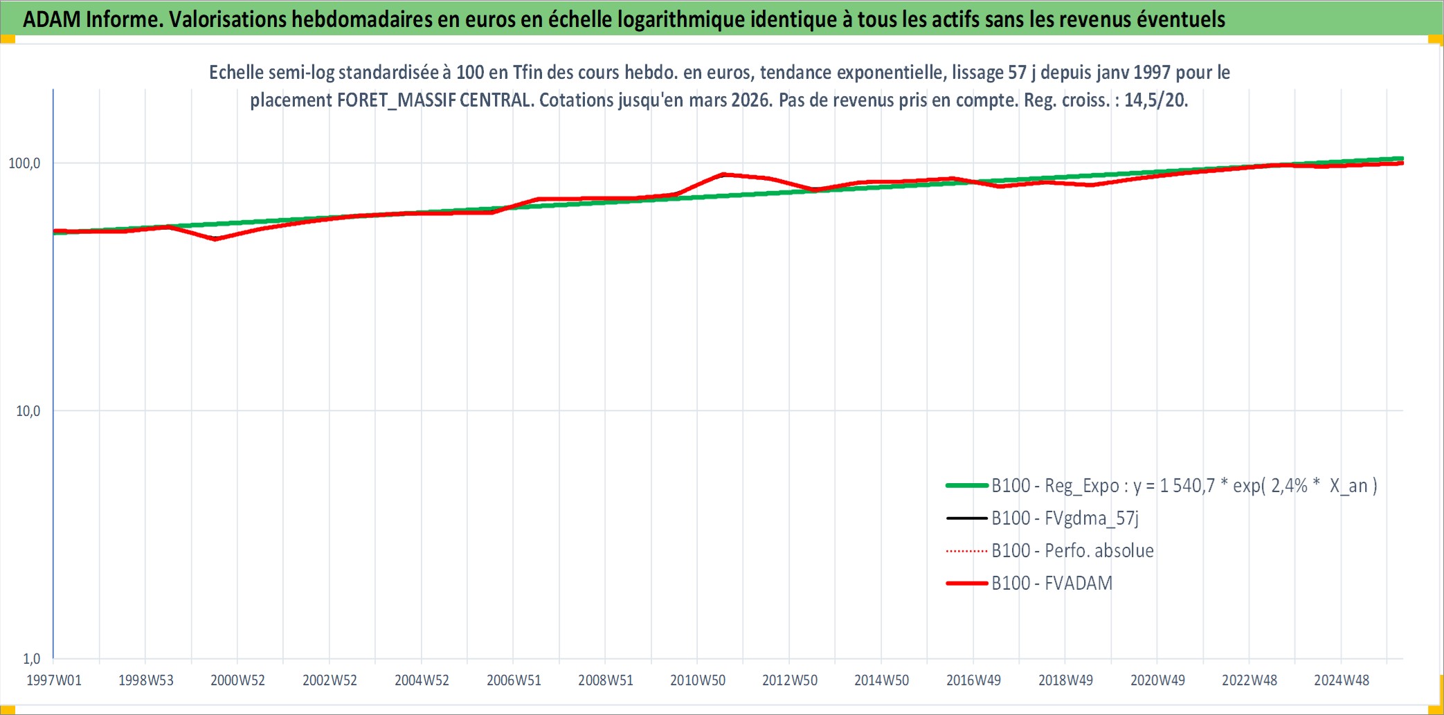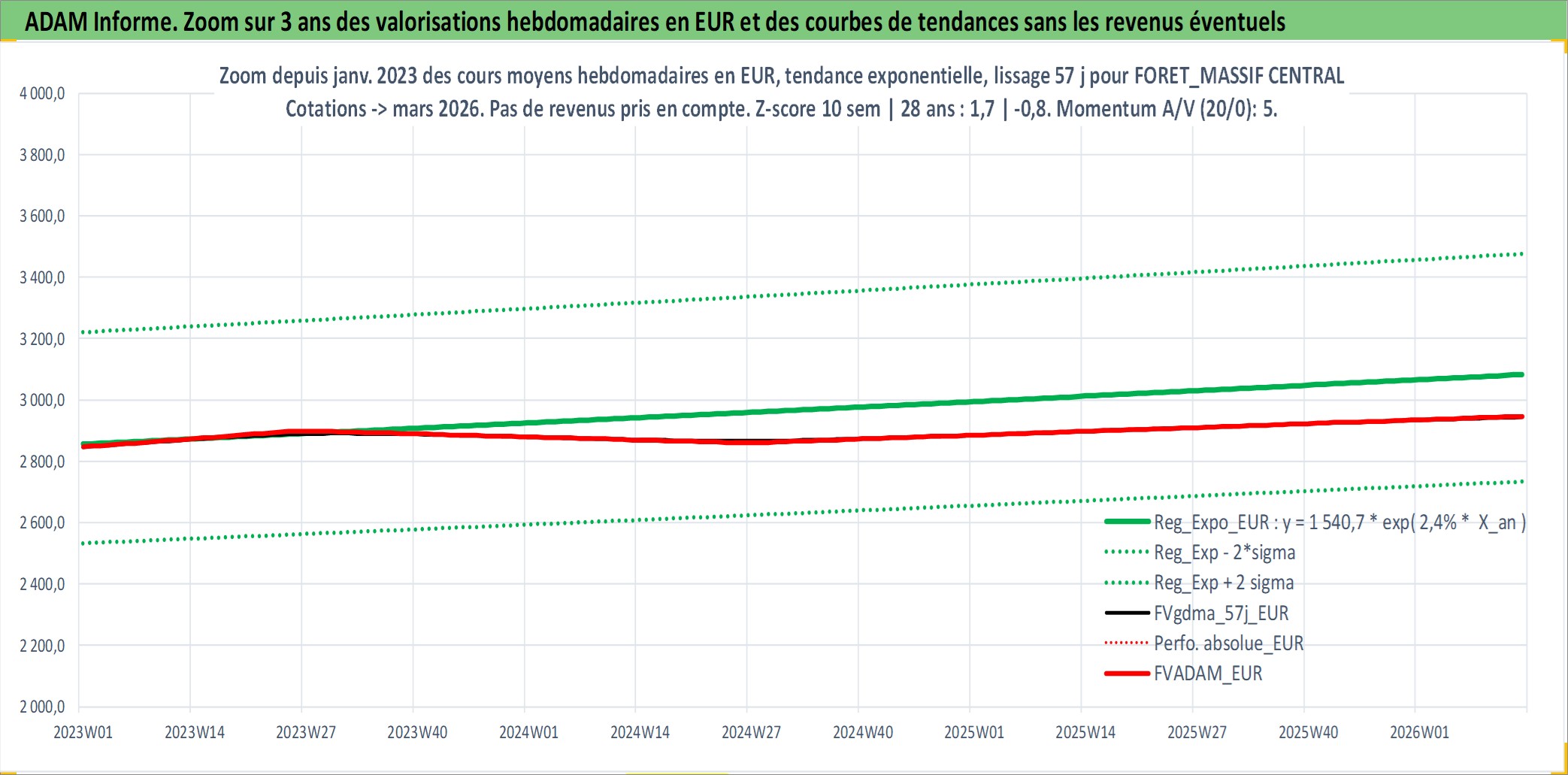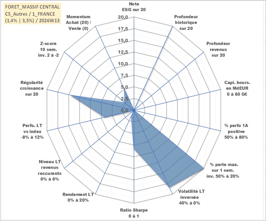 Site dédié aux investisseursPage dédiée sur site financeAnalyse des valorisations hebdomadaires de l'actif FORET_MASSIF CENTRAL. Cet actif est cote en EUR. Les valorisations couvrent les semaines 1997W01 a 2026W13. Les fermages de ce bien foncier sont pris egaux a 2,5% annuels de la valeur venale du bien.