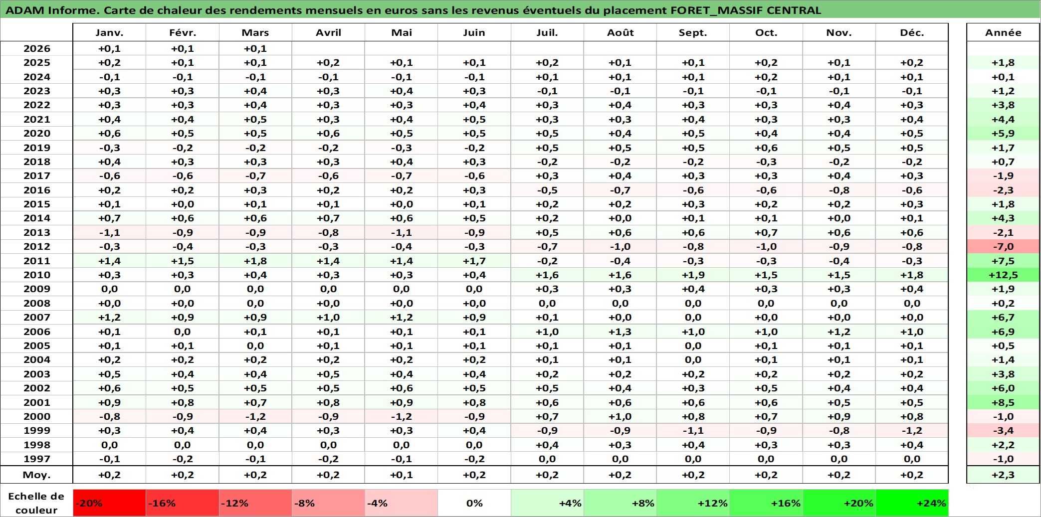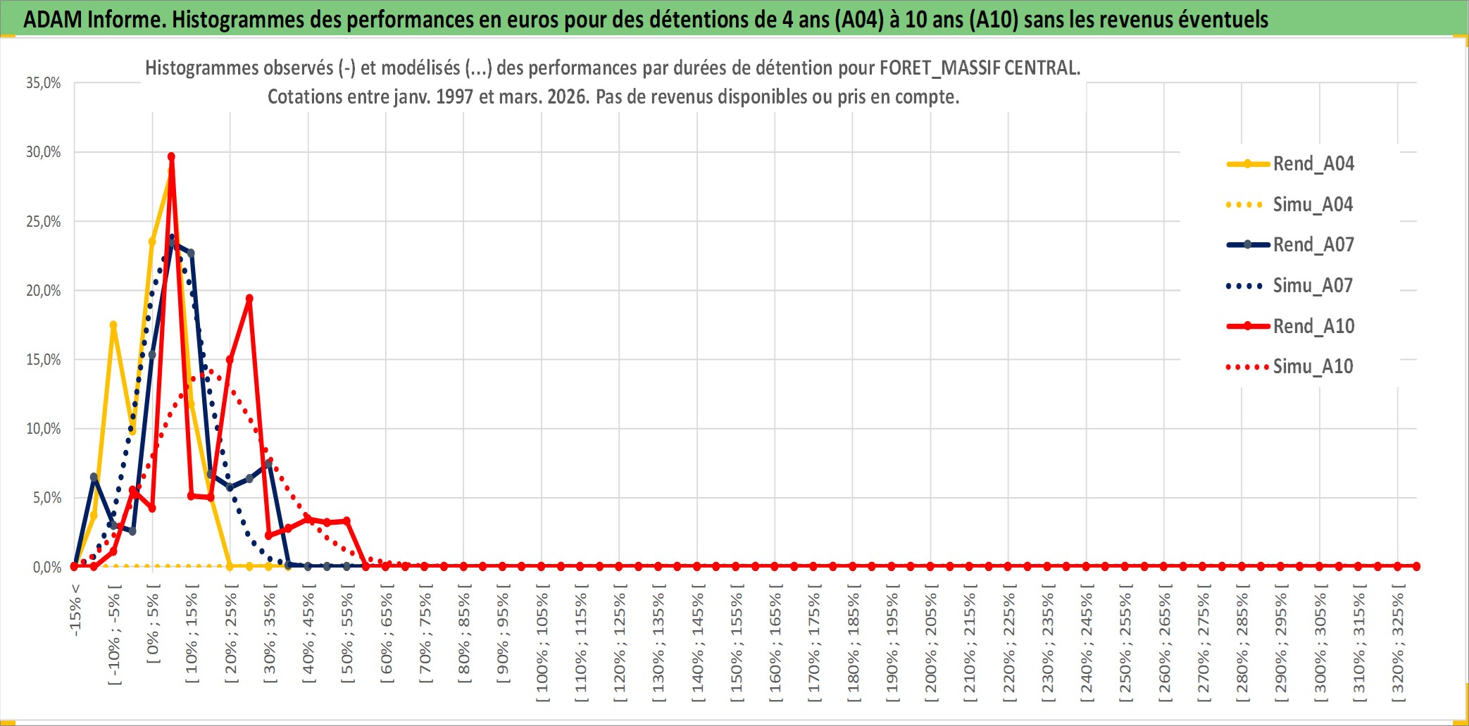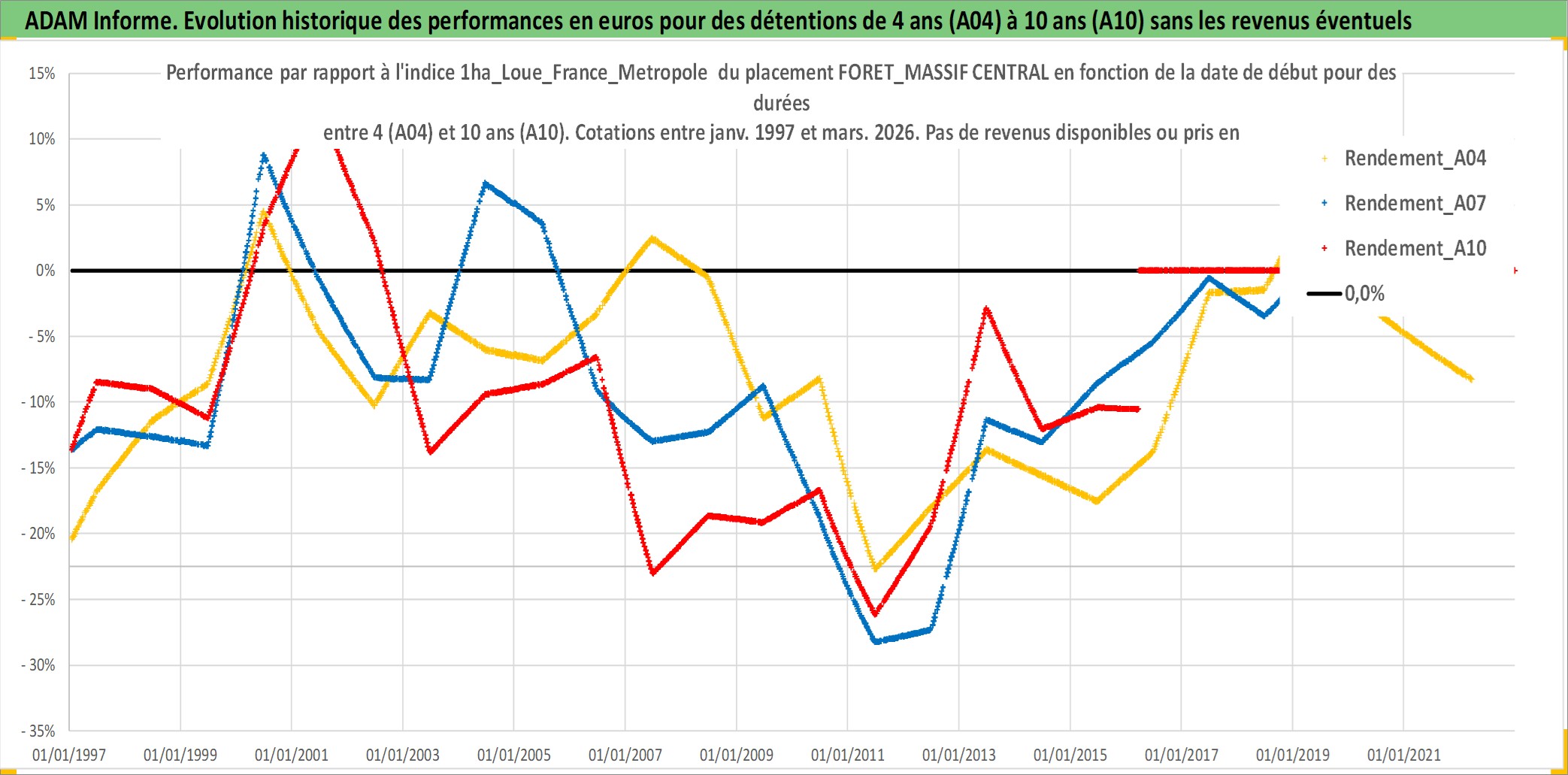 Site dédié aux investisseursPage dédiée sur site financeAnalyse des valorisations hebdomadaires de l'actif FORET_MASSIF CENTRAL. Cet actif est cote en EUR. Les valorisations couvrent les semaines 1997W01 a 2026W13. Les fermages de ce bien foncier sont pris egaux a 2,5% annuels de la valeur venale du bien.