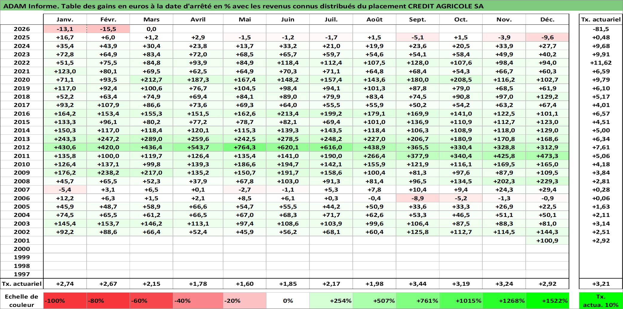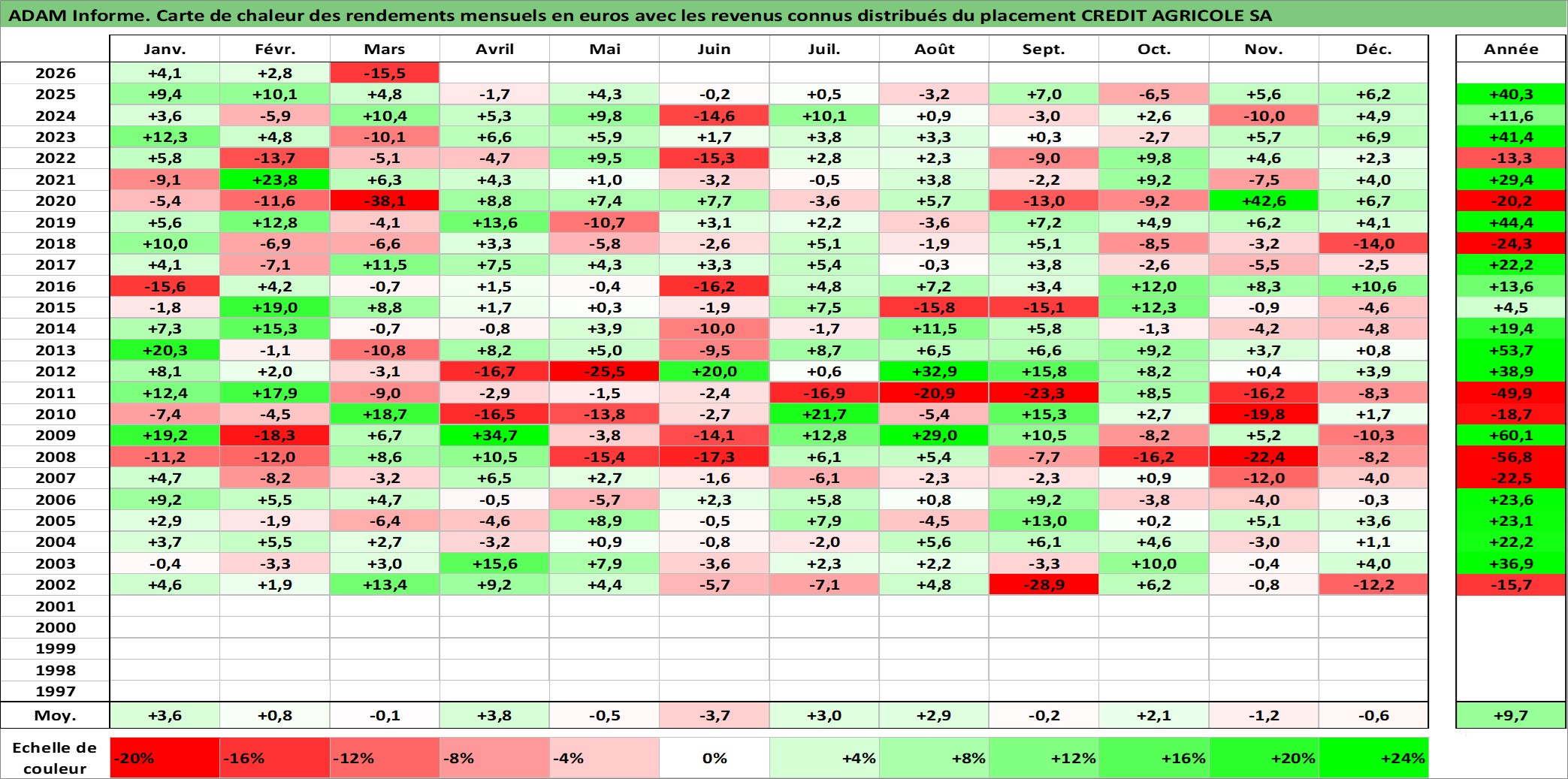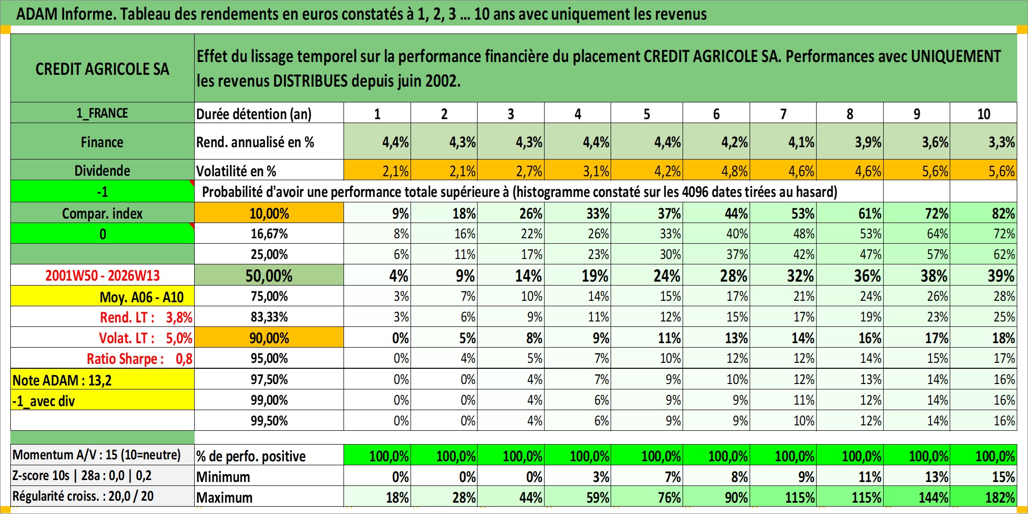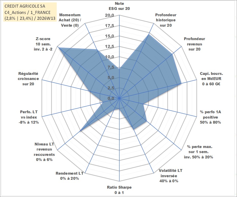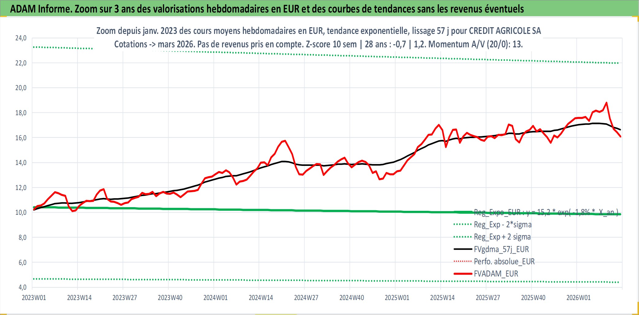 Site dédié aux investisseursPage dédiée sur site financeAnalyse des valorisations hebdomadaires de l'action CREDIT AGRICOLE SA. Cet actif est cote en EUR. Les valorisations couvrent les semaines 2001W50 a 2026W13. Les revenus de cet actif financier sont pris en compte depuis la semaine 2002W23. La note globale ESG de cet actif est estimee a 7.0 (apres rebasage entre 0 et 20).