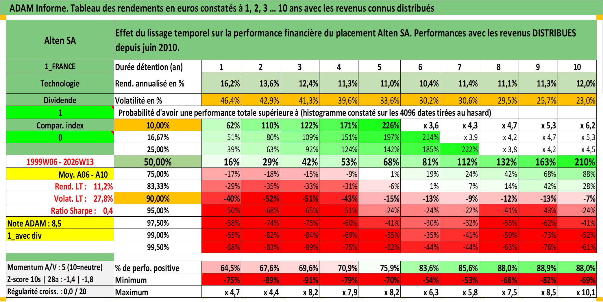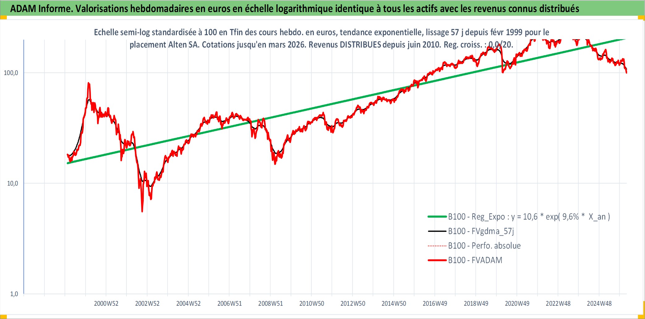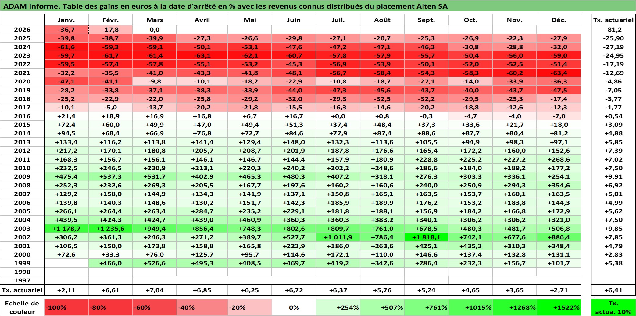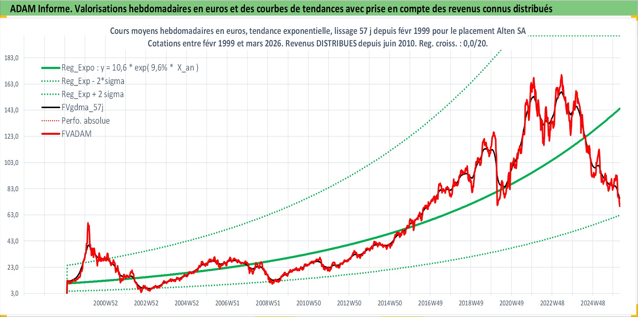 Site dédié aux investisseursPage dédiée sur site financeAnalyse des valorisations hebdomadaires de l'action Alten SA. Cet actif est cote en EUR. Les valorisations couvrent les semaines 1999W06 a 2026W13. Les revenus de cet actif financier sont pris en compte depuis la semaine 2010W25. La note ESG de cet actif n'est pas connue.