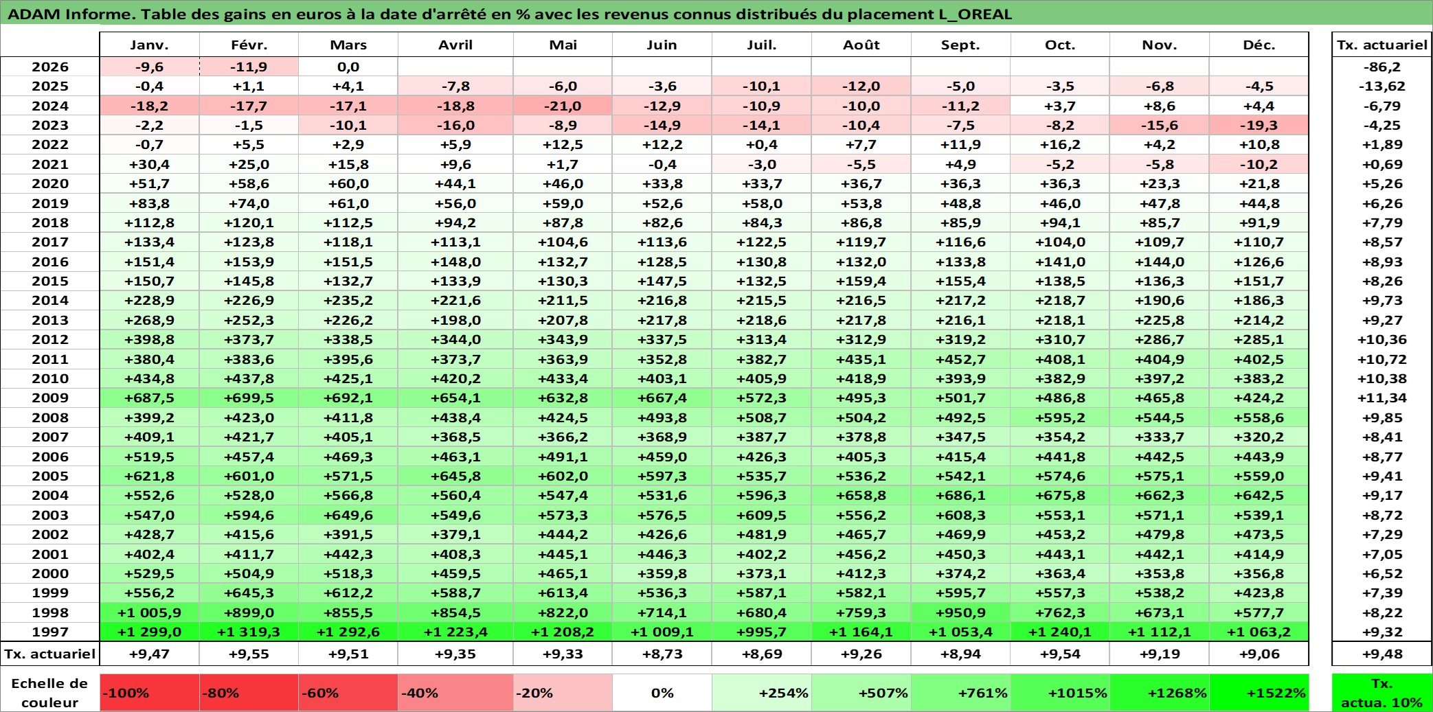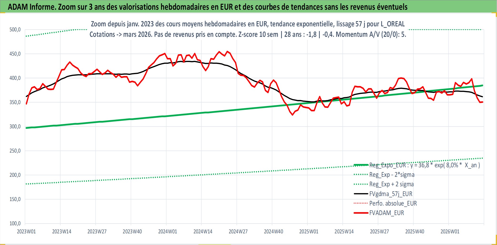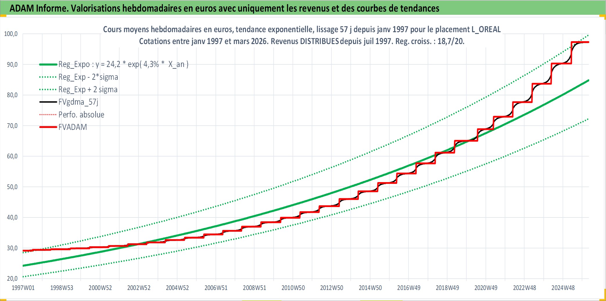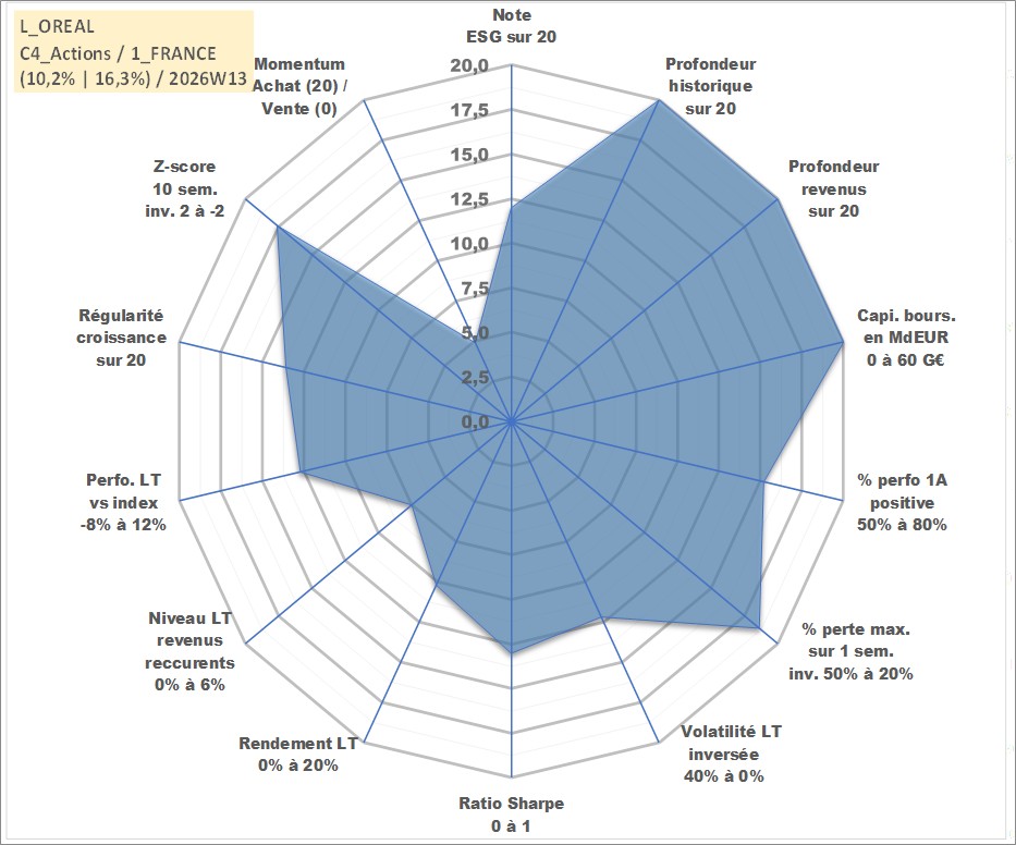 Site dédié aux investisseursPage dédiée sur site financeAnalyse des valorisations hebdomadaires de l'action L_OREAL. Cet actif est cote en EUR. Les valorisations couvrent les semaines 1997W01 a 2026W13. Les revenus de cet actif financier sont pris en compte depuis la semaine 1997W27. La note globale ESG de cet actif est estimee a 12.0 (apres rebasage entre 0 et 20).