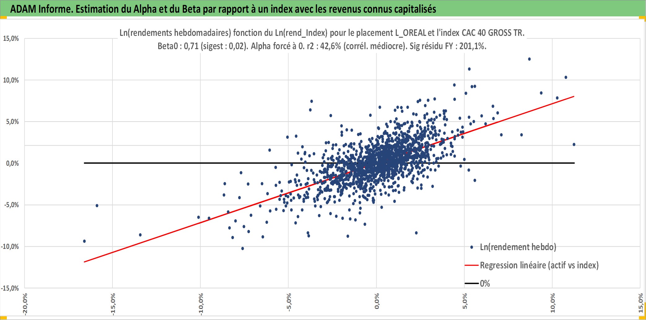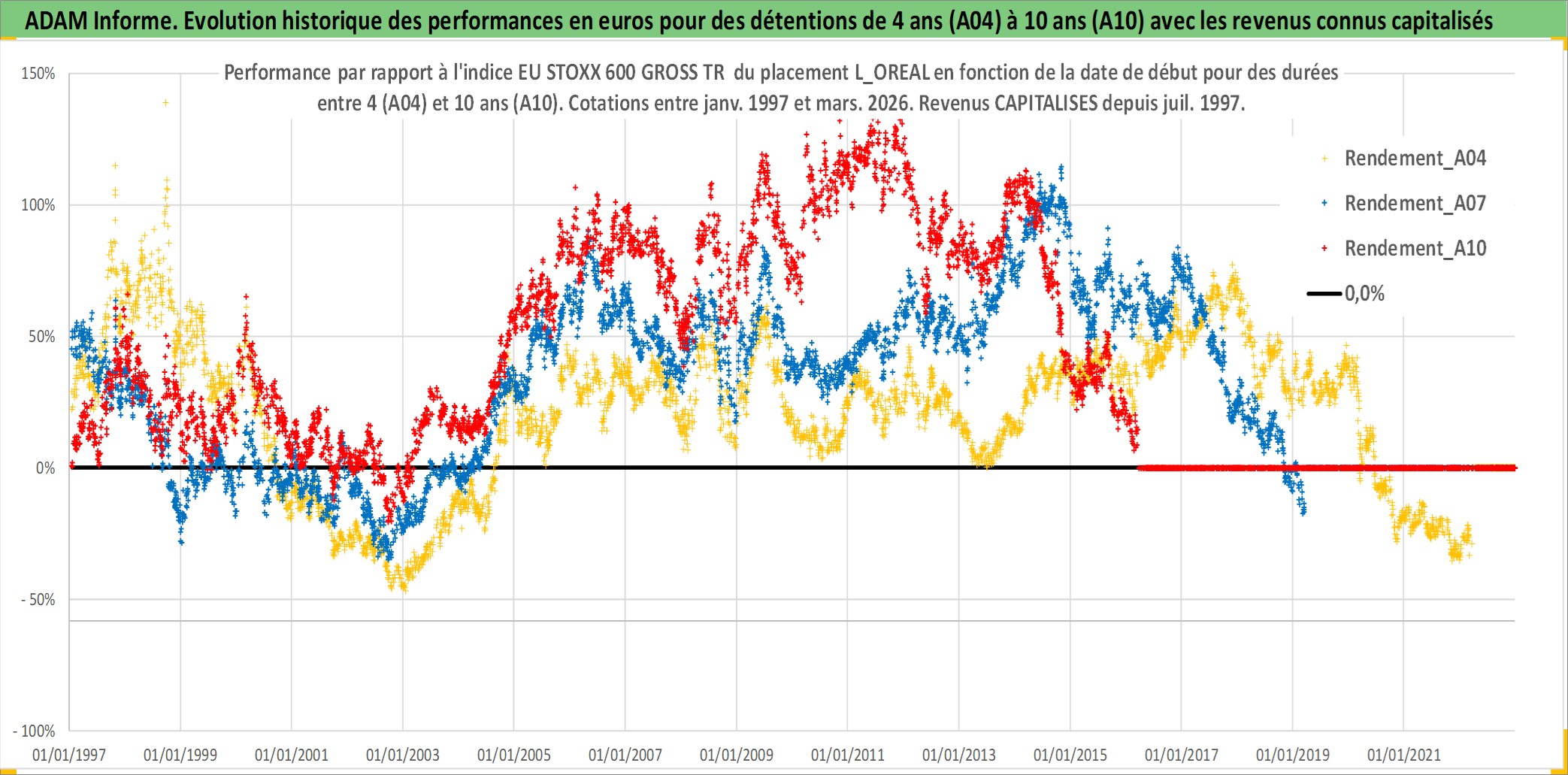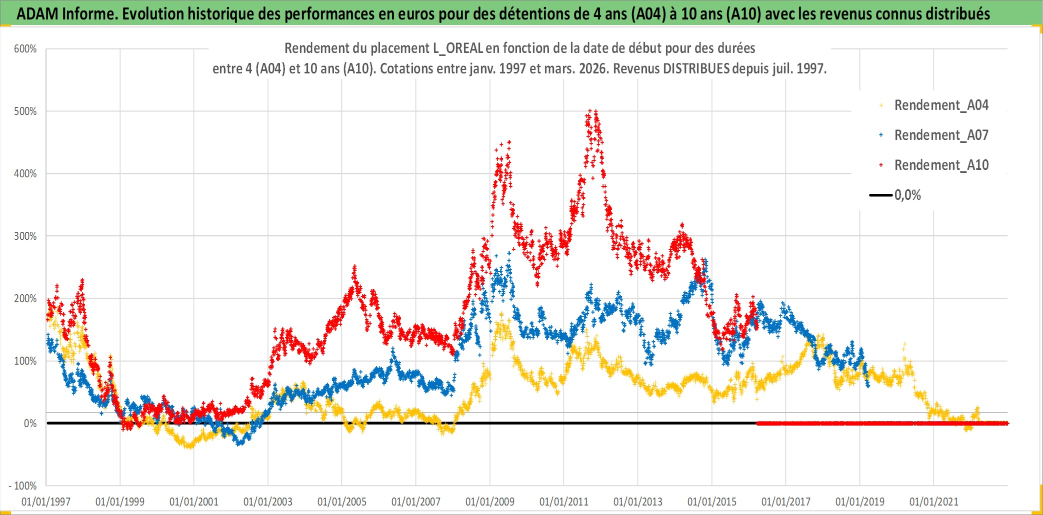 Site dédié aux investisseursPage dédiée sur site financeAnalyse des valorisations hebdomadaires de l'action L_OREAL. Cet actif est cote en EUR. Les valorisations couvrent les semaines 1997W01 a 2026W13. Les revenus de cet actif financier sont pris en compte depuis la semaine 1997W27. La note globale ESG de cet actif est estimee a 12.0 (apres rebasage entre 0 et 20).