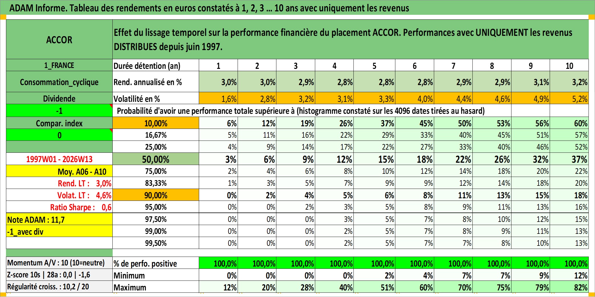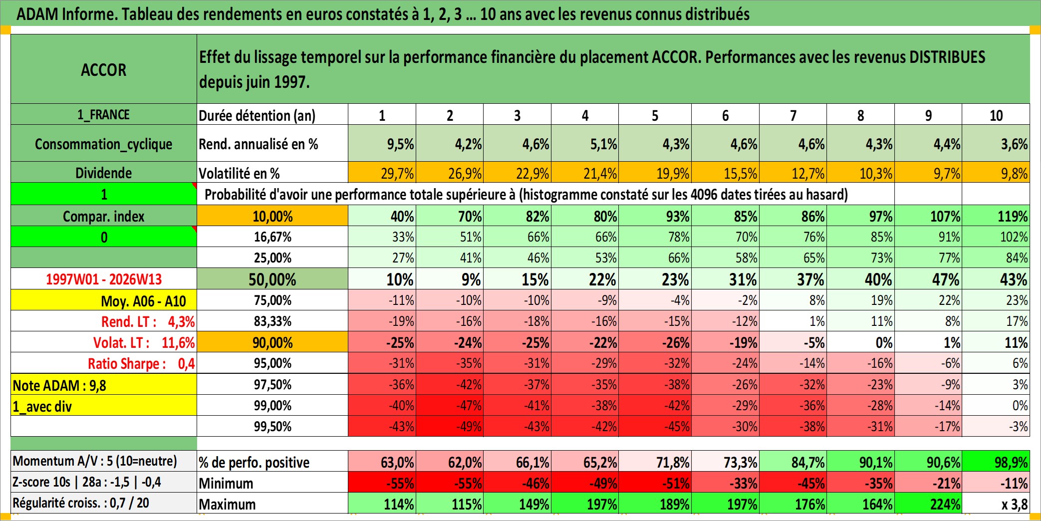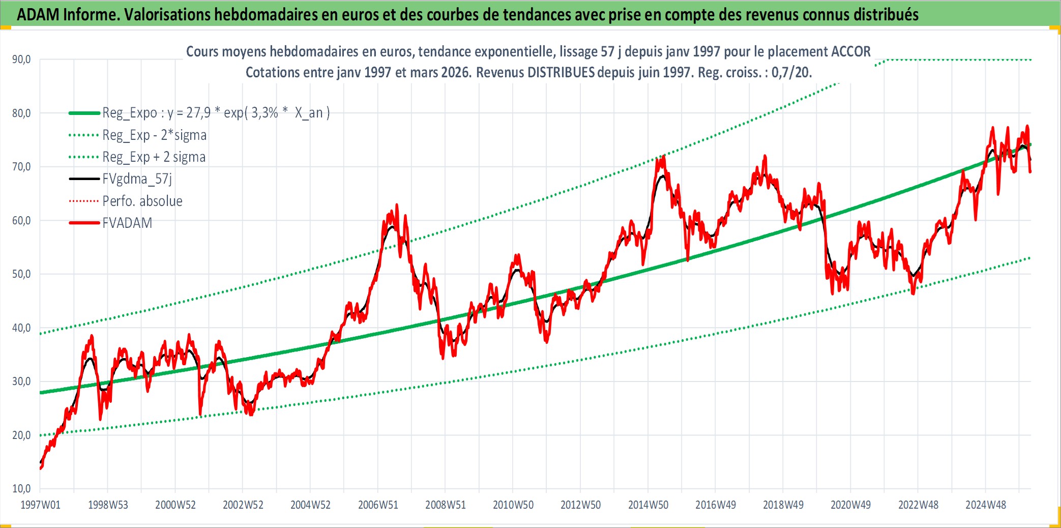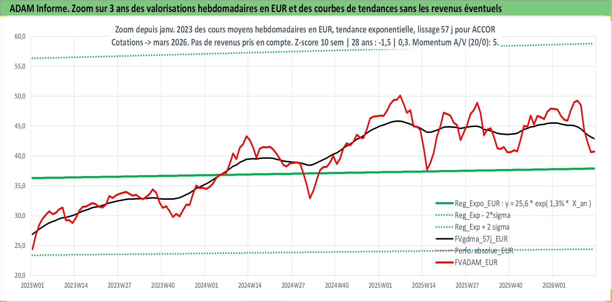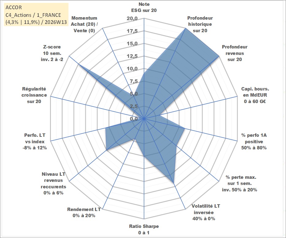 Site dédié aux investisseursPage dédiée sur site financeAnalyse des valorisations hebdomadaires de l'action ACCOR. Cet actif est cote en EUR. Les valorisations couvrent les semaines 1997W01 a 2026W13. Les revenus de cet actif financier sont pris en compte depuis la semaine 1997W24. La note globale ESG de cet actif est estimee a 9.0 (apres rebasage entre 0 et 20).