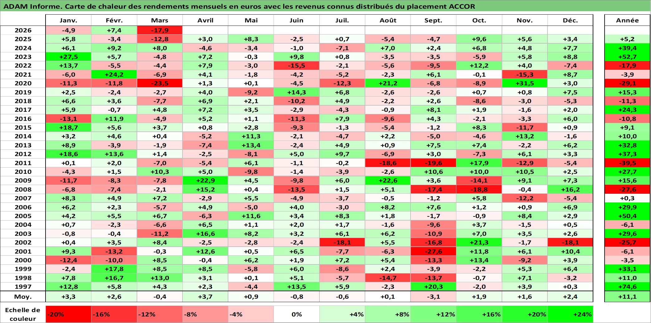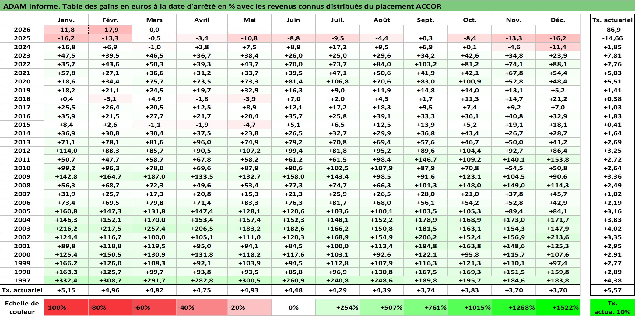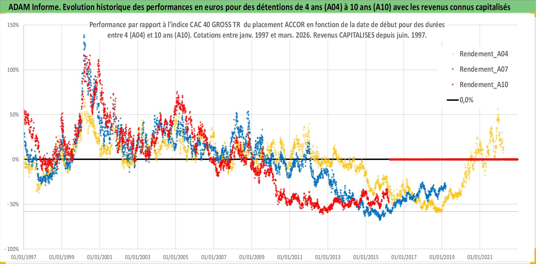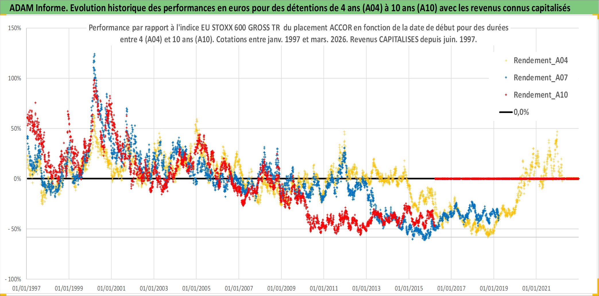 Site dédié aux investisseursPage dédiée sur site financeAnalyse des valorisations hebdomadaires de l'action ACCOR. Cet actif est cote en EUR. Les valorisations couvrent les semaines 1997W01 a 2026W13. Les revenus de cet actif financier sont pris en compte depuis la semaine 1997W24. La note globale ESG de cet actif est estimee a 9.0 (apres rebasage entre 0 et 20).