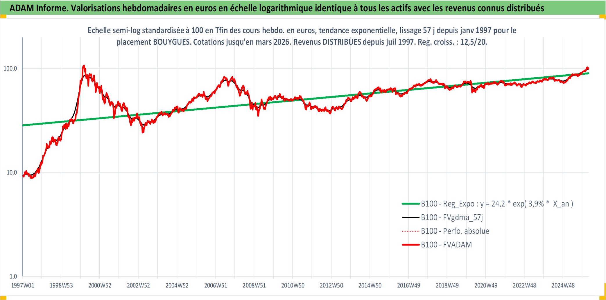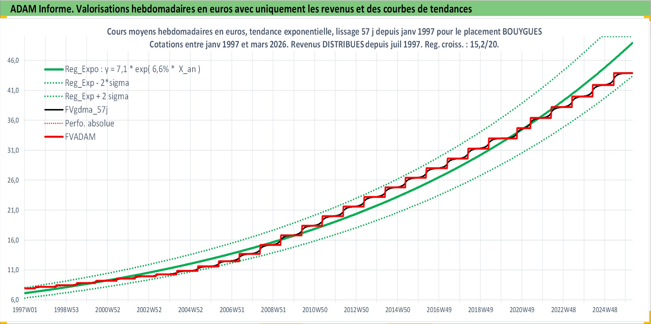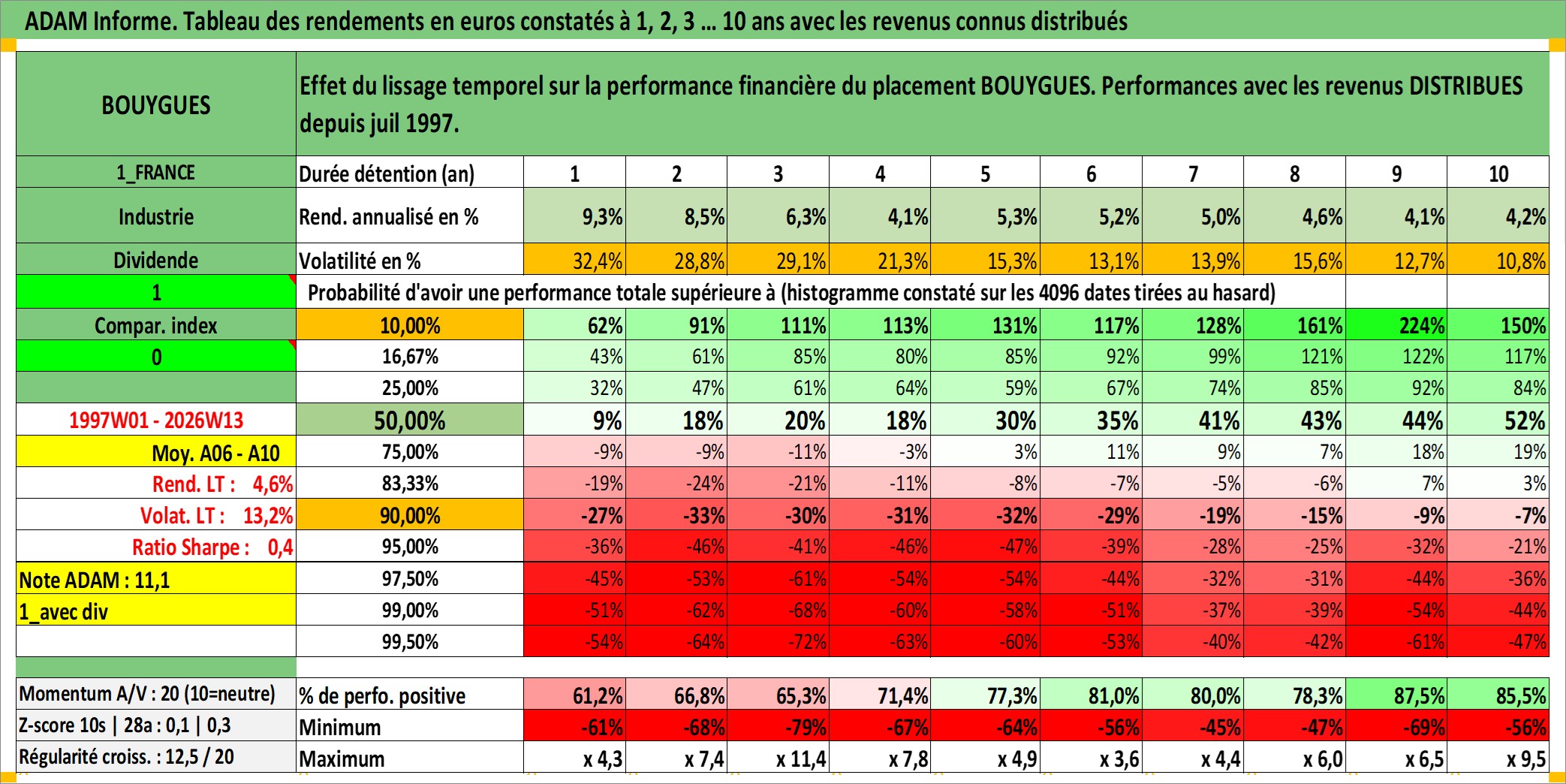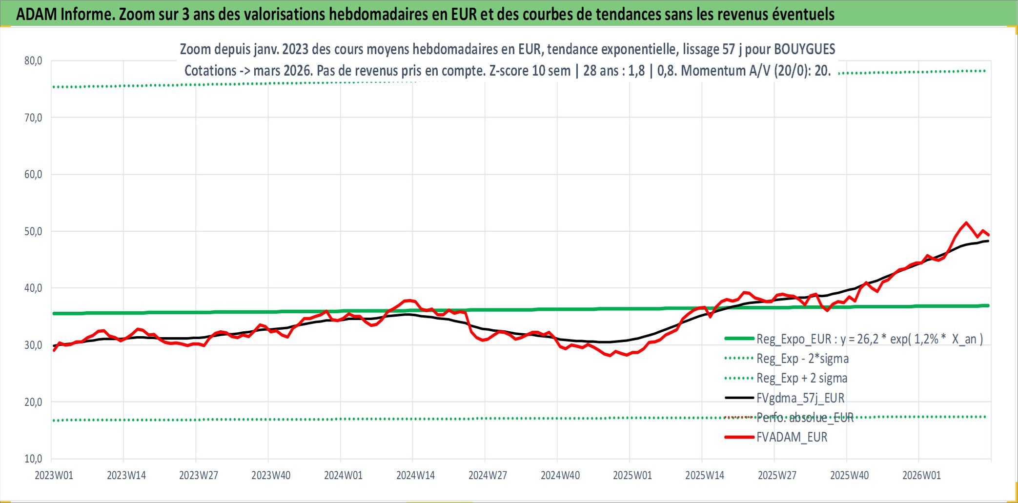 Site dédié aux investisseursPage dédiée sur site financeAnalyse des valorisations hebdomadaires de l'action BOUYGUES. Cet actif est cote en EUR. Les valorisations couvrent les semaines 1997W01 a 2026W13. Les revenus de cet actif financier sont pris en compte depuis la semaine 1997W28. La note globale ESG de cet actif est estimee a 3.0 (apres rebasage entre 0 et 20).