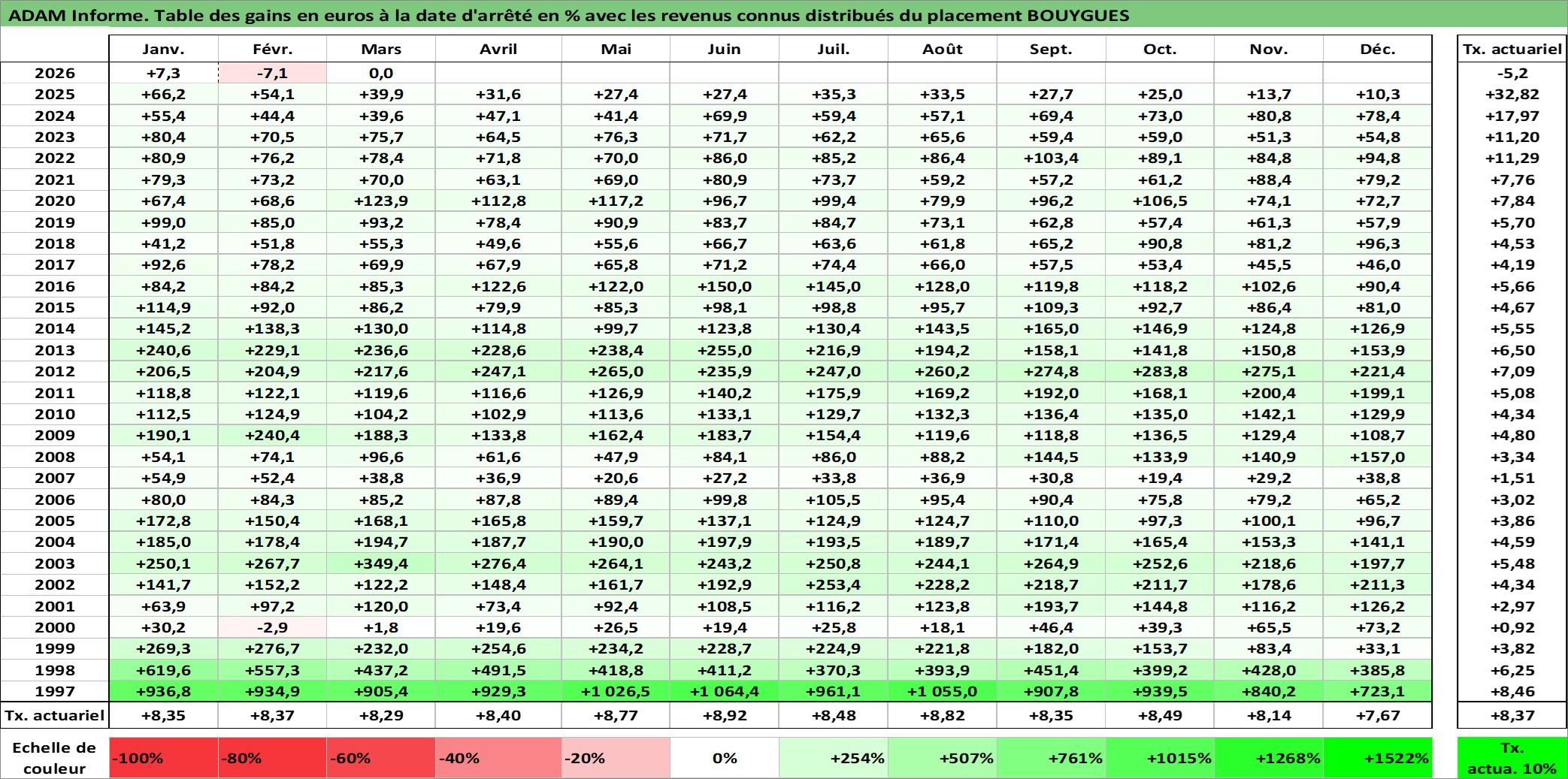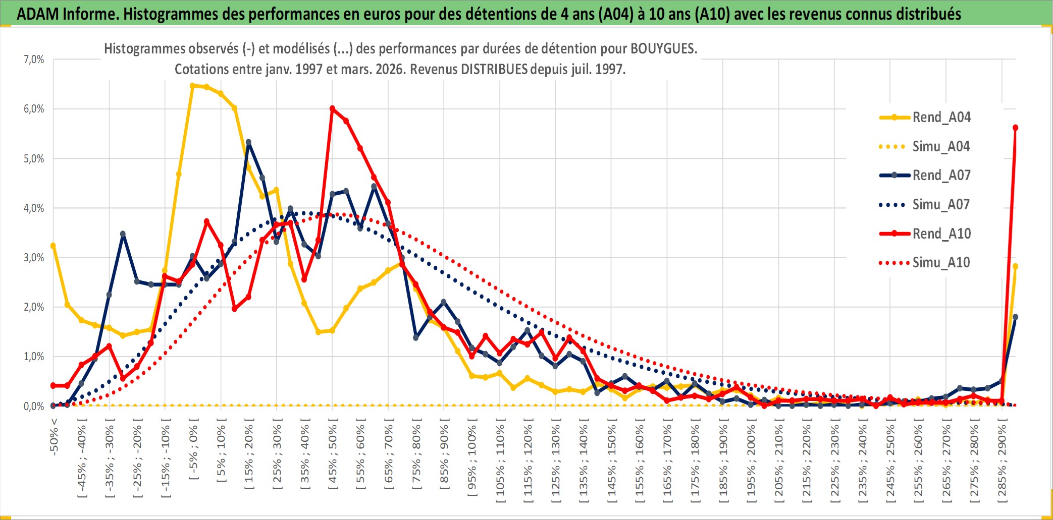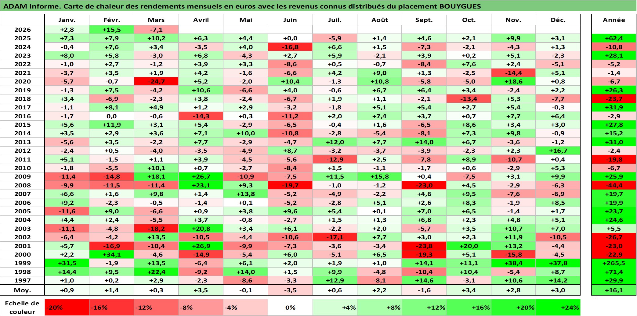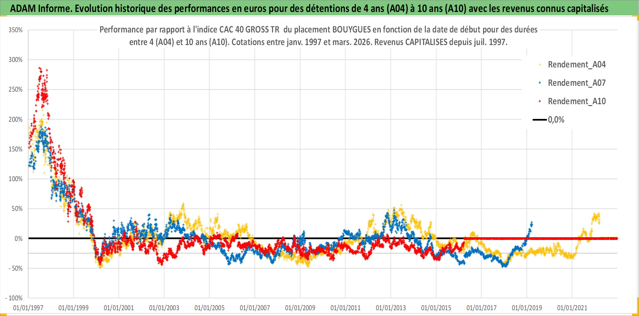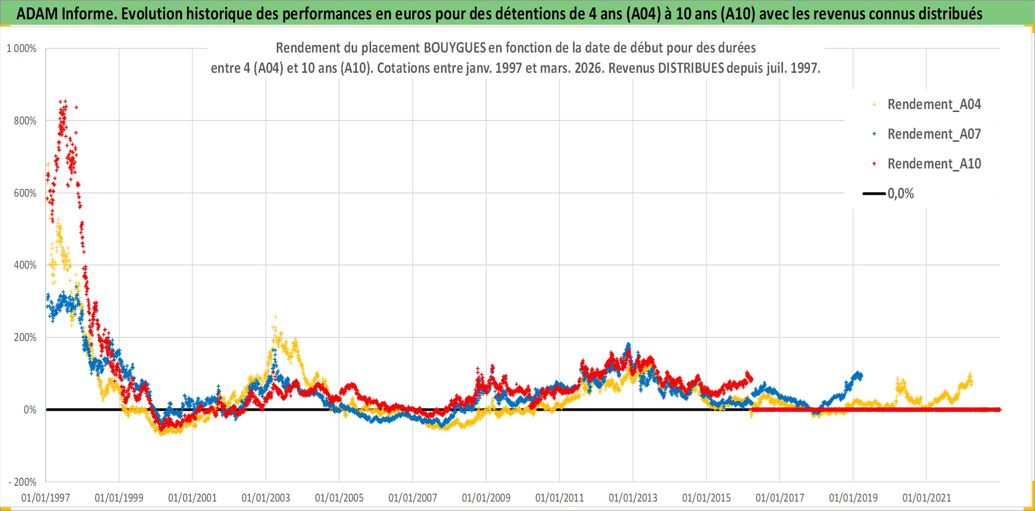 Site dédié aux investisseursPage dédiée sur site financeAnalyse des valorisations hebdomadaires de l'action BOUYGUES. Cet actif est cote en EUR. Les valorisations couvrent les semaines 1997W01 a 2026W13. Les revenus de cet actif financier sont pris en compte depuis la semaine 1997W28. La note globale ESG de cet actif est estimee a 3.0 (apres rebasage entre 0 et 20).