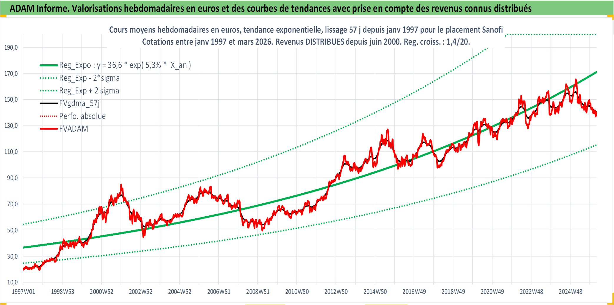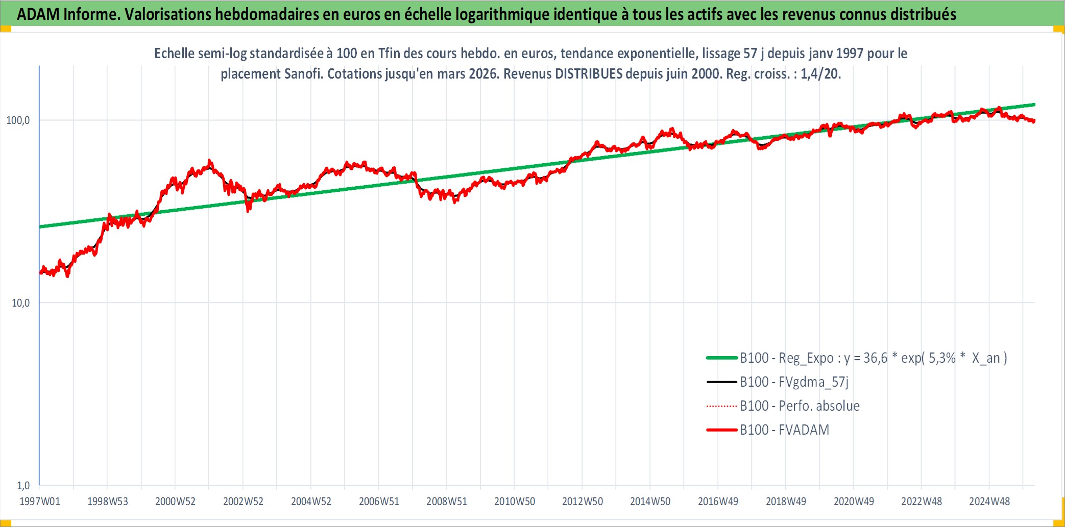 Site dédié aux investisseursPage dédiée sur site financeAnalyse des valorisations hebdomadaires de l'action Sanofi. Cet actif est cote en EUR. Les valorisations couvrent les semaines 1997W01 a 2026W13. Les revenus de cet actif financier sont pris en compte depuis la semaine 2000W23. La note globale ESG de cet actif est estimee a 9.0 (apres rebasage entre 0 et 20).