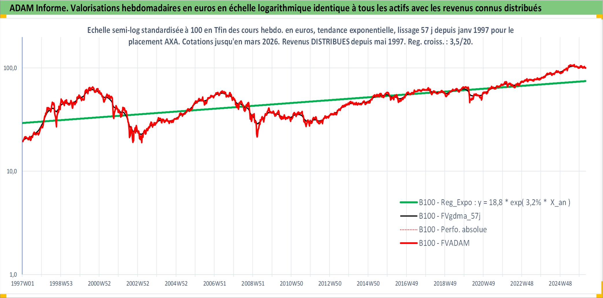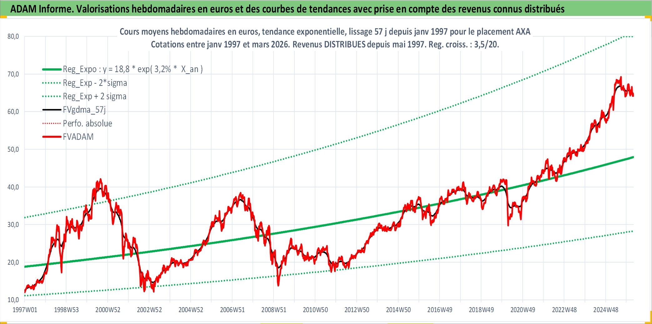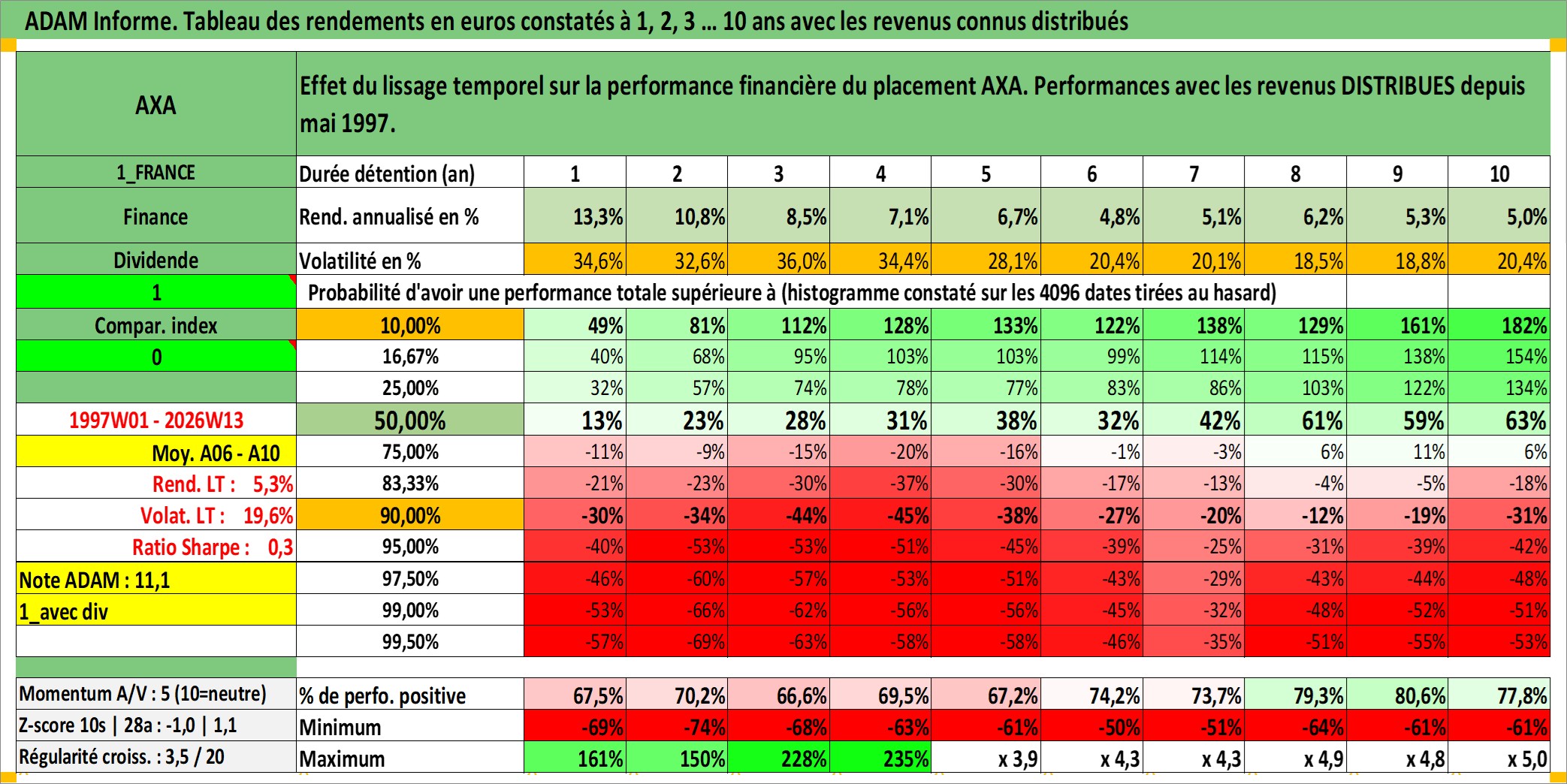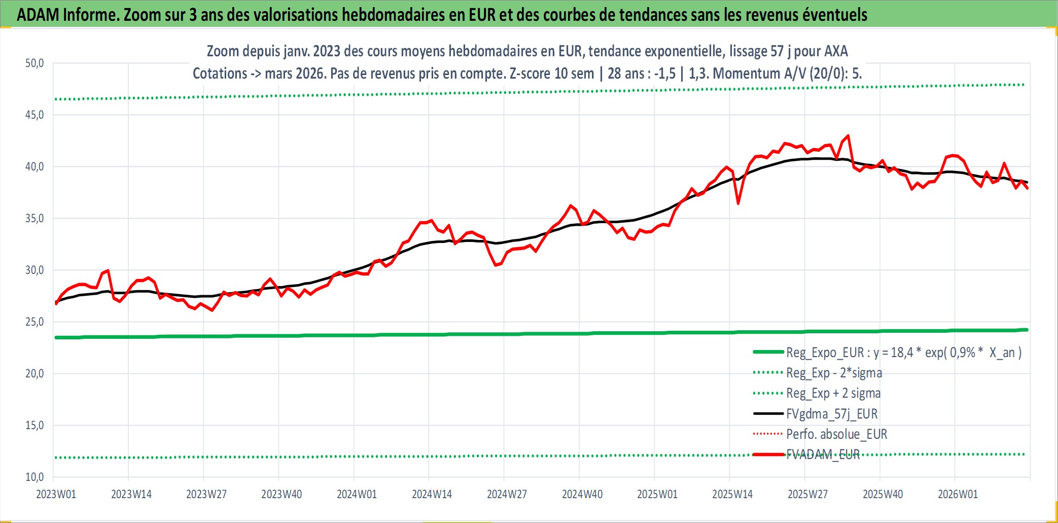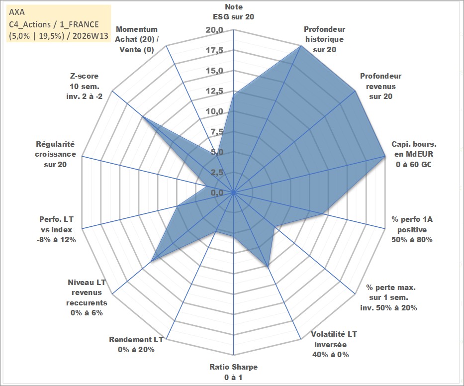 Site dédié aux investisseursPage dédiée sur site financeAnalyse des valorisations hebdomadaires de l'action AXA. Cet actif est cote en EUR. Les valorisations couvrent les semaines 1997W01 a 2026W13. Les revenus de cet actif financier sont pris en compte depuis la semaine 1997W20. La note globale ESG de cet actif est estimee a 12.0 (apres rebasage entre 0 et 20).