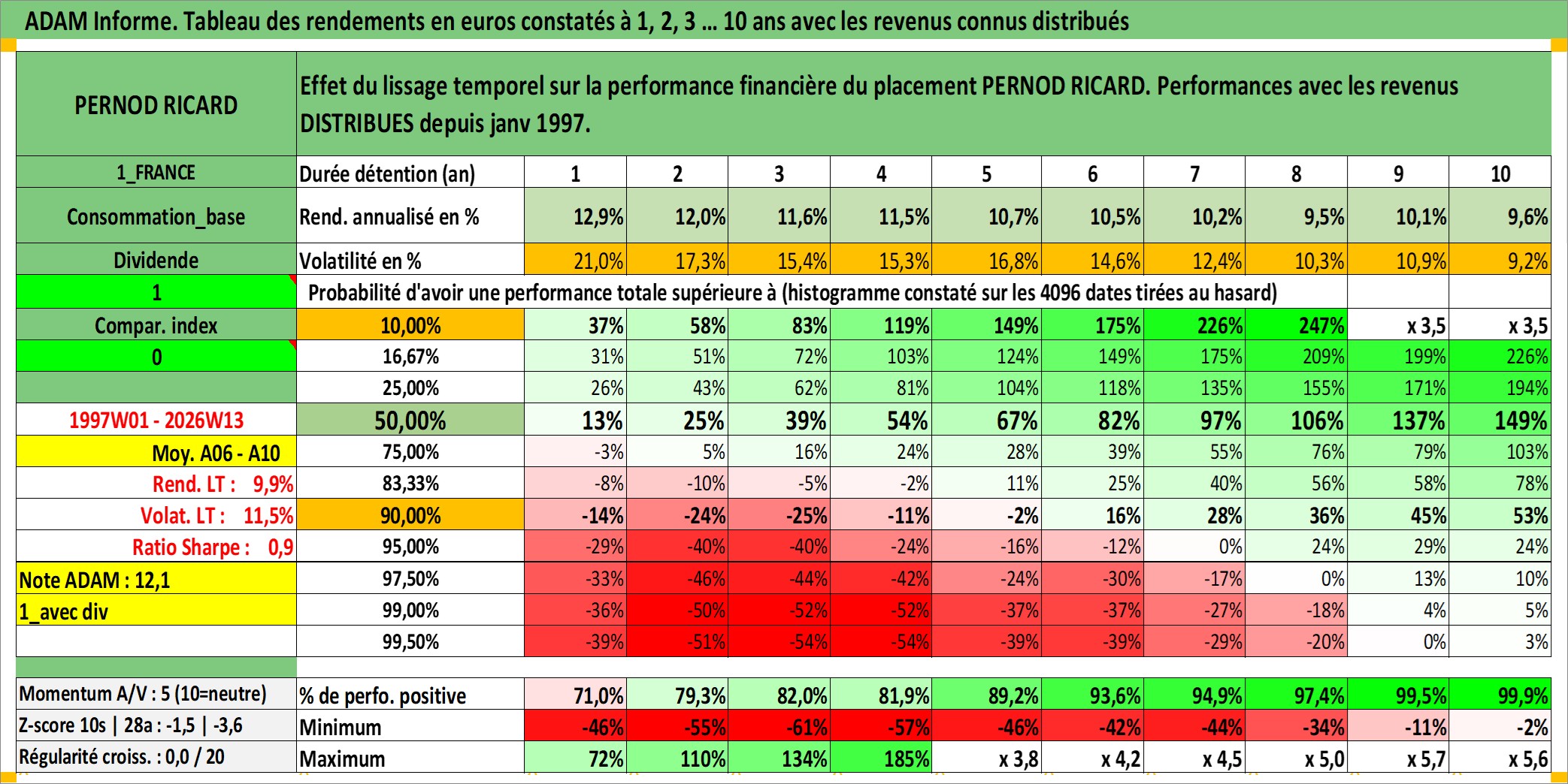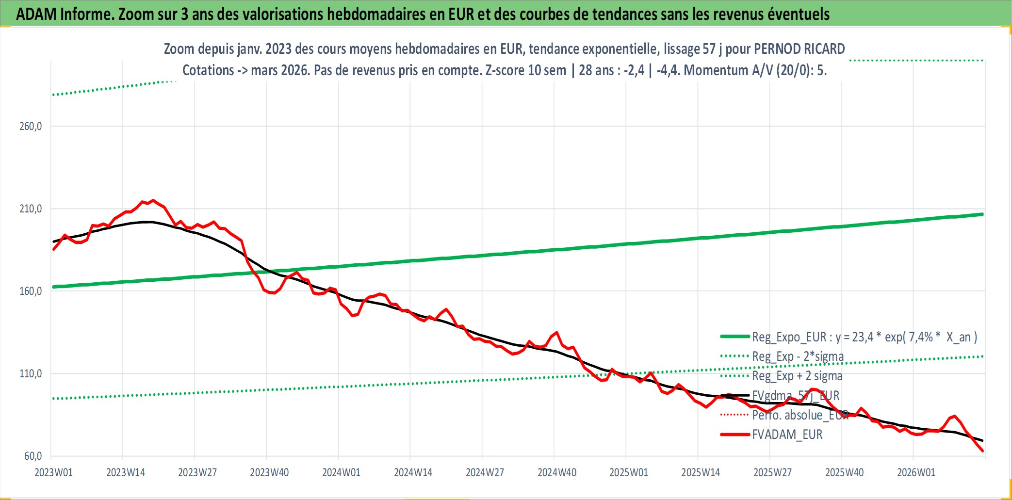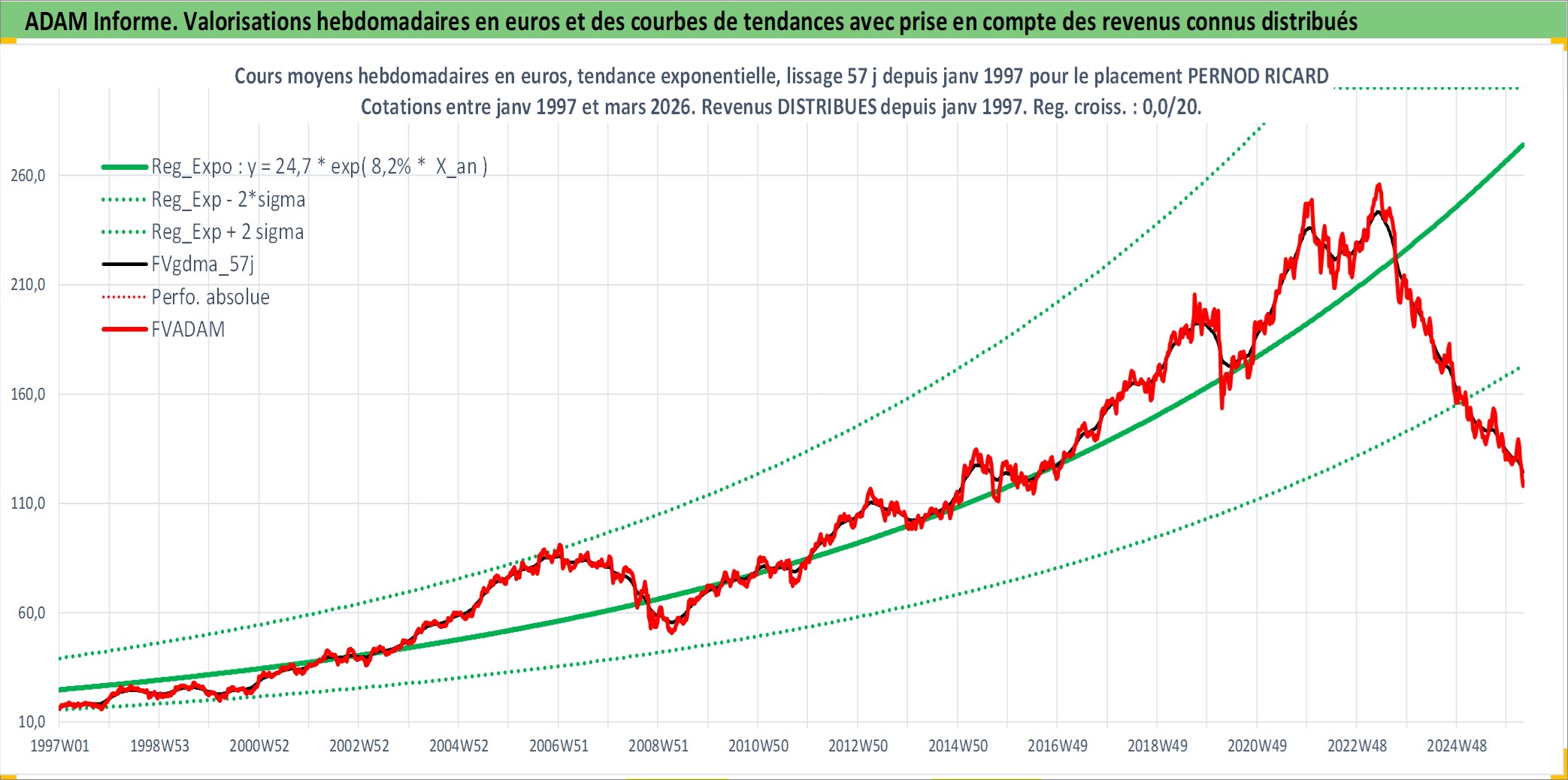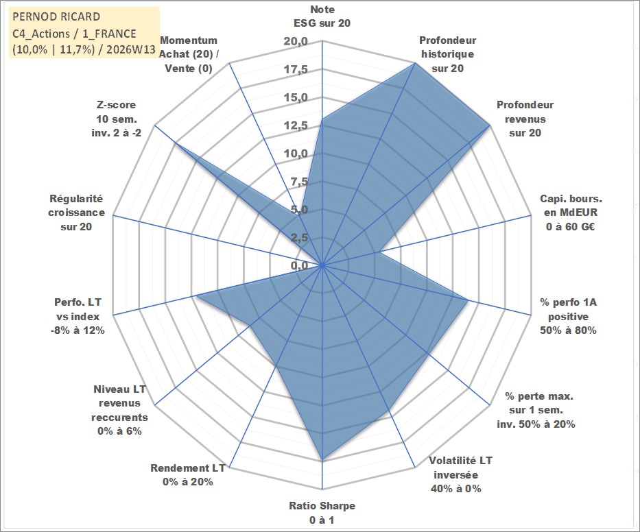 Site dédié aux investisseursPage dédiée sur site financeAnalyse des valorisations hebdomadaires de l'action PERNOD RICARD. Cet actif est cote en EUR. Les valorisations couvrent les semaines 1997W01 a 2026W13. Les revenus de cet actif financier sont pris en compte depuis la semaine 1997W03. La note globale ESG de cet actif est estimee a 13.0 (apres rebasage entre 0 et 20).