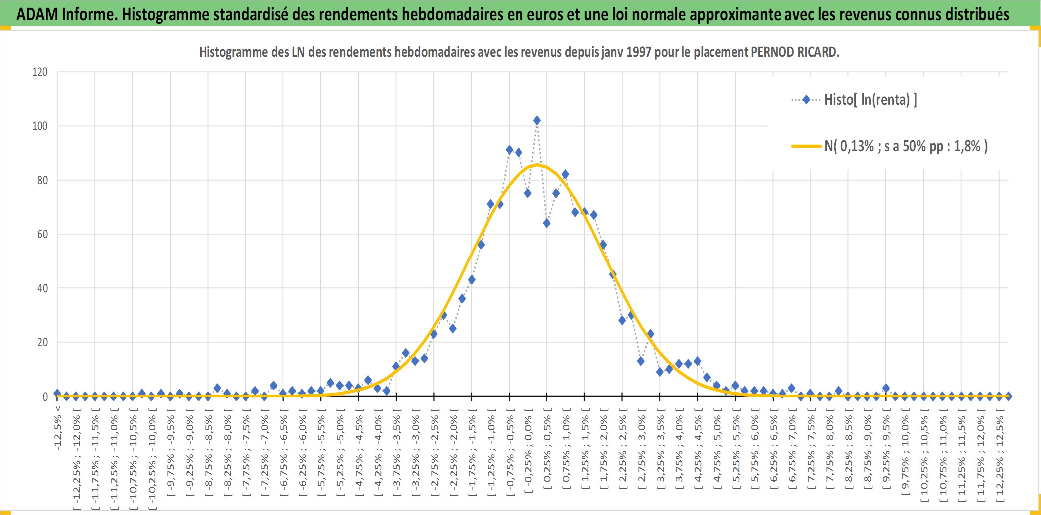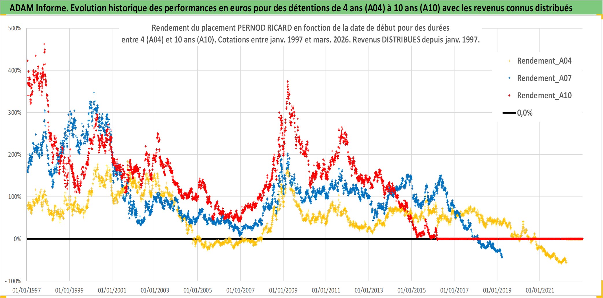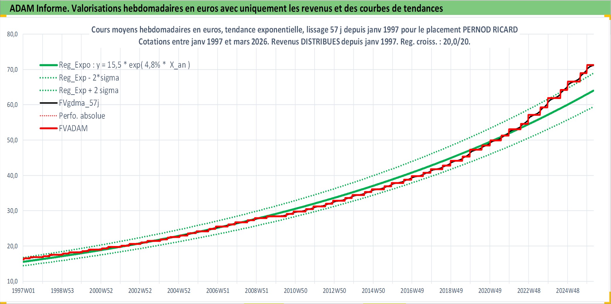 Site dédié aux investisseursPage dédiée sur site financeAnalyse des valorisations hebdomadaires de l'action PERNOD RICARD. Cet actif est cote en EUR. Les valorisations couvrent les semaines 1997W01 a 2026W13. Les revenus de cet actif financier sont pris en compte depuis la semaine 1997W03. La note globale ESG de cet actif est estimee a 13.0 (apres rebasage entre 0 et 20).