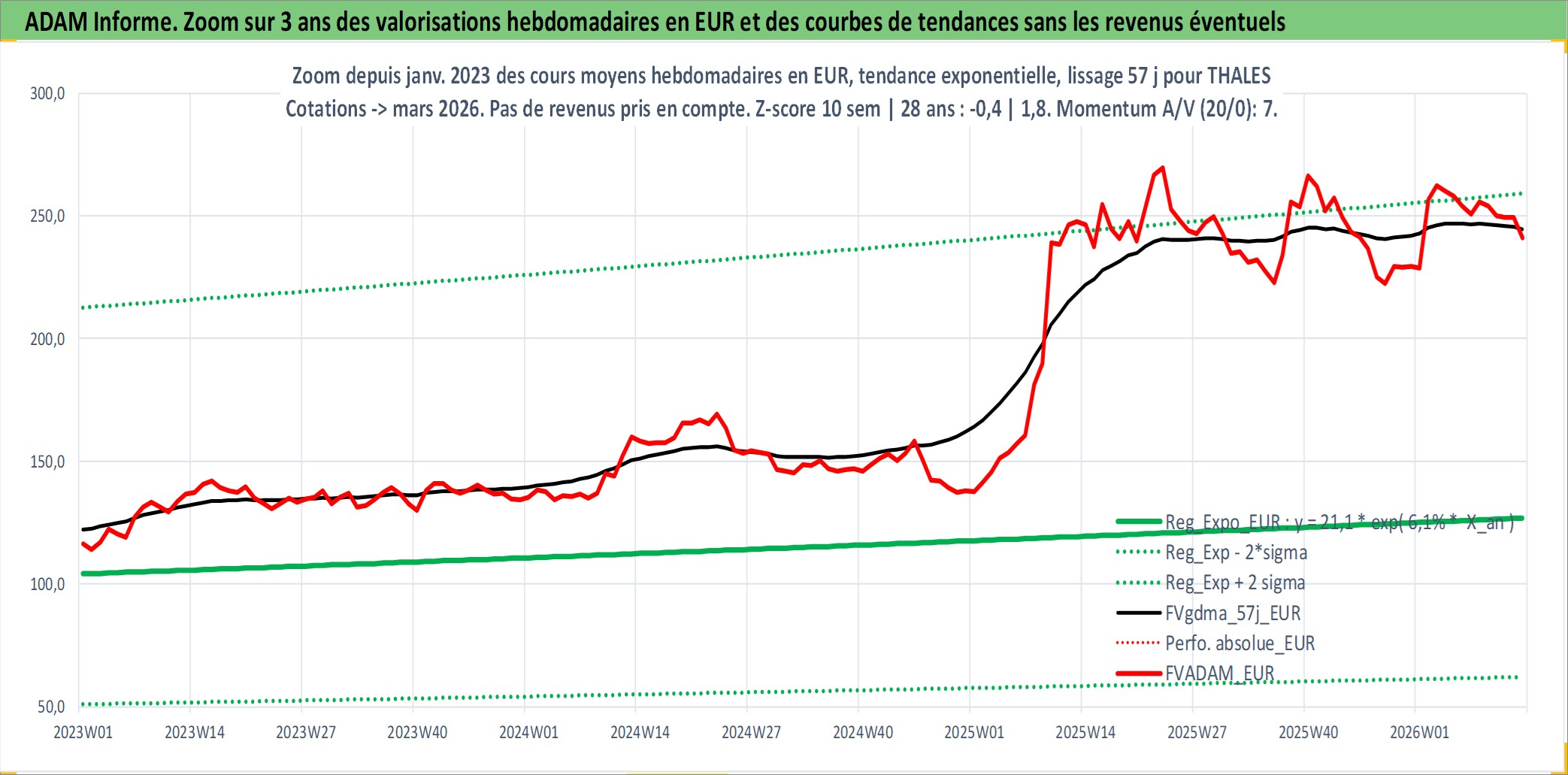 Site dédié aux investisseursPage dédiée sur site financeAnalyse des valorisations hebdomadaires de l'action THALES. Cet actif est cote en EUR. Les valorisations couvrent les semaines 1997W01 a 2026W13. Les revenus de cet actif financier sont pris en compte depuis la semaine 1997W28. La note globale ESG de cet actif est estimee a 6.0 (apres rebasage entre 0 et 20).