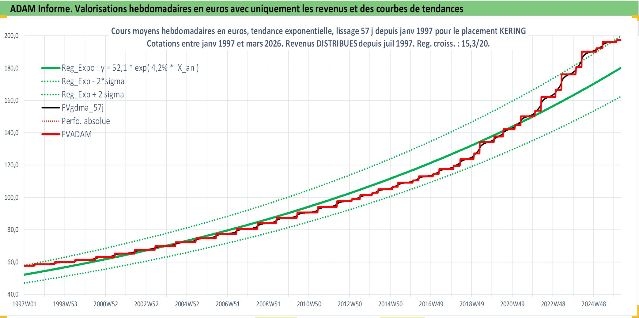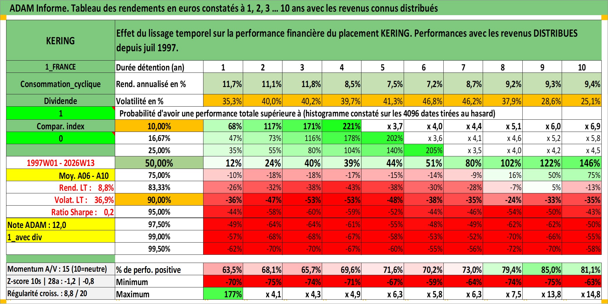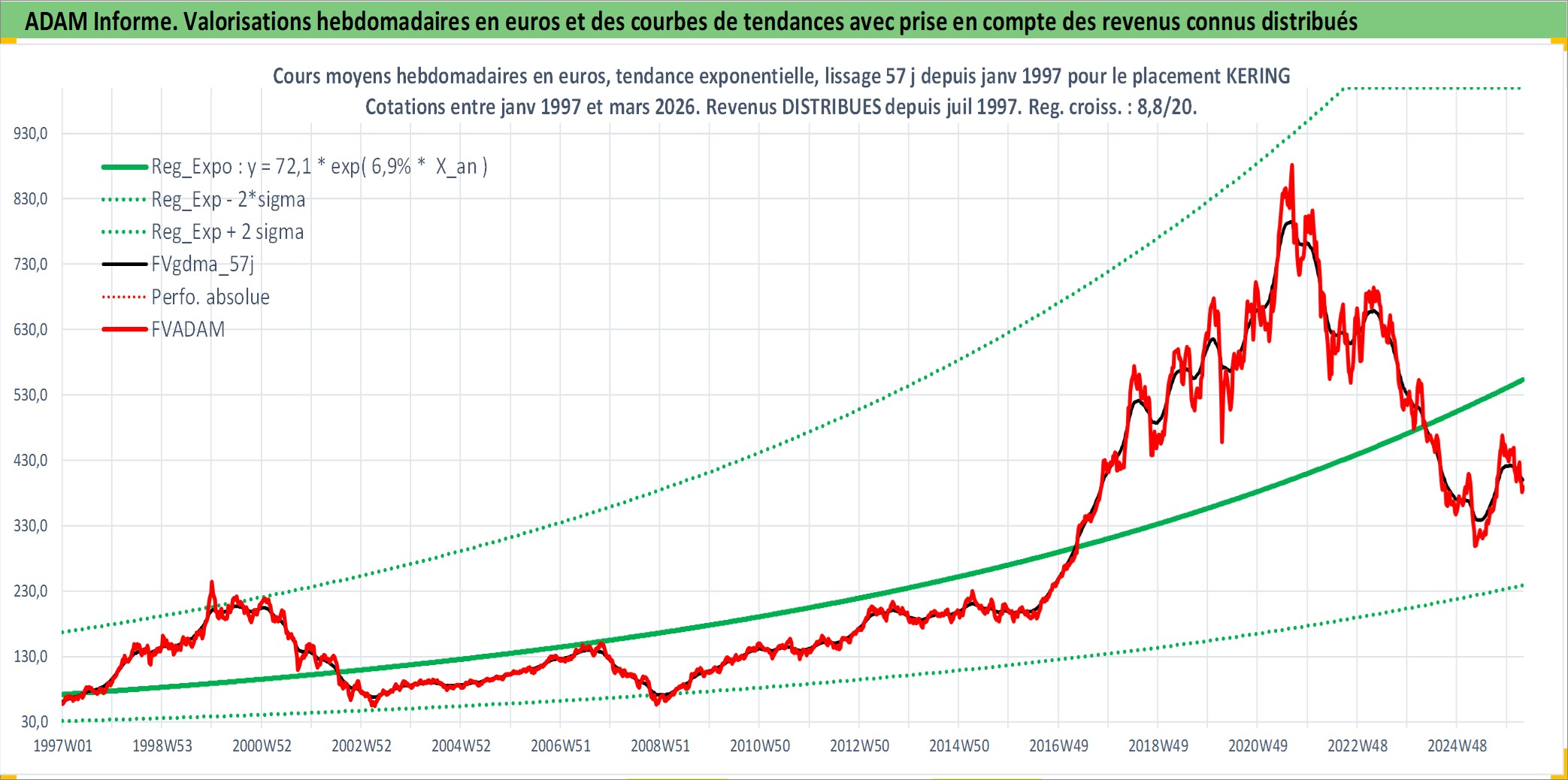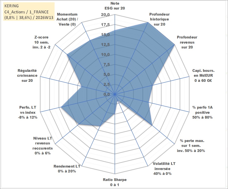 Site dédié aux investisseursPage dédiée sur site financeAnalyse des valorisations hebdomadaires de l'action KERING. Cet actif est cote en EUR. Les valorisations couvrent les semaines 1997W01 a 2026W13. Les revenus de cet actif financier sont pris en compte depuis la semaine 1997W27. La note globale ESG de cet actif est estimee a 16.0 (apres rebasage entre 0 et 20).