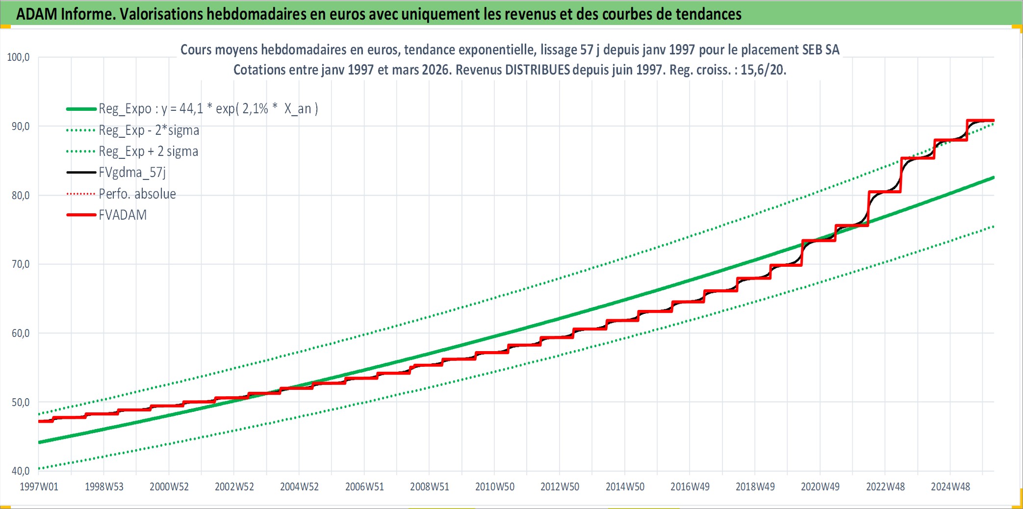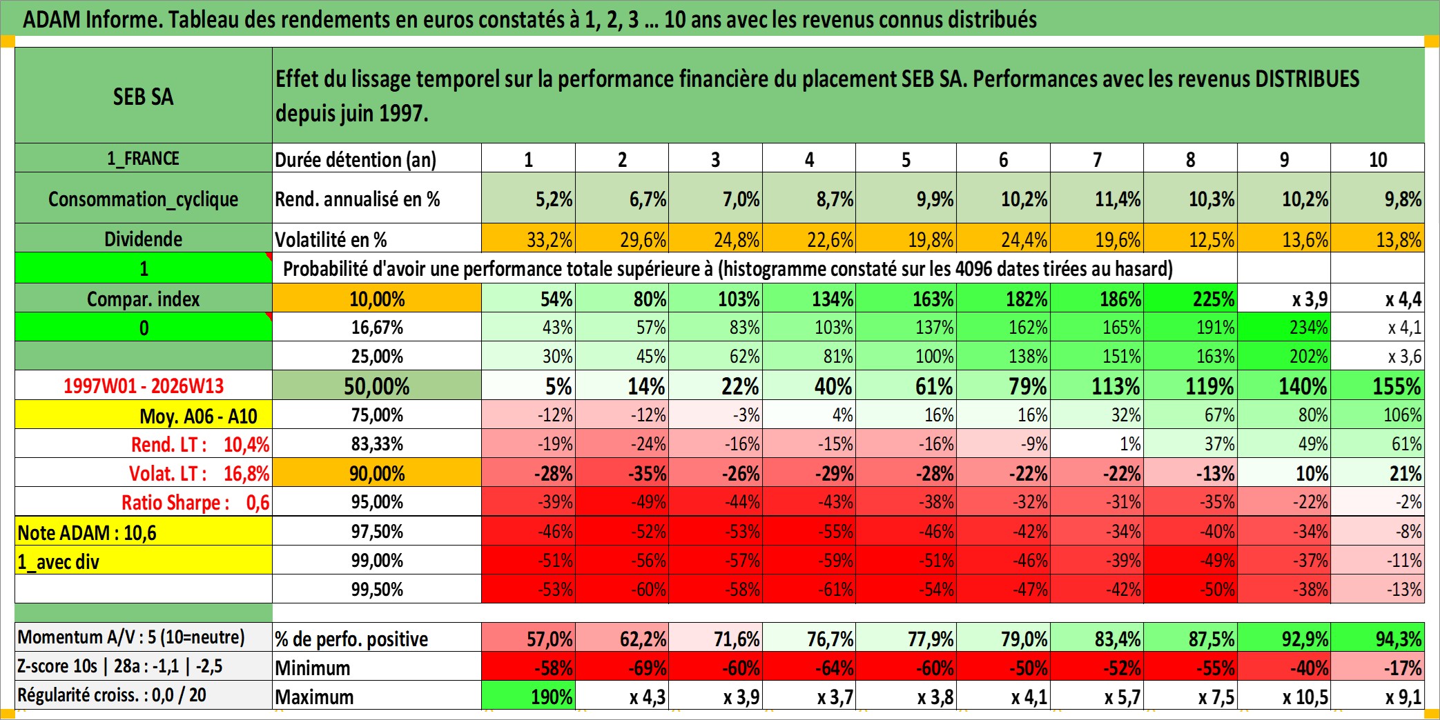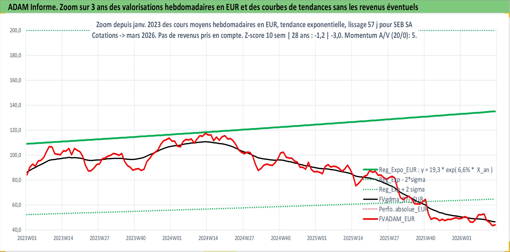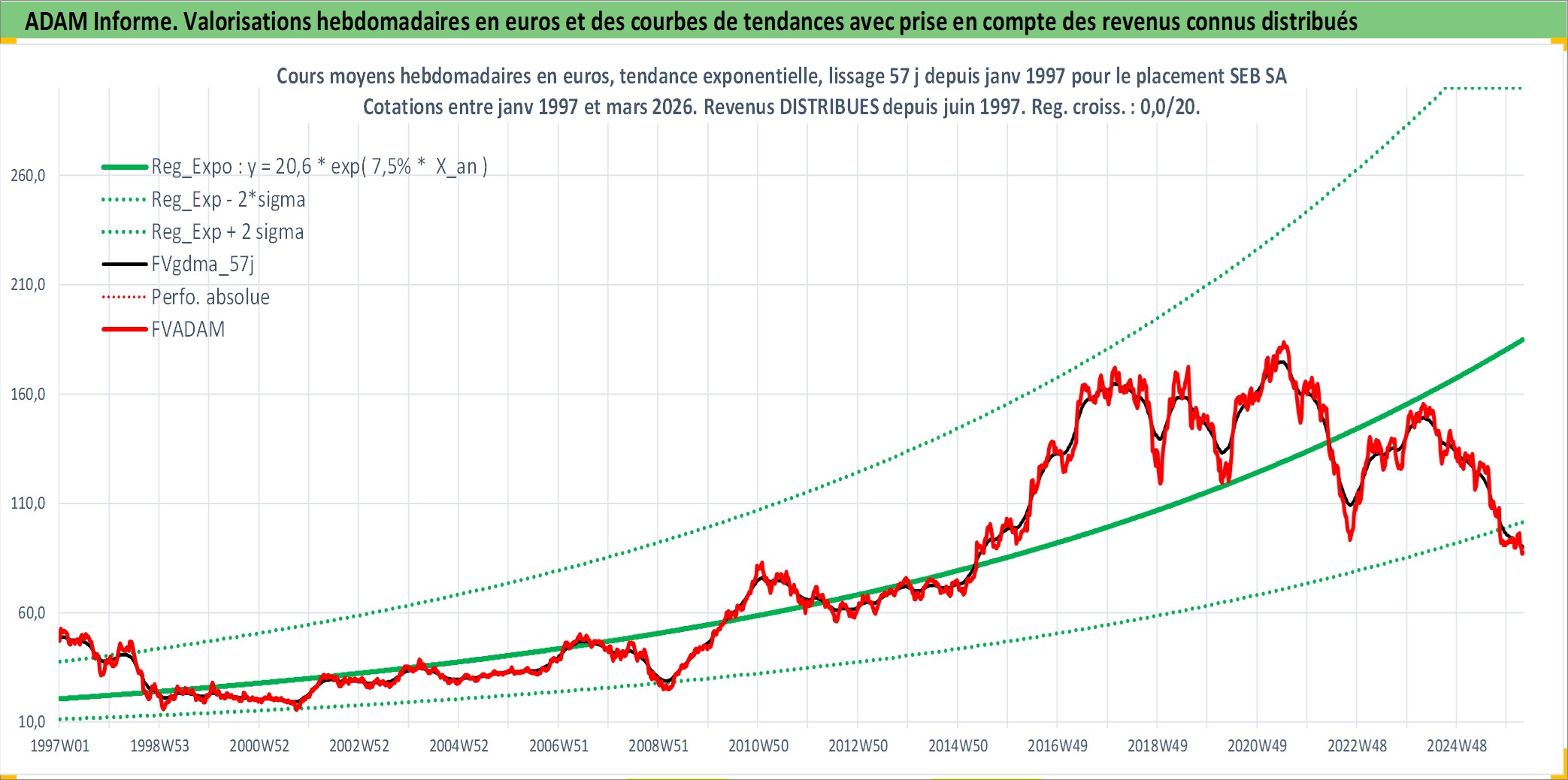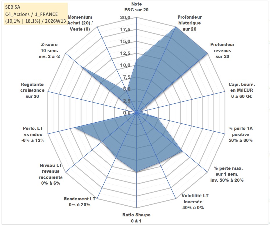 Site dédié aux investisseursPage dédiée sur site financeAnalyse des valorisations hebdomadaires de l'action SEB SA. Cet actif est cote en EUR. Les valorisations couvrent les semaines 1997W01 a 2026W13. Les revenus de cet actif financier sont pris en compte depuis la semaine 1997W24. La note globale ESG de cet actif est estimee a 11.0 (apres rebasage entre 0 et 20).