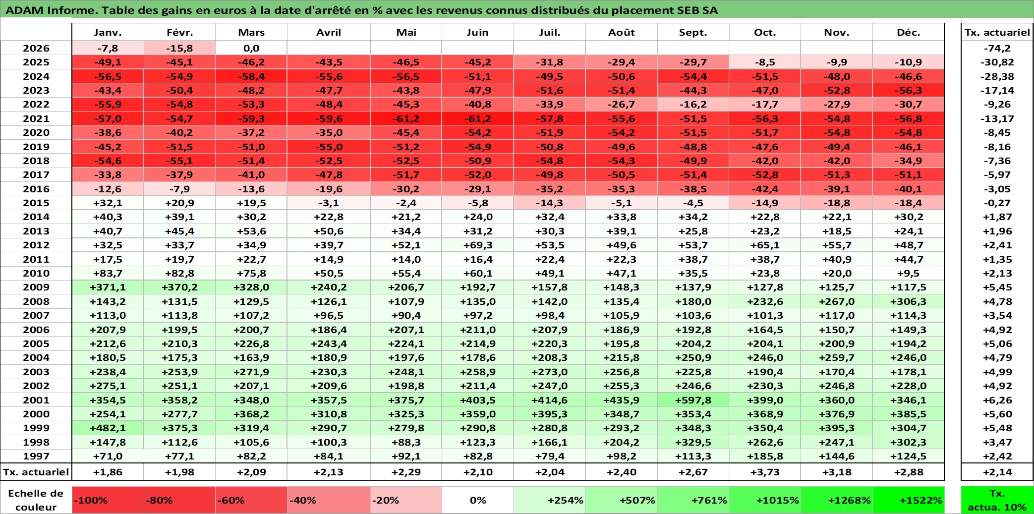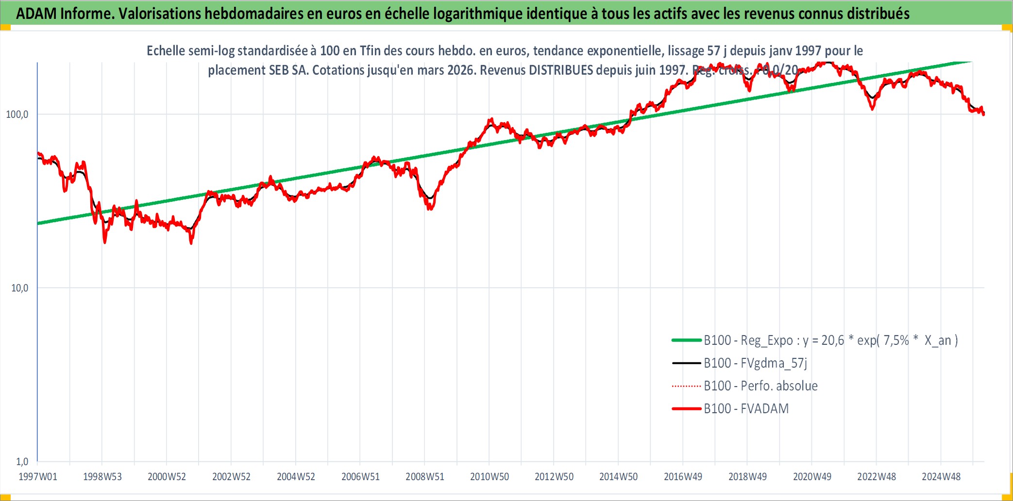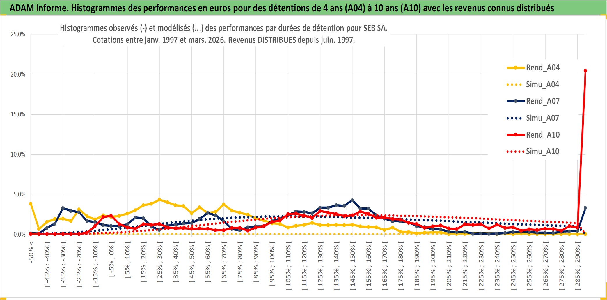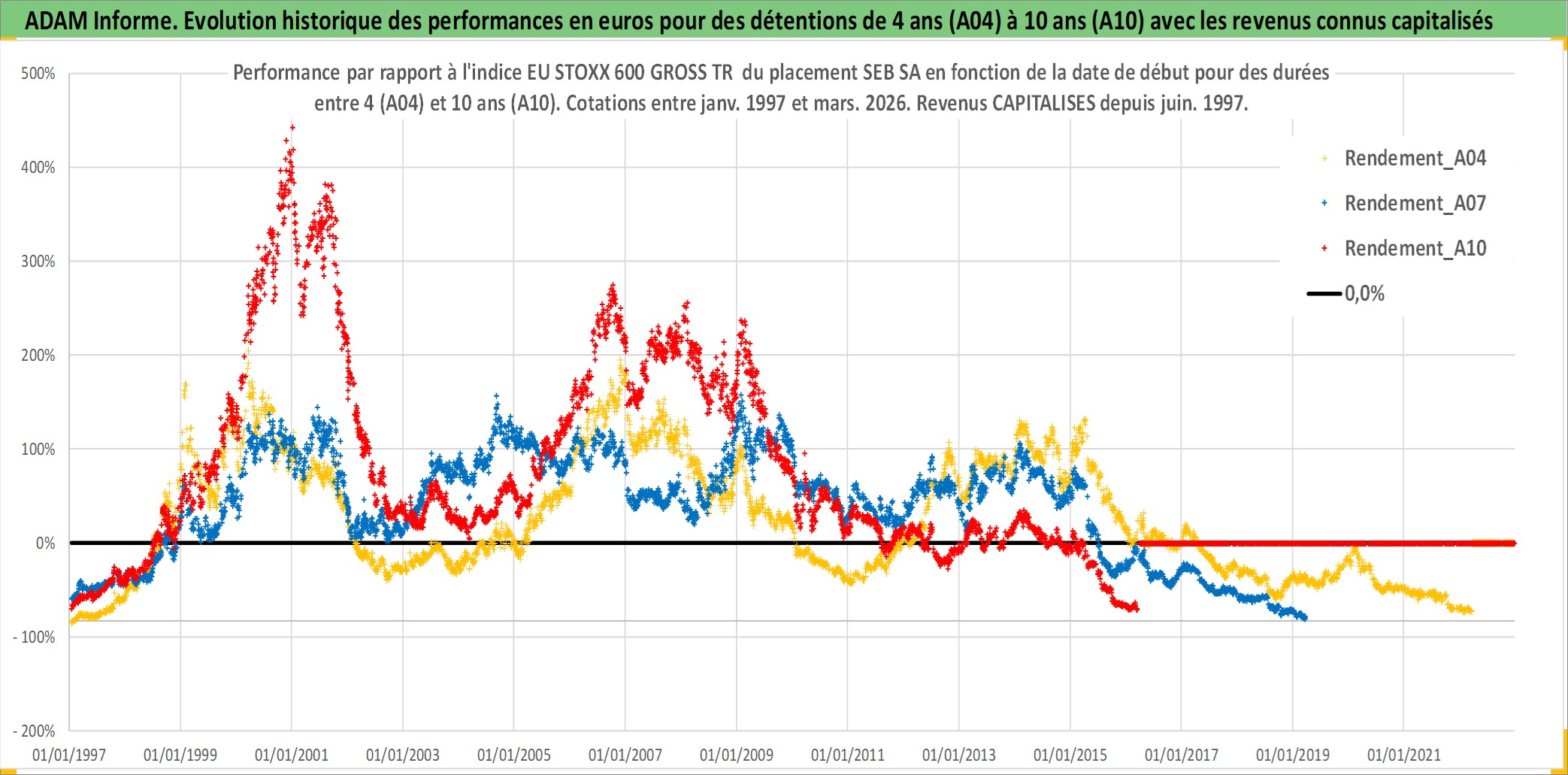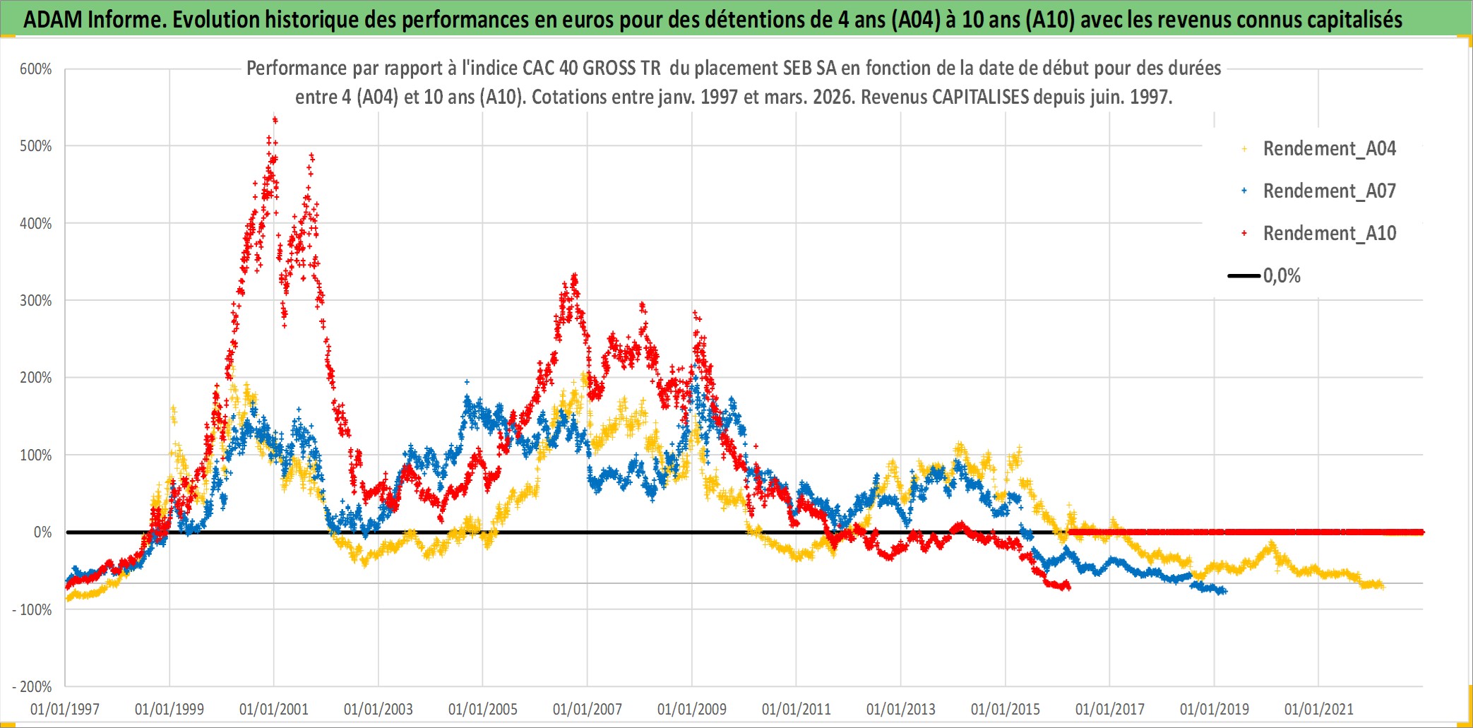 Site dédié aux investisseursPage dédiée sur site financeAnalyse des valorisations hebdomadaires de l'action SEB SA. Cet actif est cote en EUR. Les valorisations couvrent les semaines 1997W01 a 2026W13. Les revenus de cet actif financier sont pris en compte depuis la semaine 1997W24. La note globale ESG de cet actif est estimee a 11.0 (apres rebasage entre 0 et 20).