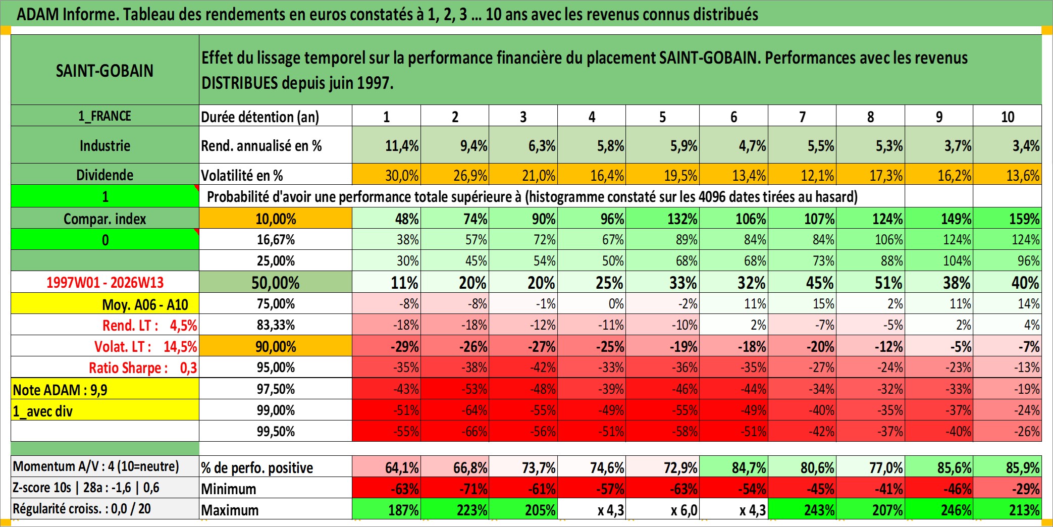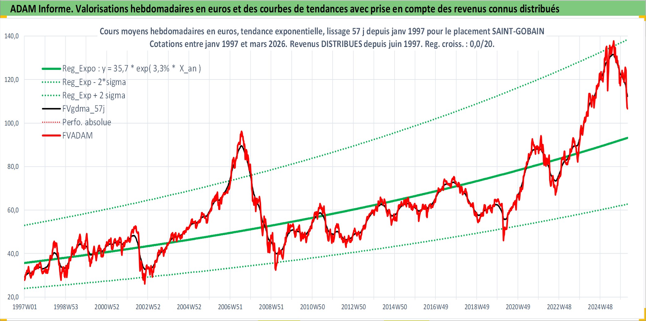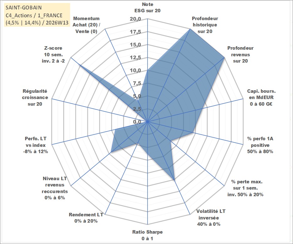 Site dédié aux investisseursPage dédiée sur site financeAnalyse des valorisations hebdomadaires de l'action SAINT-GOBAIN. Cet actif est cote en EUR. Les valorisations couvrent les semaines 1997W01 a 2026W13. Les revenus de cet actif financier sont pris en compte depuis la semaine 1997W26. La note globale ESG de cet actif est estimee a 10.0 (apres rebasage entre 0 et 20).