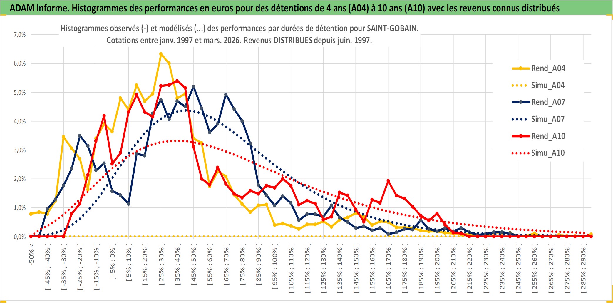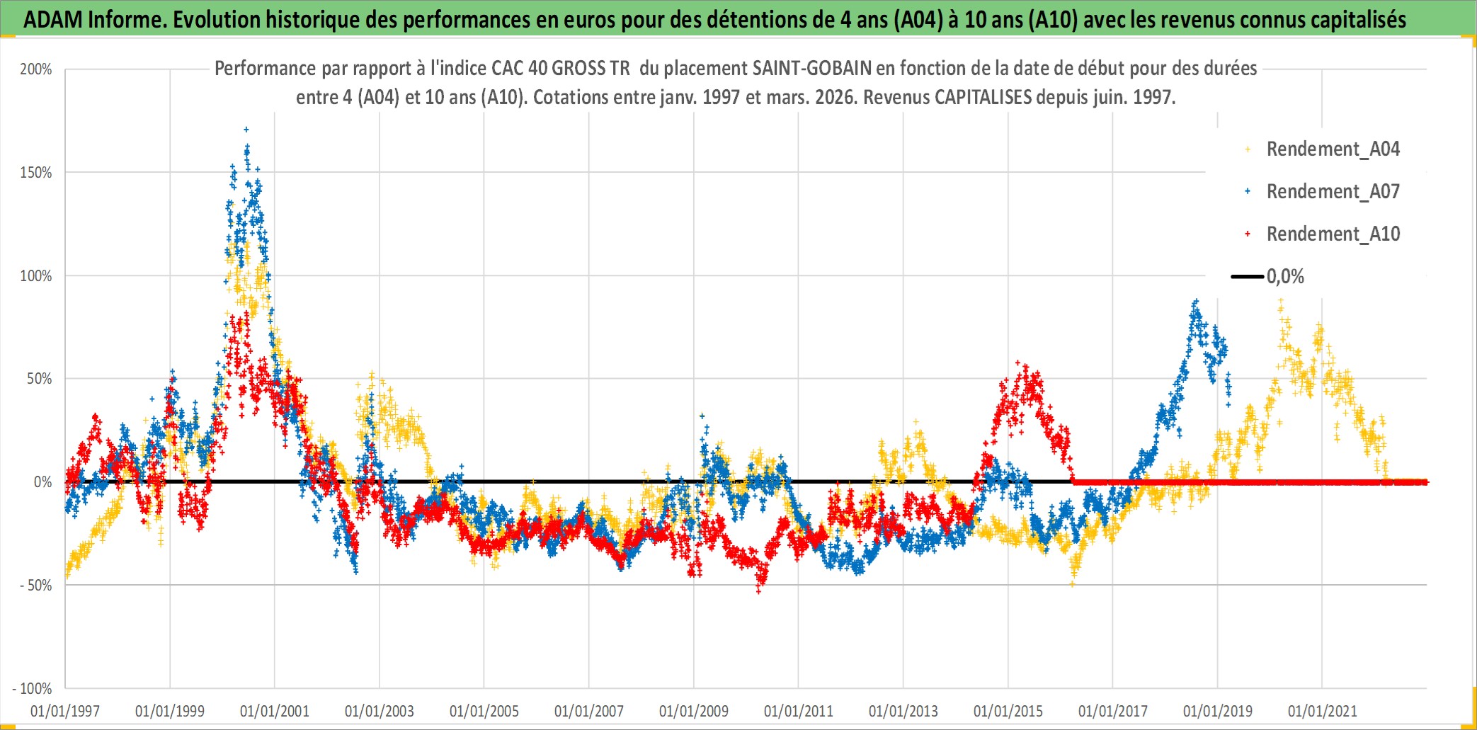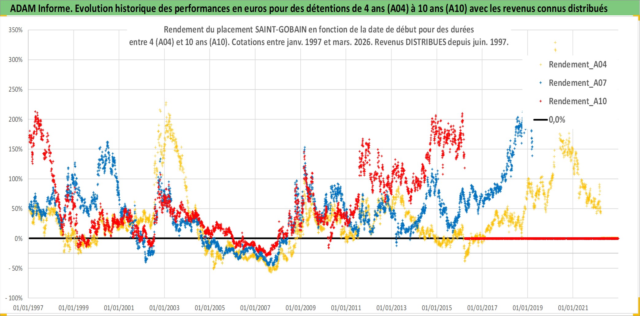 Site dédié aux investisseursPage dédiée sur site financeAnalyse des valorisations hebdomadaires de l'action SAINT-GOBAIN. Cet actif est cote en EUR. Les valorisations couvrent les semaines 1997W01 a 2026W13. Les revenus de cet actif financier sont pris en compte depuis la semaine 1997W26. La note globale ESG de cet actif est estimee a 10.0 (apres rebasage entre 0 et 20).