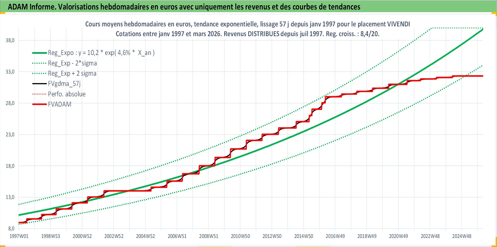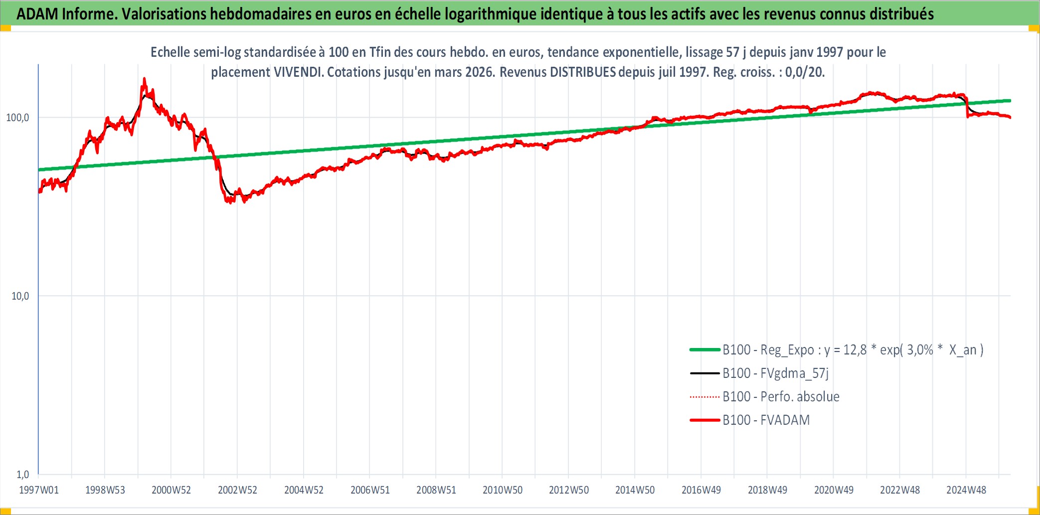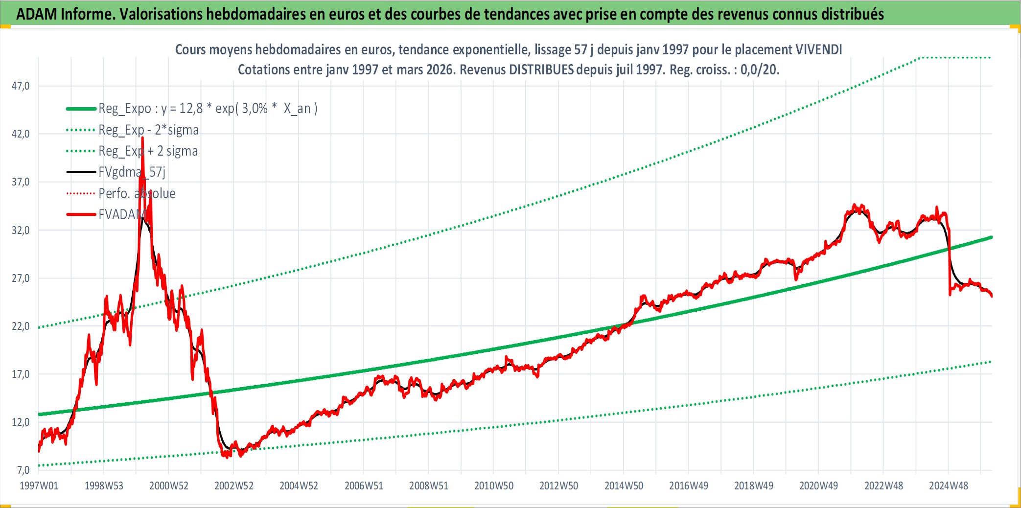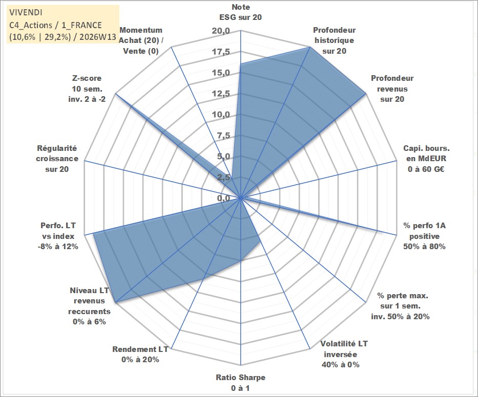 Site dédié aux investisseursPage dédiée sur site financeAnalyse des valorisations hebdomadaires de l'action VIVENDI. Cet actif est cote en EUR. Les valorisations couvrent les semaines 1997W01 a 2026W13. Les revenus de cet actif financier sont pris en compte depuis la semaine 1997W27. La note globale ESG de cet actif est estimee a 16.0 (apres rebasage entre 0 et 20).