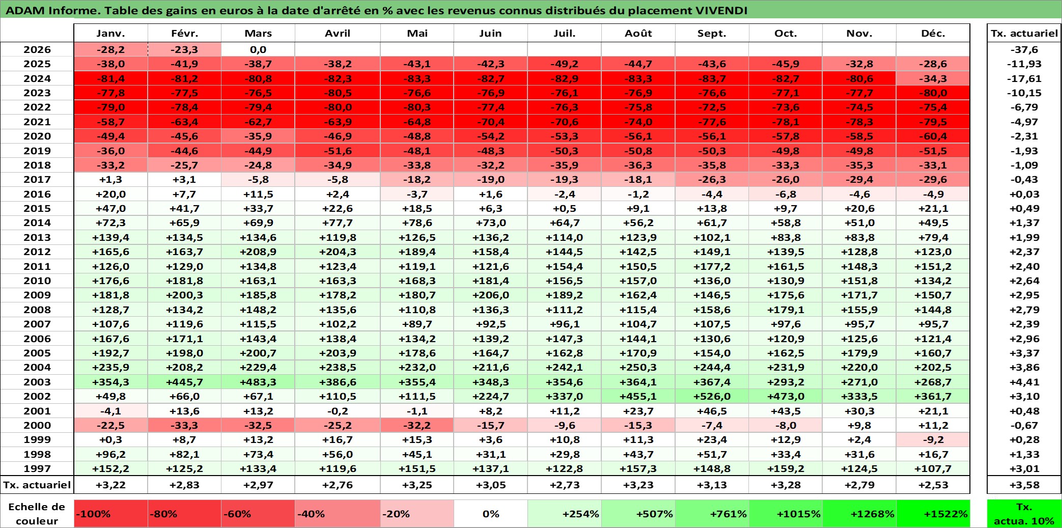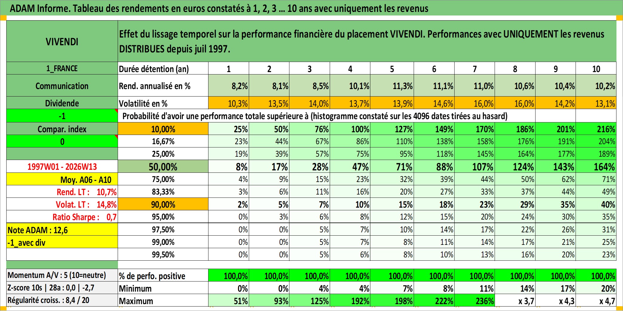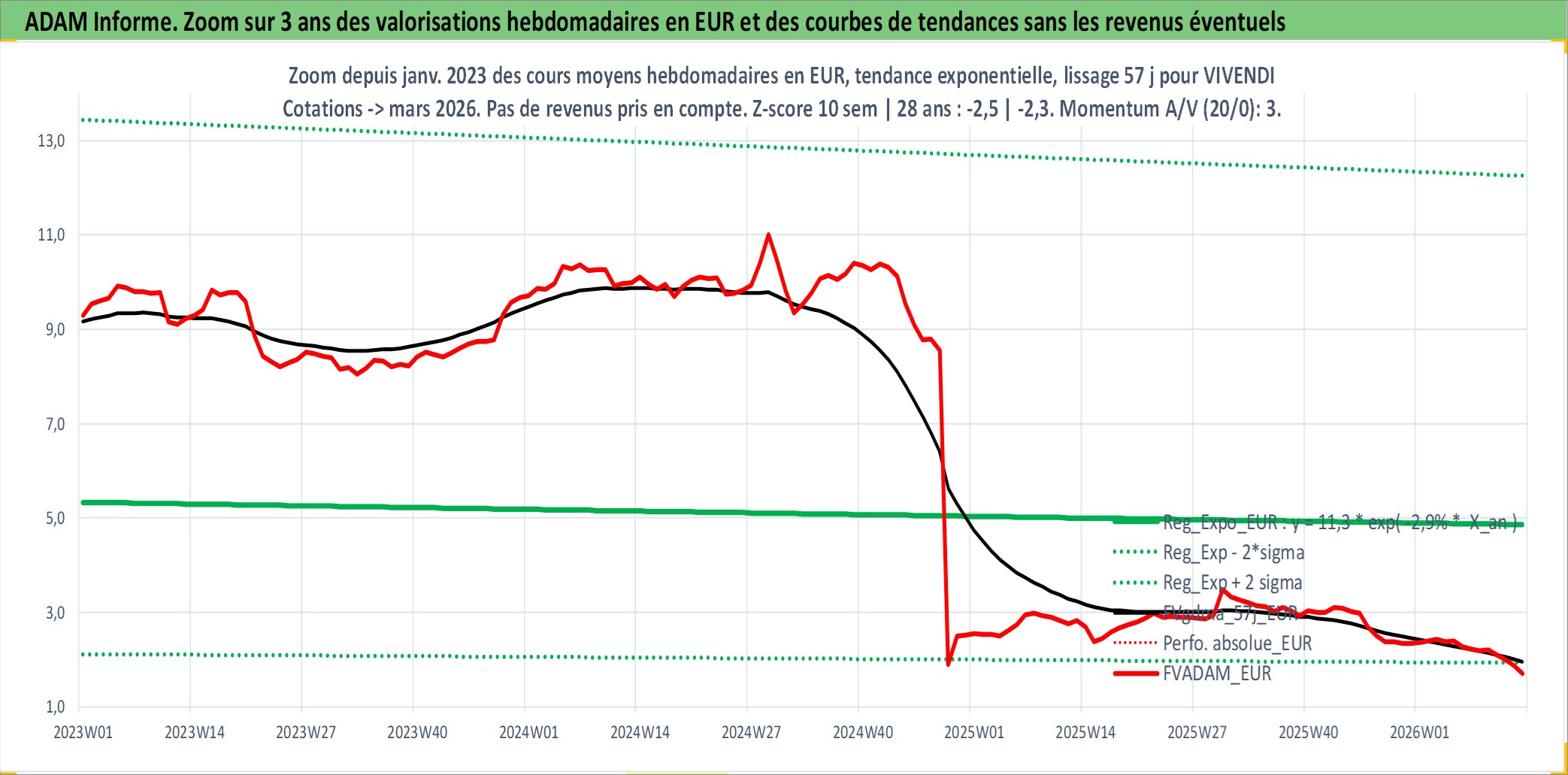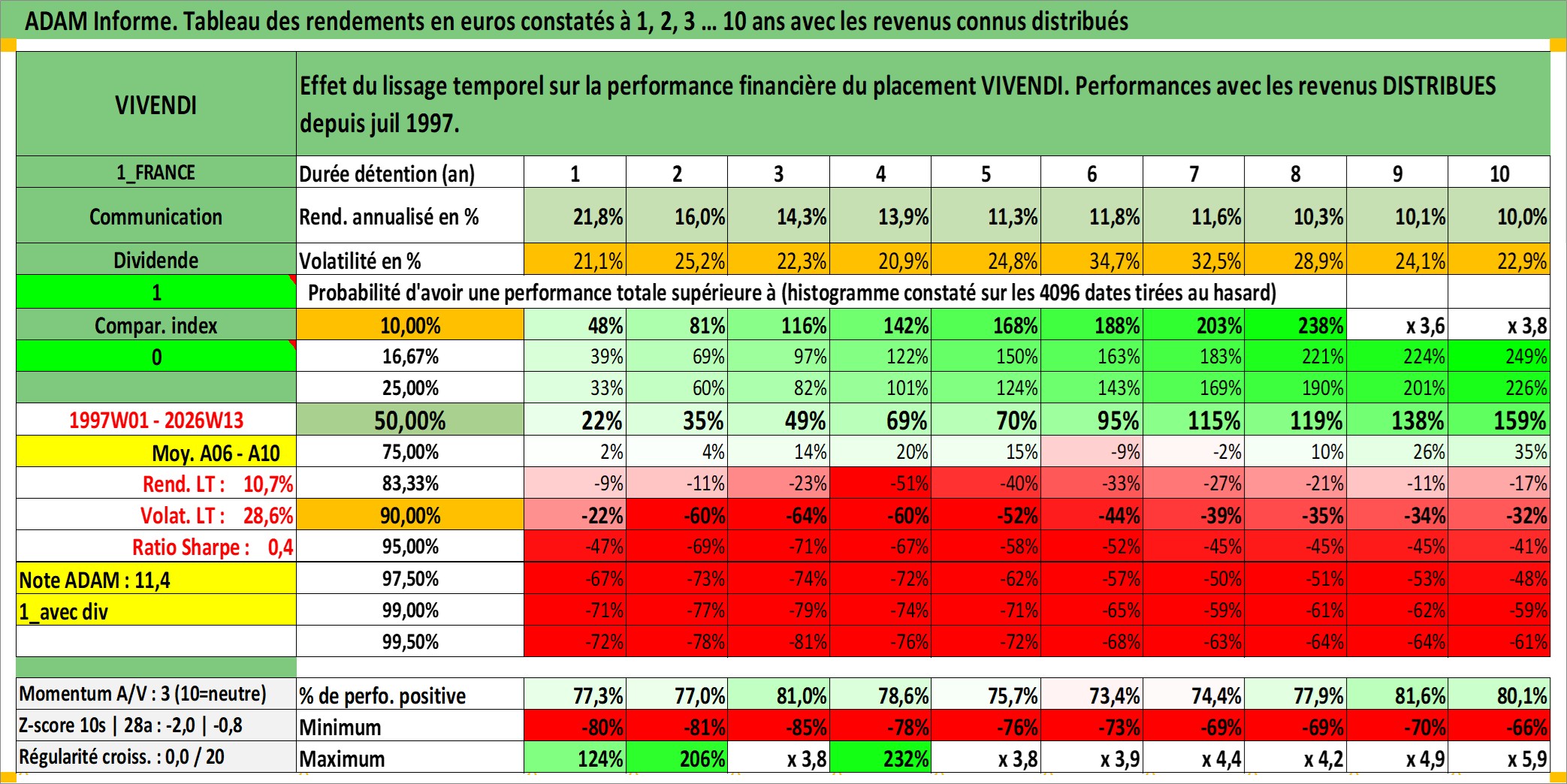 Site dédié aux investisseursPage dédiée sur site financeAnalyse des valorisations hebdomadaires de l'action VIVENDI. Cet actif est cote en EUR. Les valorisations couvrent les semaines 1997W01 a 2026W13. Les revenus de cet actif financier sont pris en compte depuis la semaine 1997W27. La note globale ESG de cet actif est estimee a 16.0 (apres rebasage entre 0 et 20).