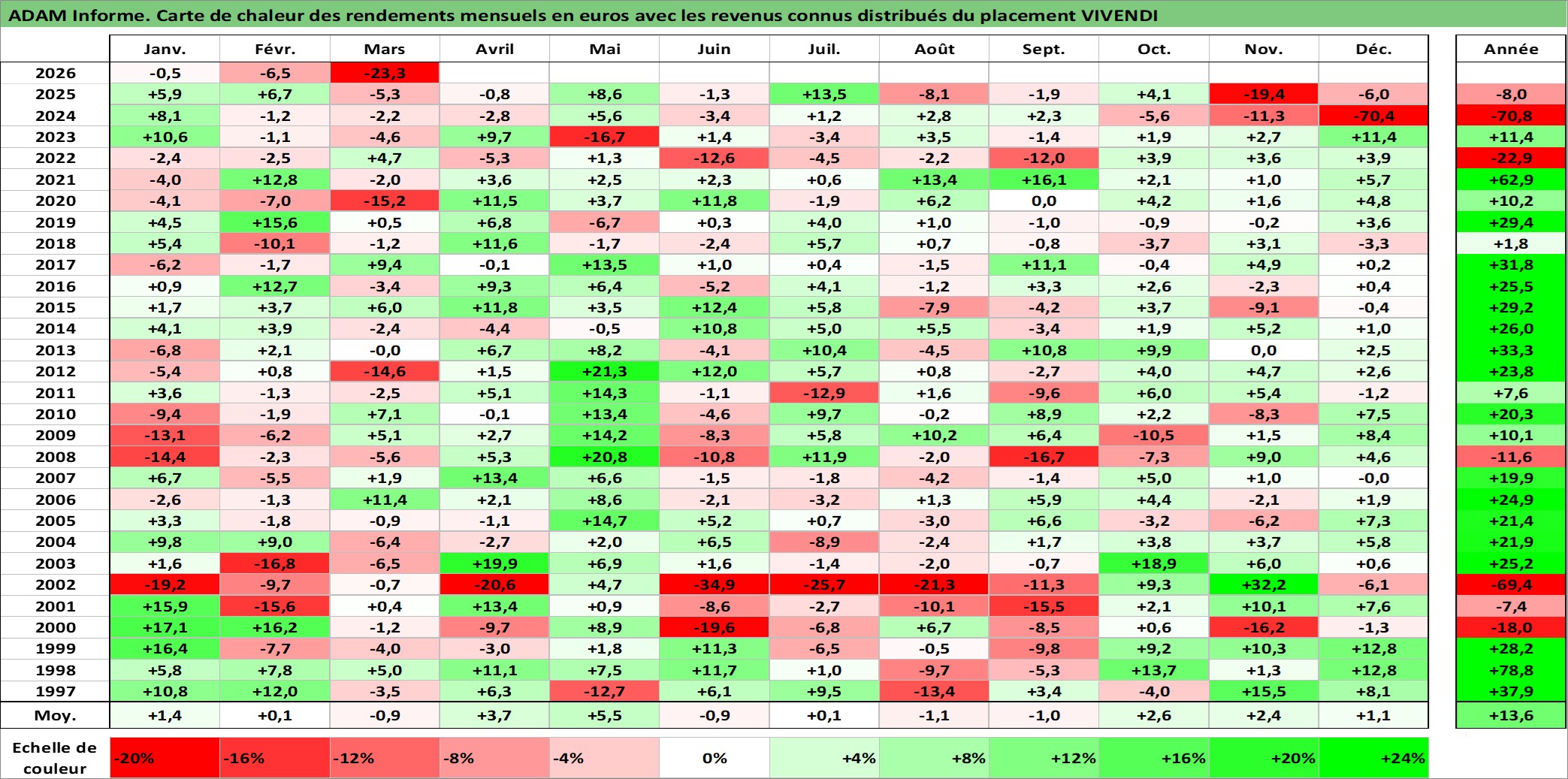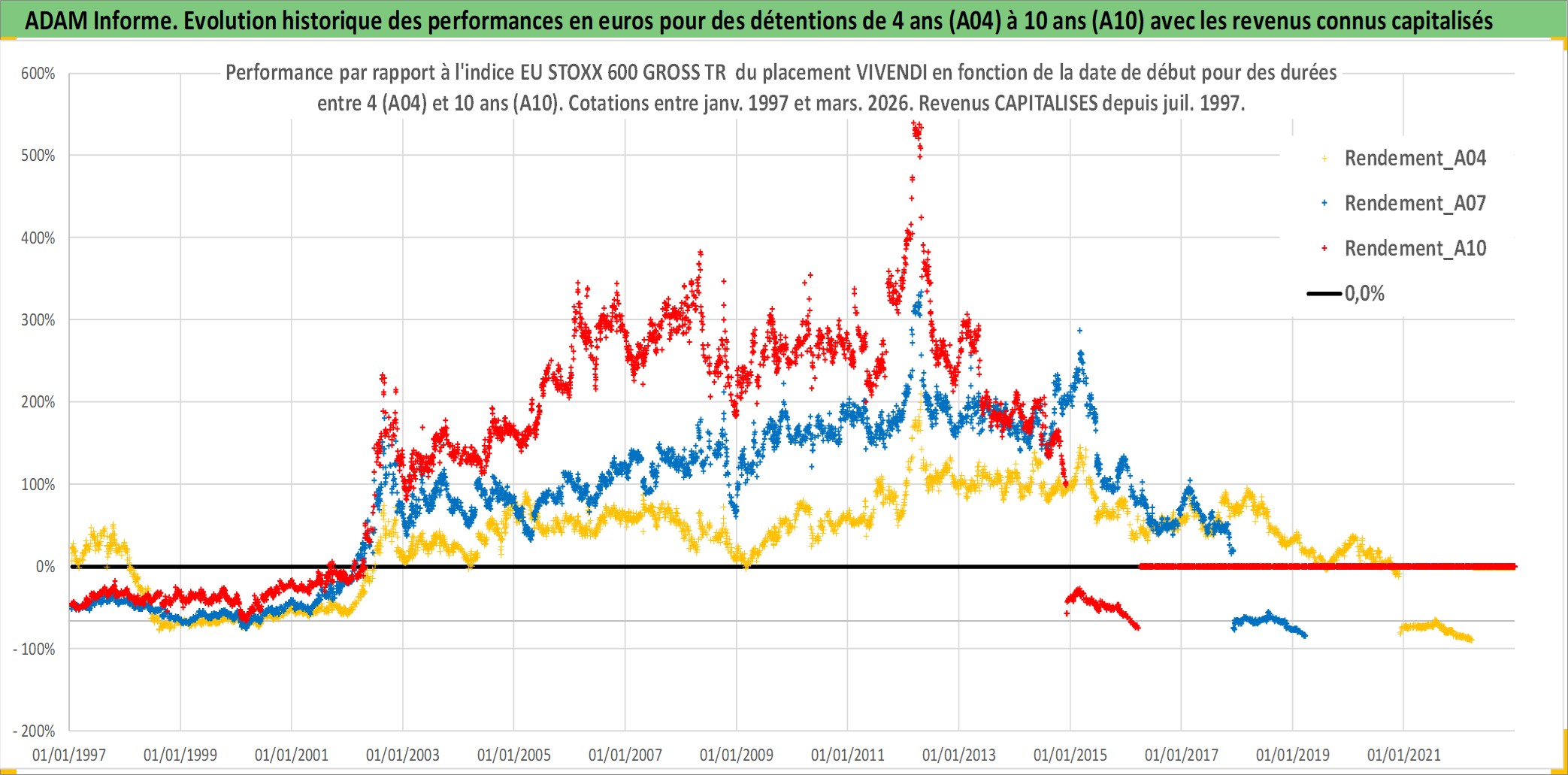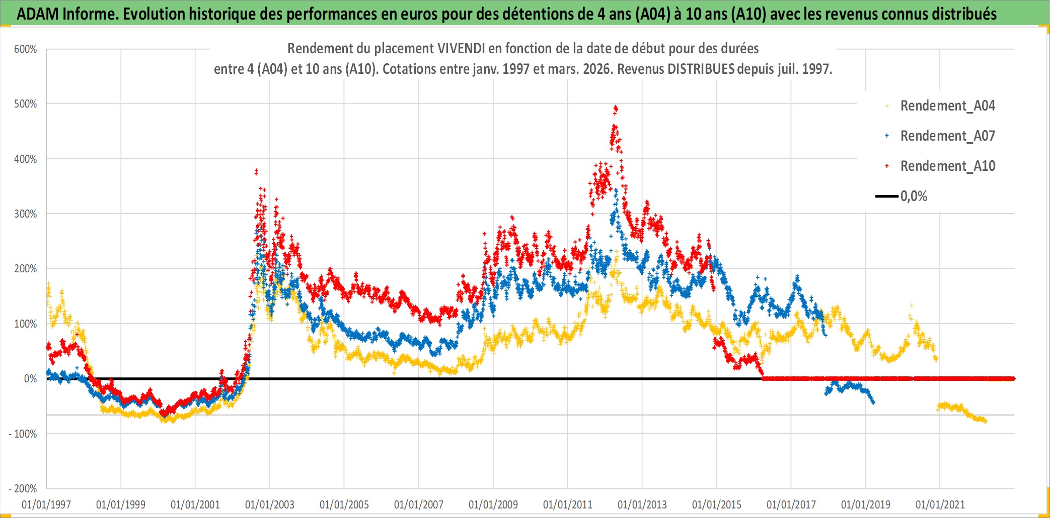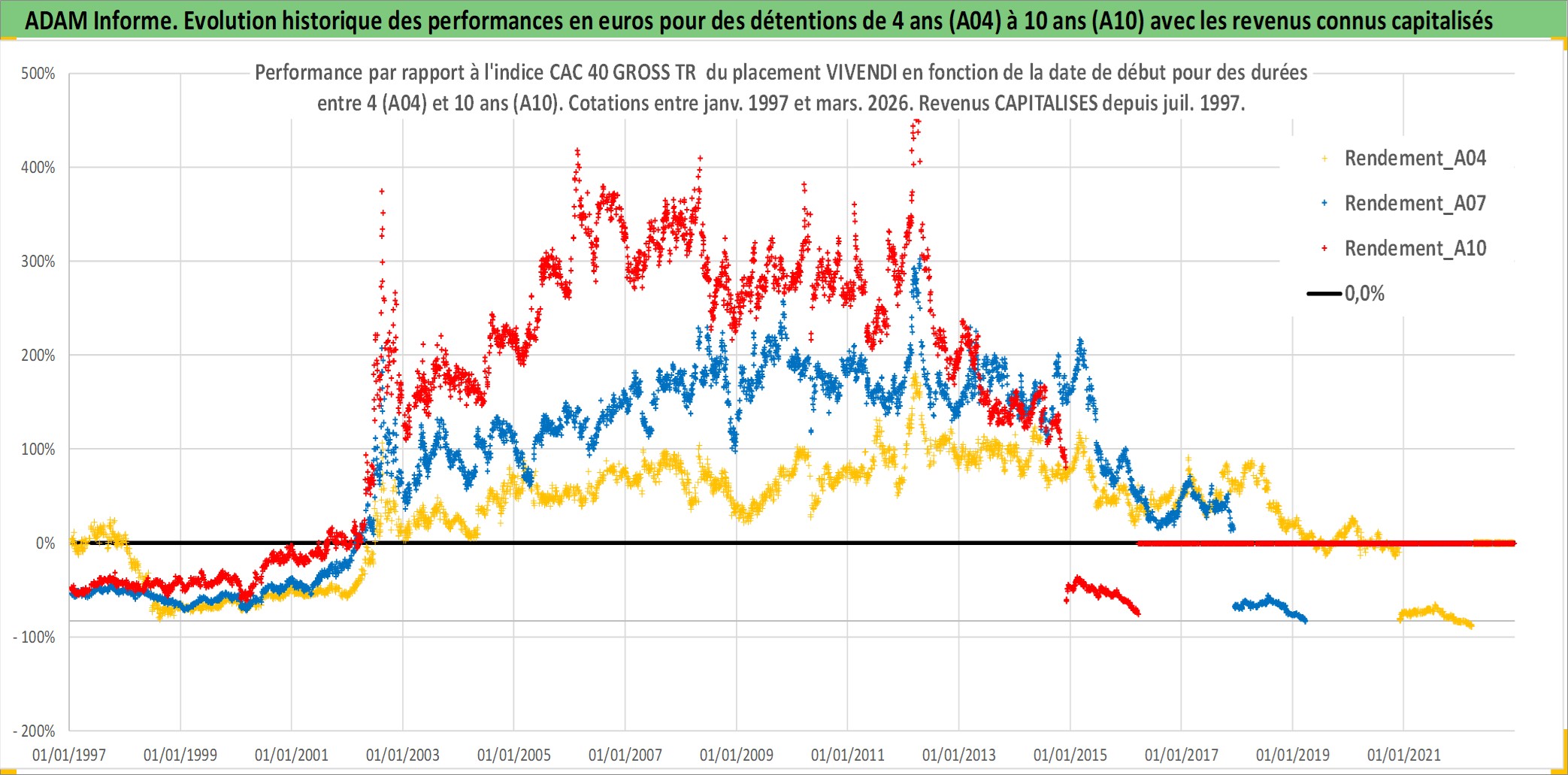 Site dédié aux investisseursPage dédiée sur site financeAnalyse des valorisations hebdomadaires de l'action VIVENDI. Cet actif est cote en EUR. Les valorisations couvrent les semaines 1997W01 a 2026W13. Les revenus de cet actif financier sont pris en compte depuis la semaine 1997W27. La note globale ESG de cet actif est estimee a 16.0 (apres rebasage entre 0 et 20).