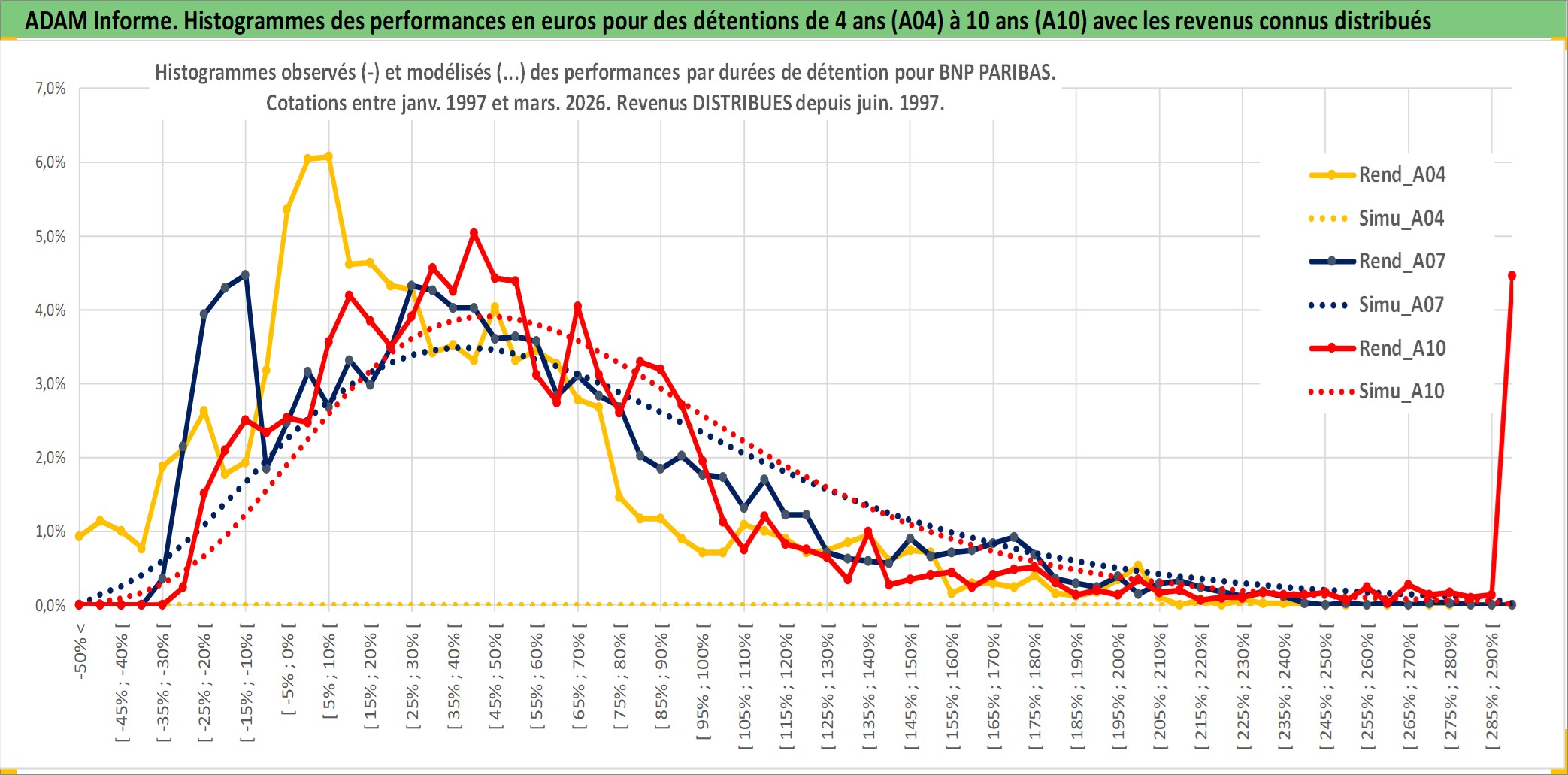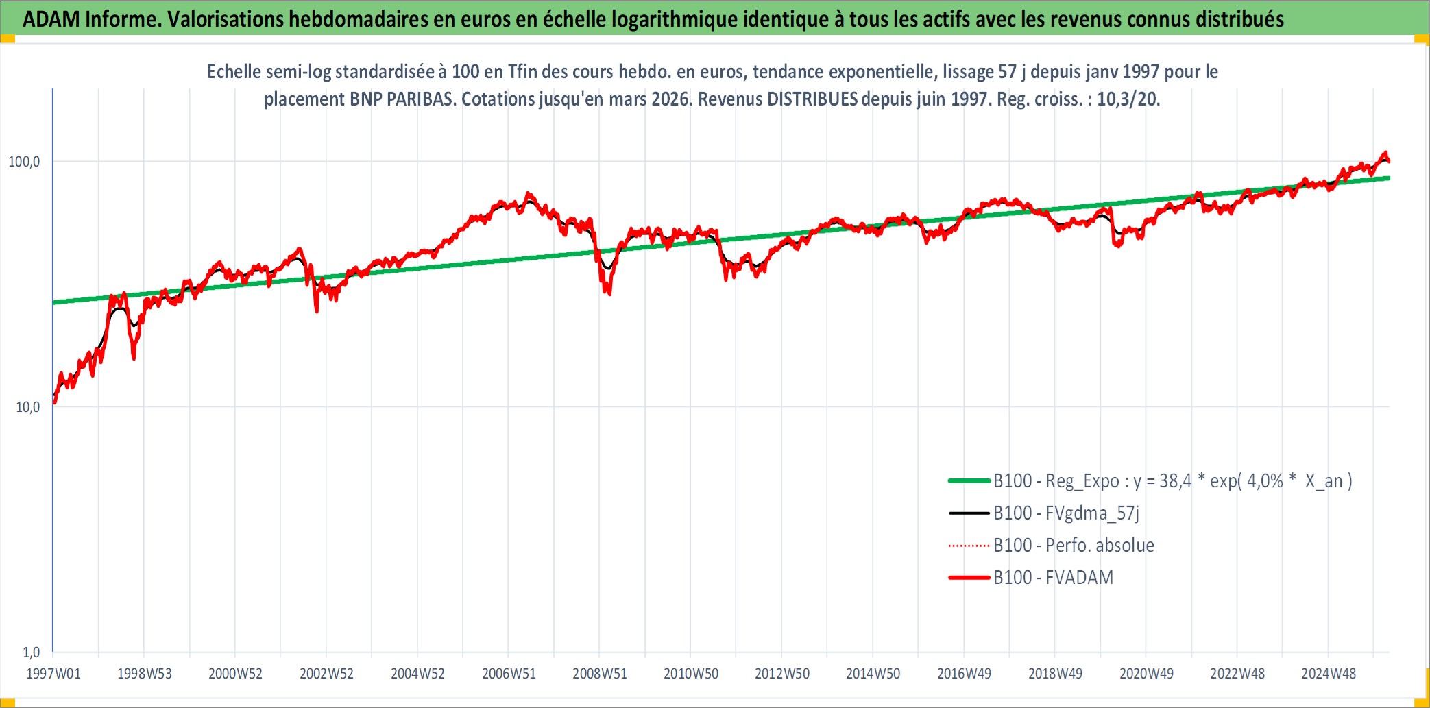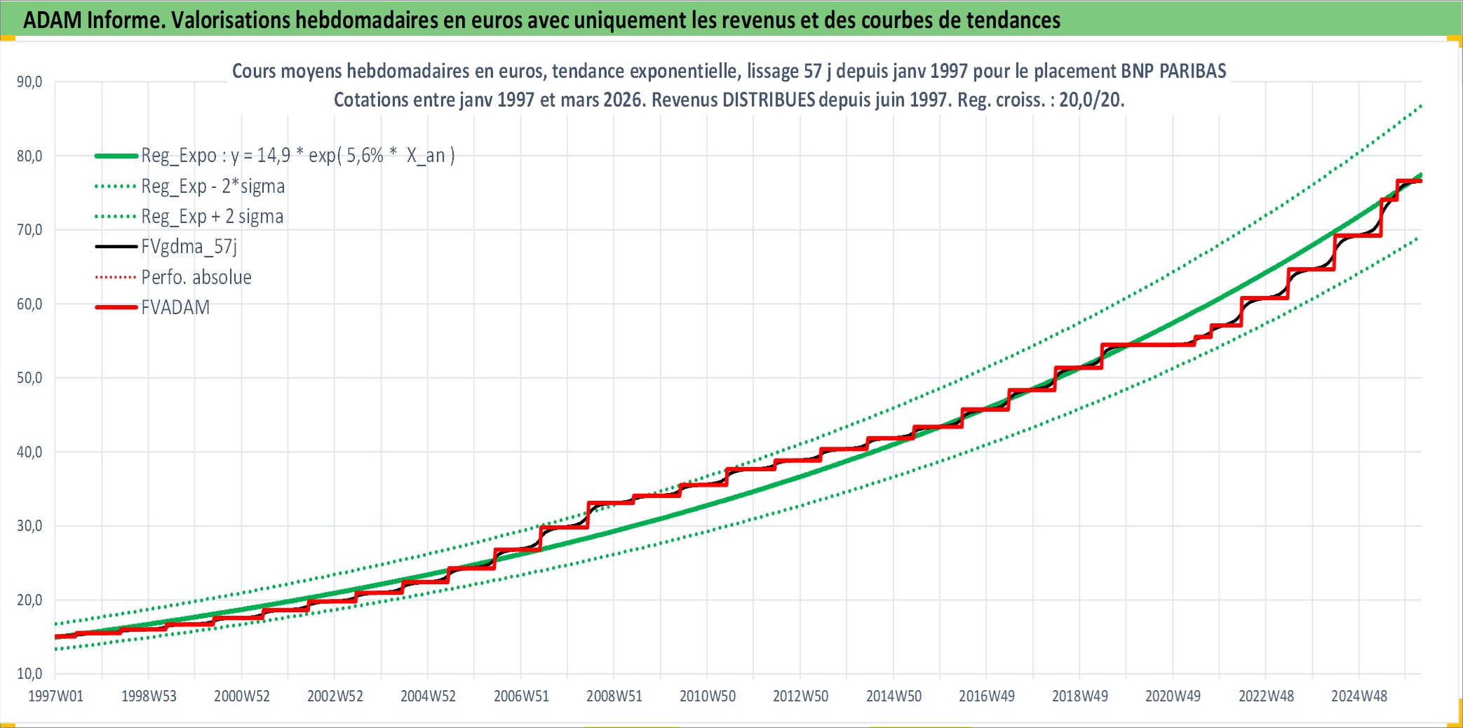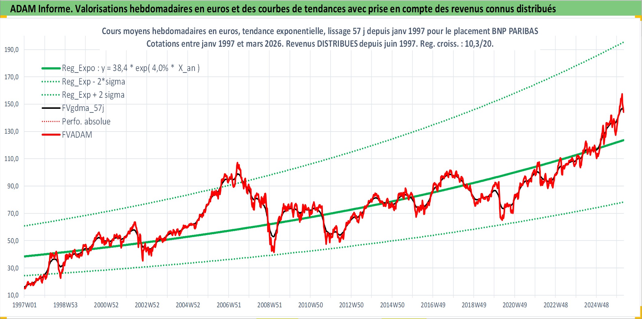 Site dédié aux investisseursPage dédiée sur site financeAnalyse des valorisations hebdomadaires de l'action BNP PARIBAS. Cet actif est cote en EUR. Les valorisations couvrent les semaines 1997W01 a 2026W13. Les revenus de cet actif financier sont pris en compte depuis la semaine 1997W24. La note globale ESG de cet actif est estimee a 7.0 (apres rebasage entre 0 et 20).
