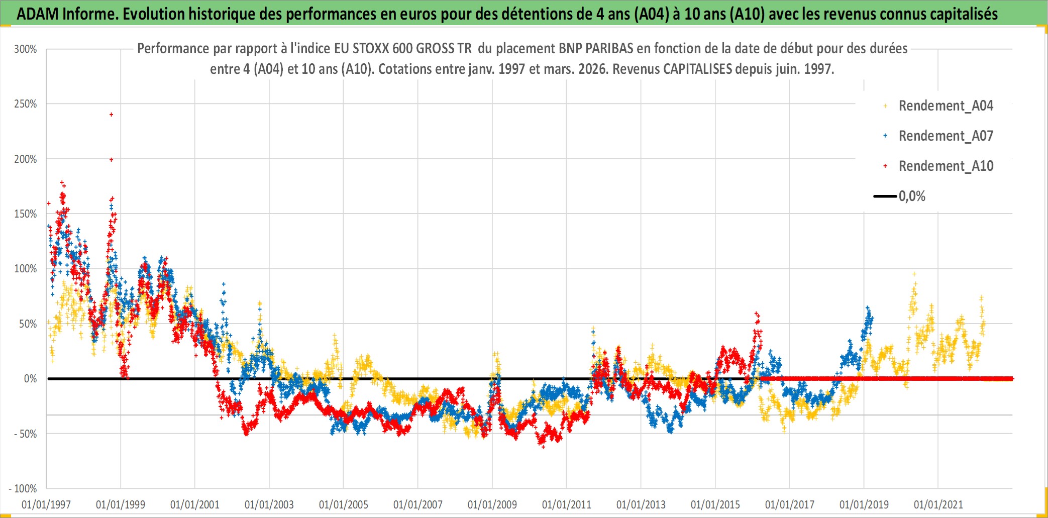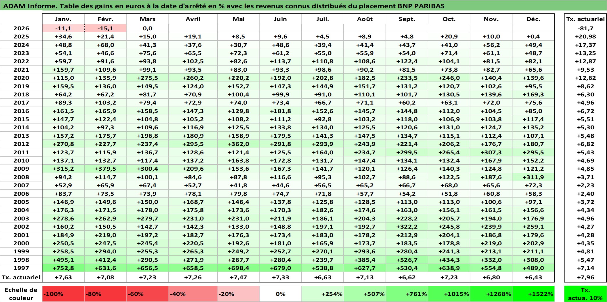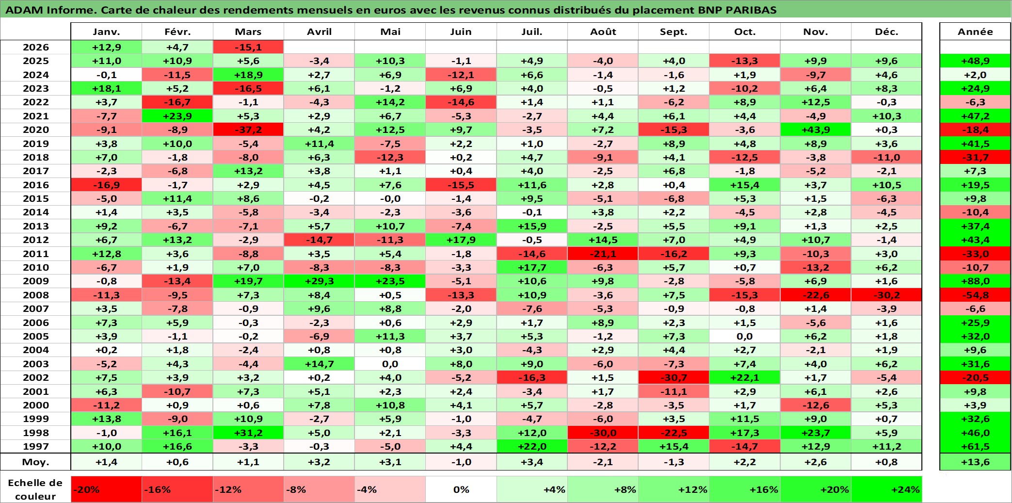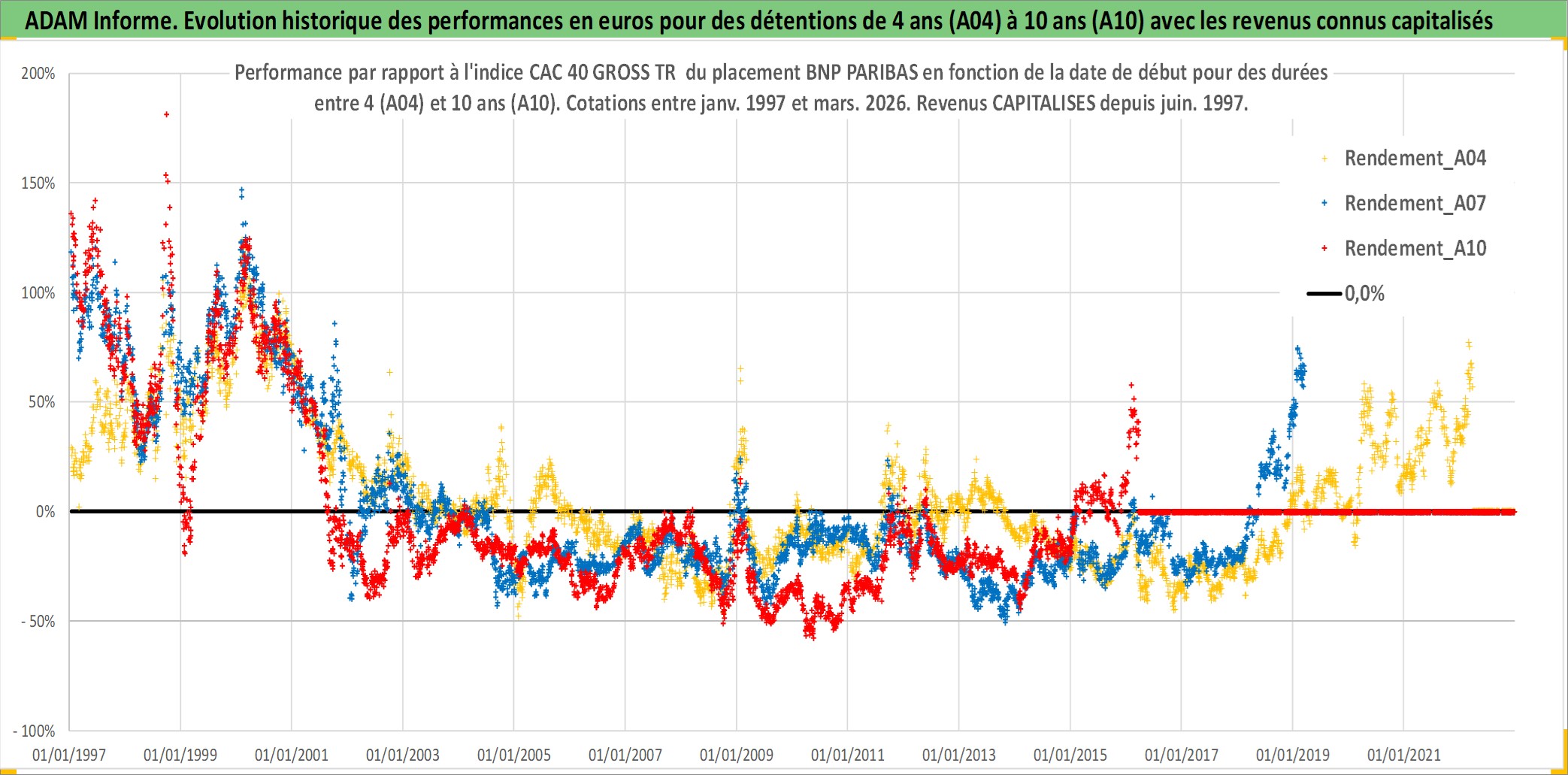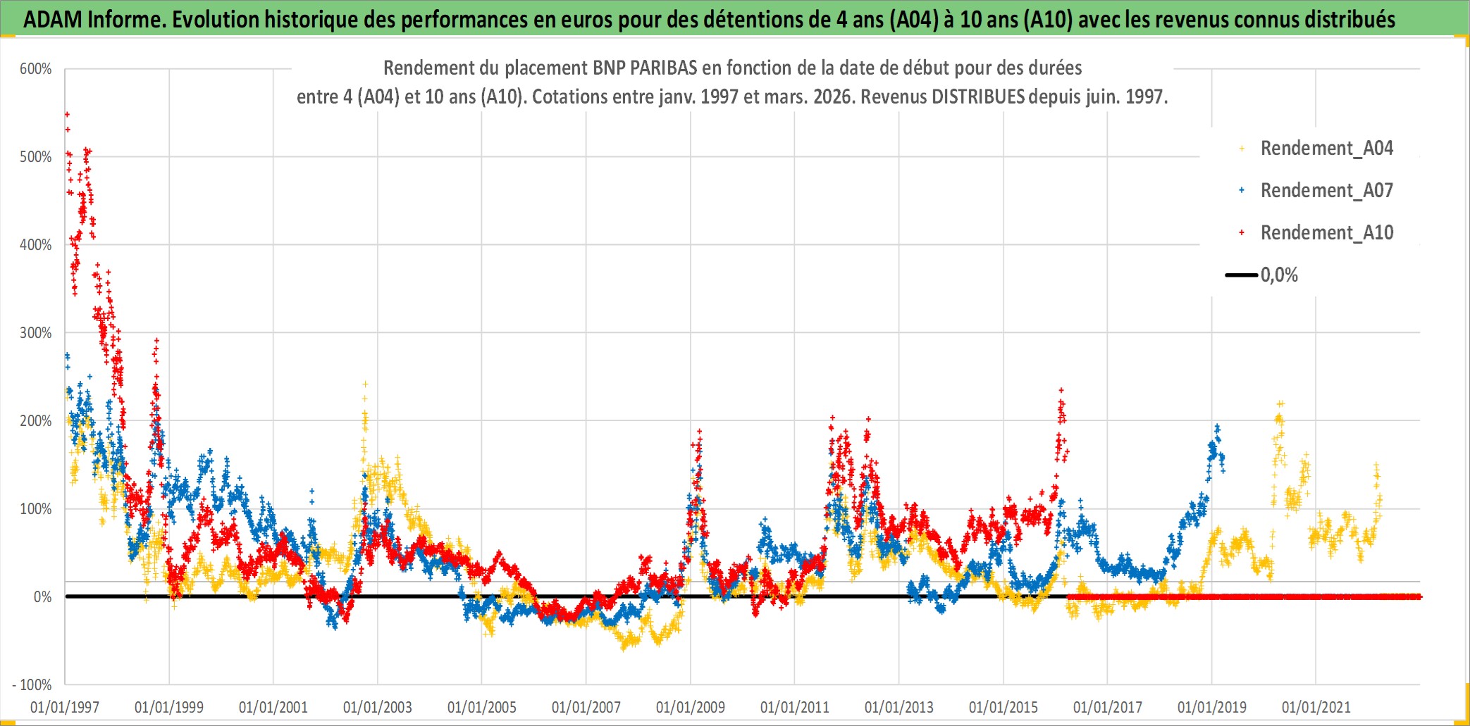 Site dédié aux investisseursPage dédiée sur site financeAnalyse des valorisations hebdomadaires de l'action BNP PARIBAS. Cet actif est cote en EUR. Les valorisations couvrent les semaines 1997W01 a 2026W13. Les revenus de cet actif financier sont pris en compte depuis la semaine 1997W24. La note globale ESG de cet actif est estimee a 7.0 (apres rebasage entre 0 et 20).