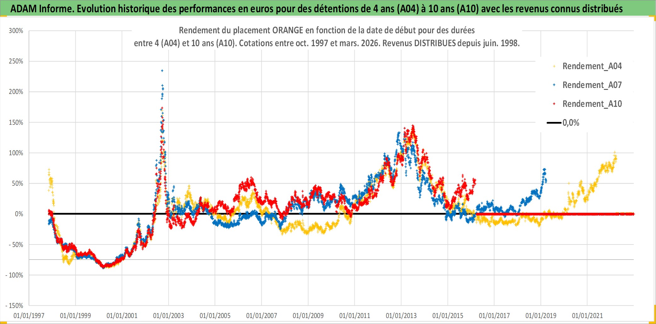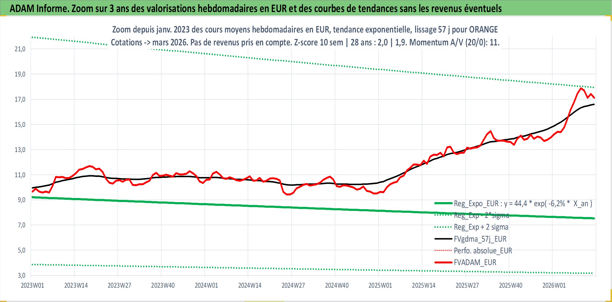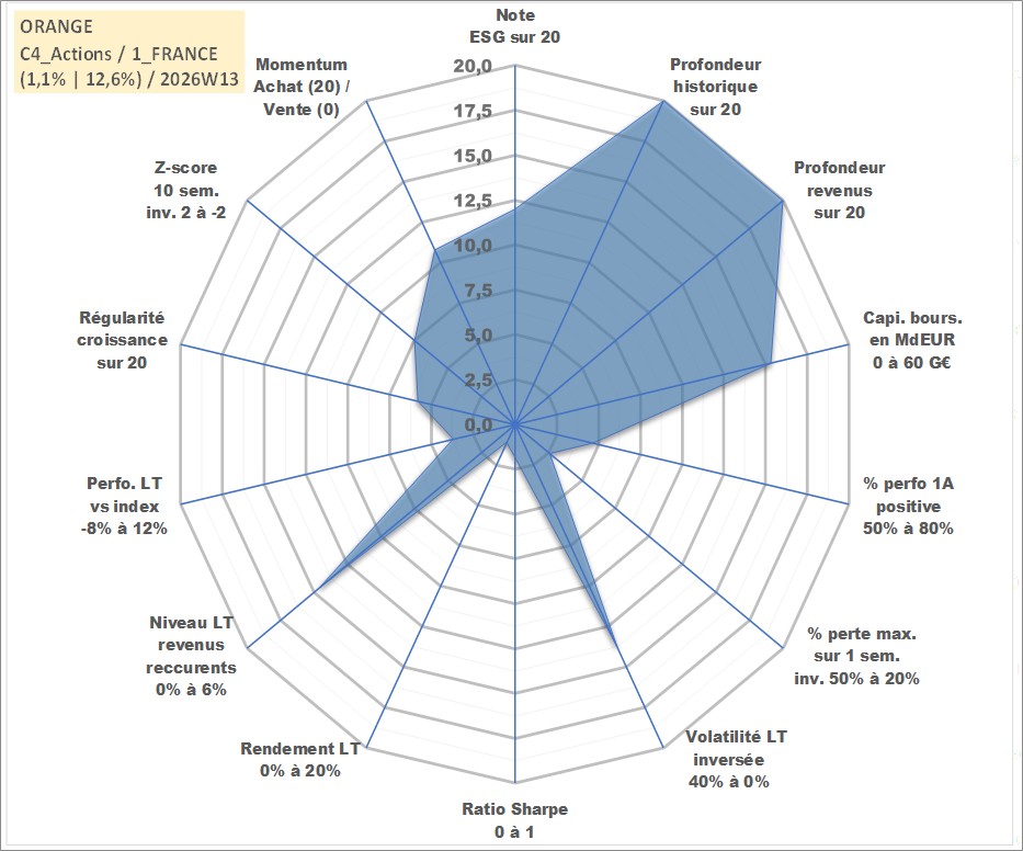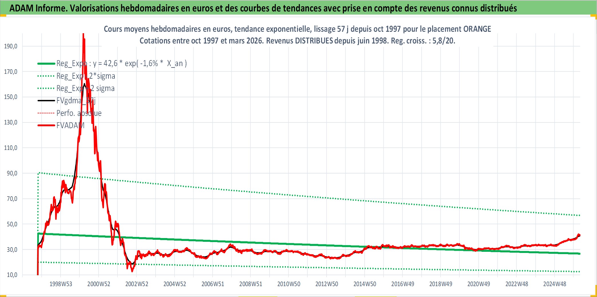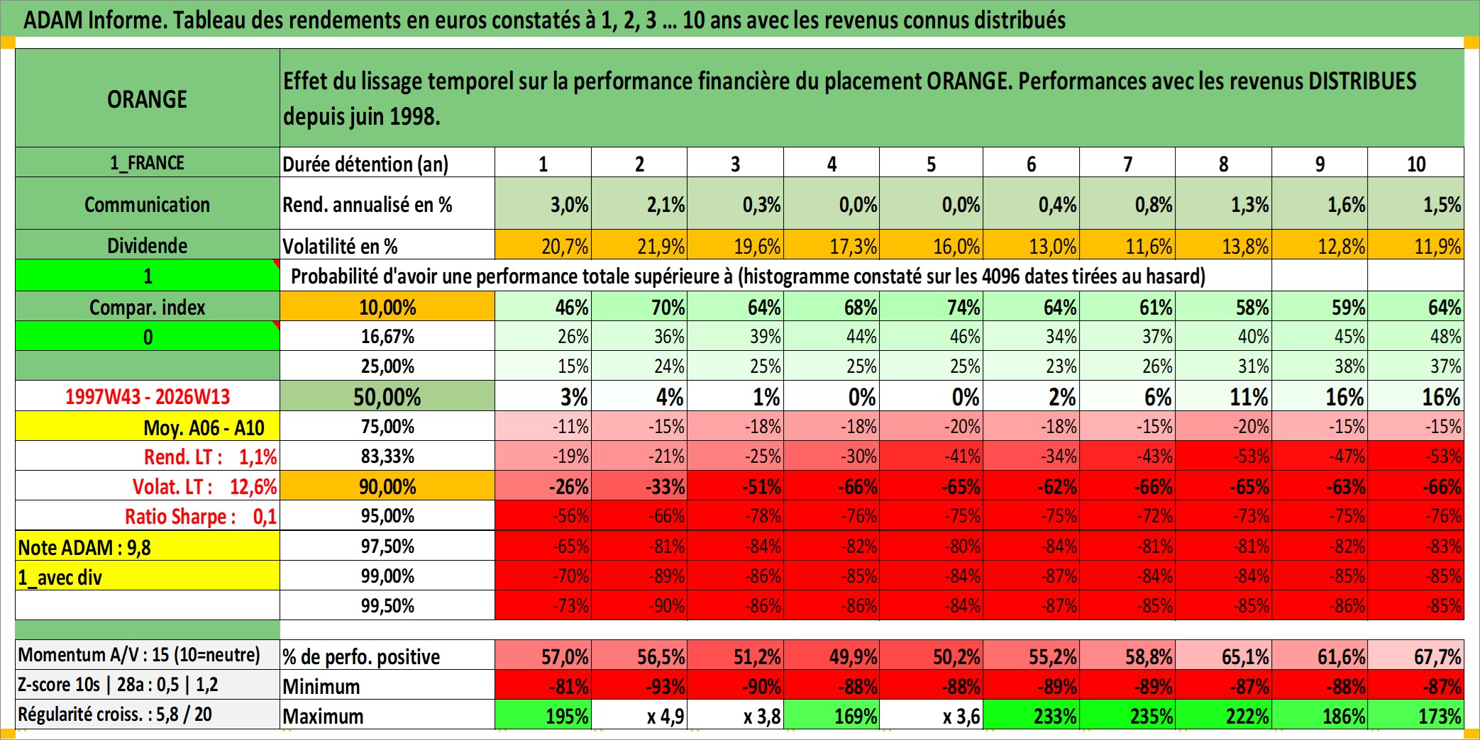 Site dédié aux investisseursPage dédiée sur site financeAnalyse des valorisations hebdomadaires de l'action ORANGE. Cet actif est cote en EUR. Les valorisations couvrent les semaines 1997W43 a 2026W13. Les revenus de cet actif financier sont pris en compte depuis la semaine 1998W25. La note globale ESG de cet actif est estimee a 12.0 (apres rebasage entre 0 et 20).