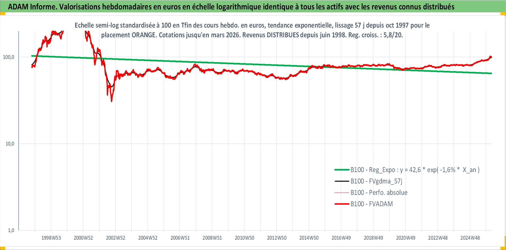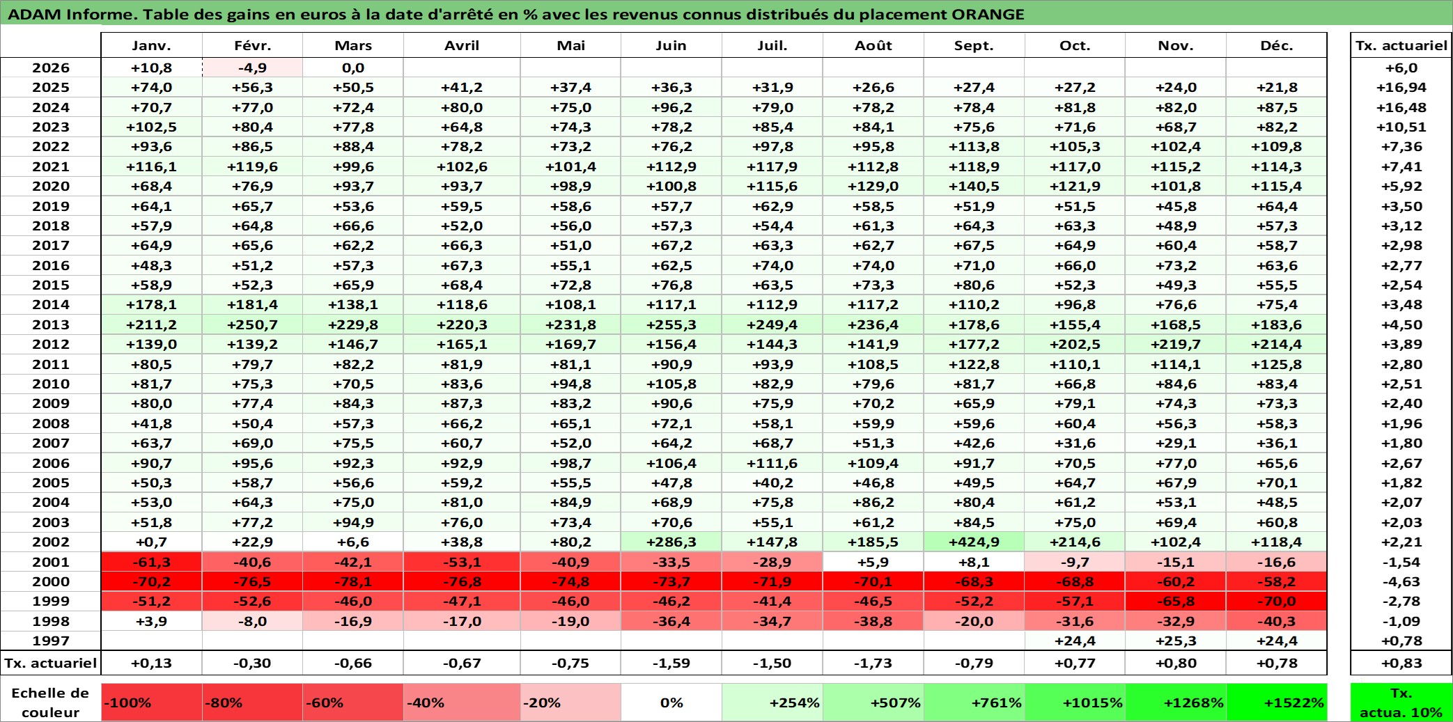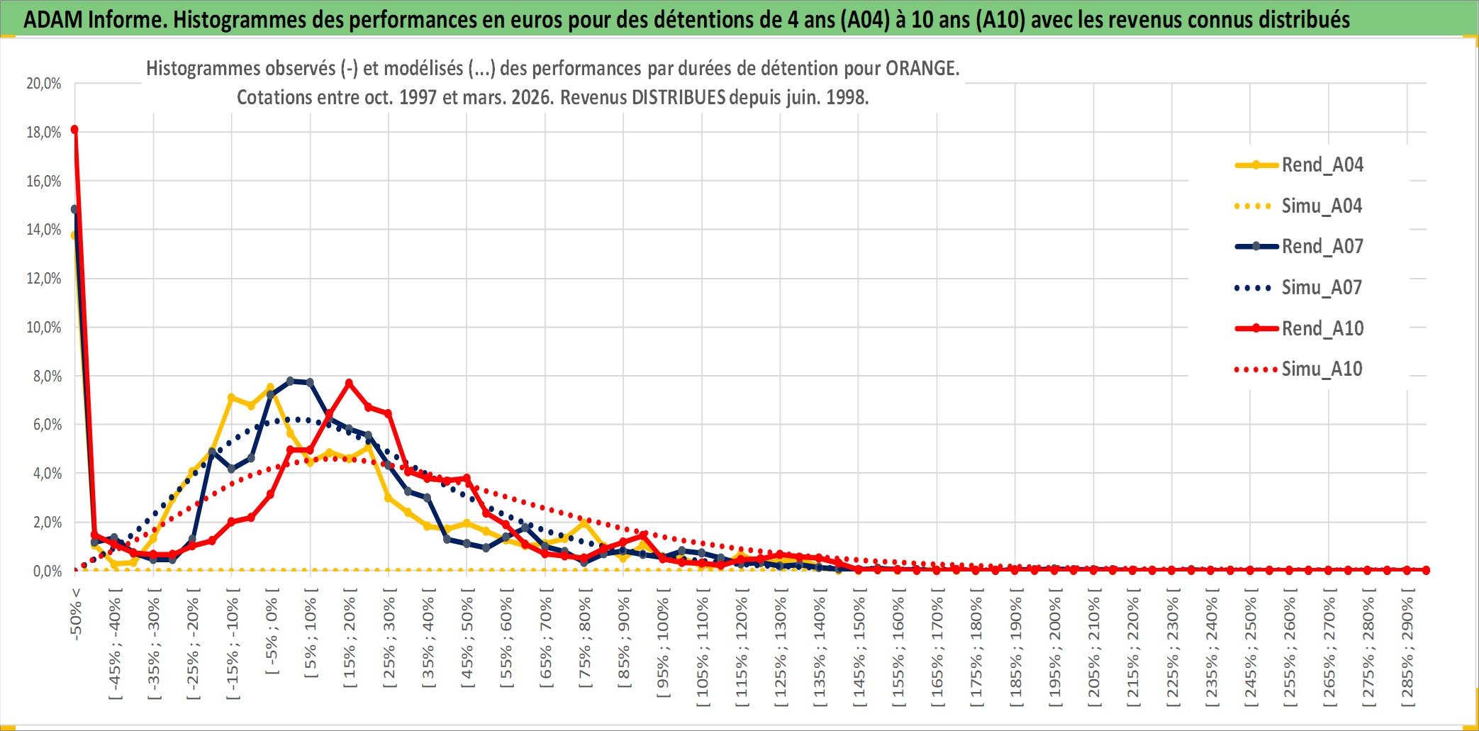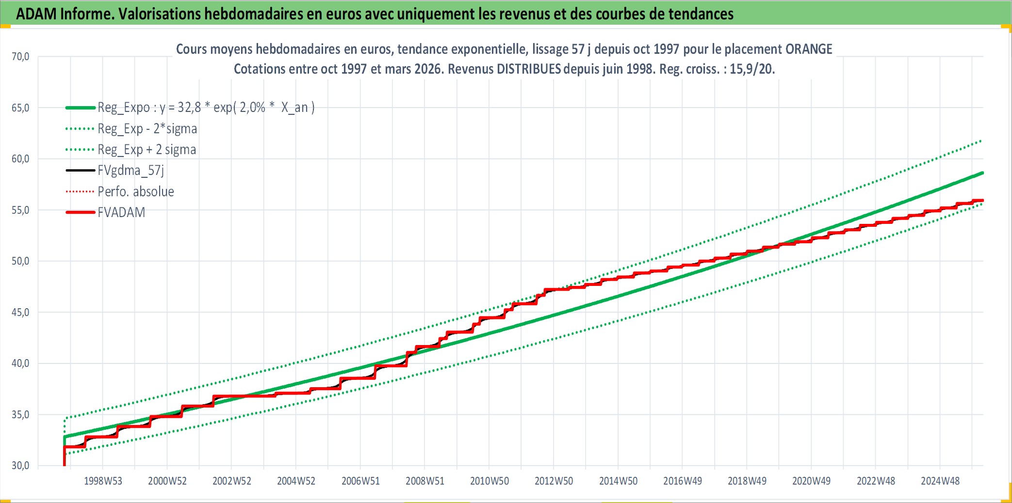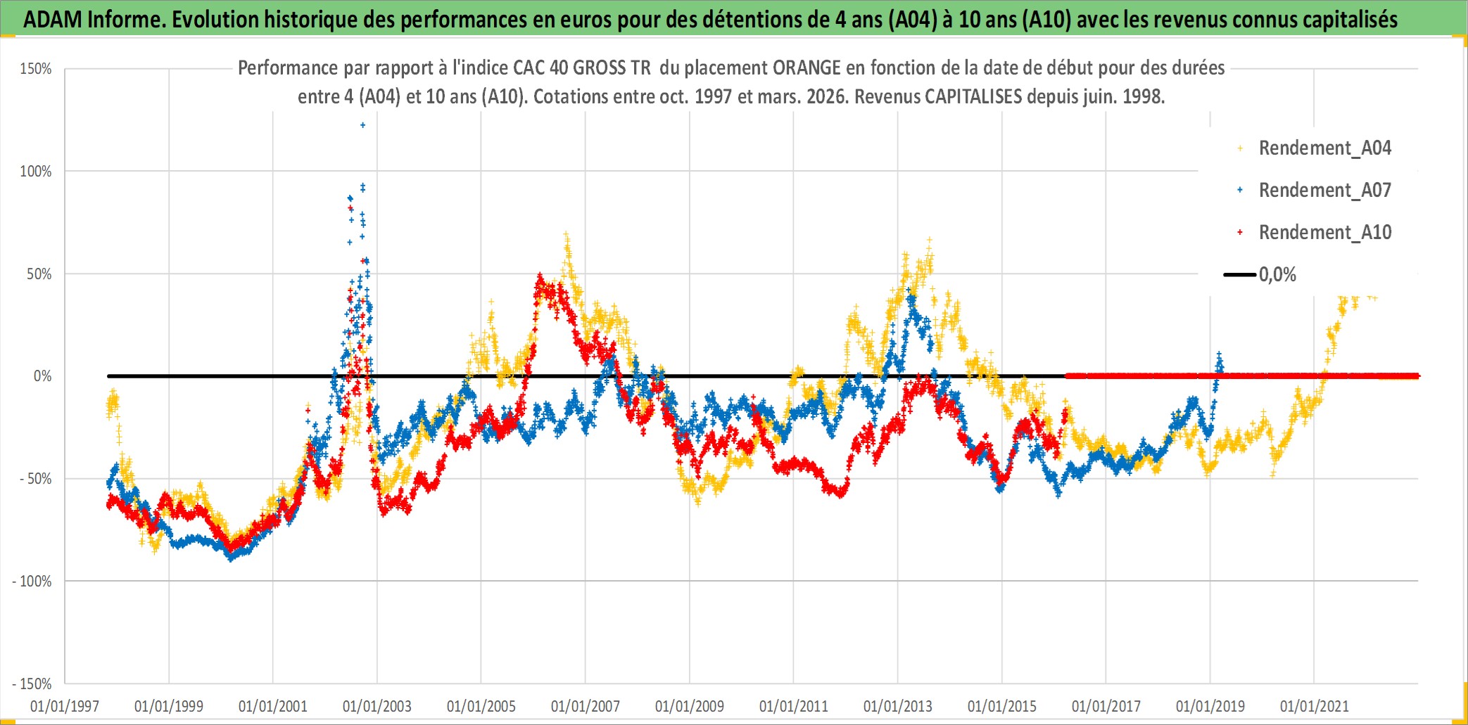Site dédié aux investisseursPage dédiée sur site financeAnalyse des valorisations hebdomadaires de l'action ORANGE. Cet actif est cote en EUR. Les valorisations couvrent les semaines 1997W43 a 2026W13. Les revenus de cet actif financier sont pris en compte depuis la semaine 1998W25. La note globale ESG de cet actif est estimee a 12.0 (apres rebasage entre 0 et 20).