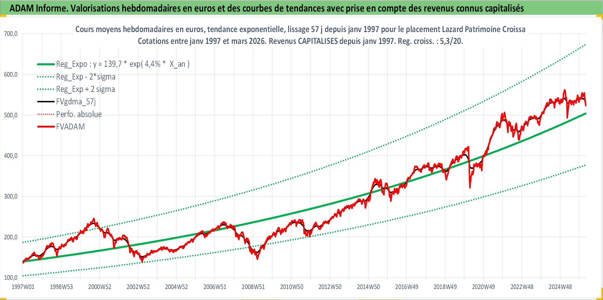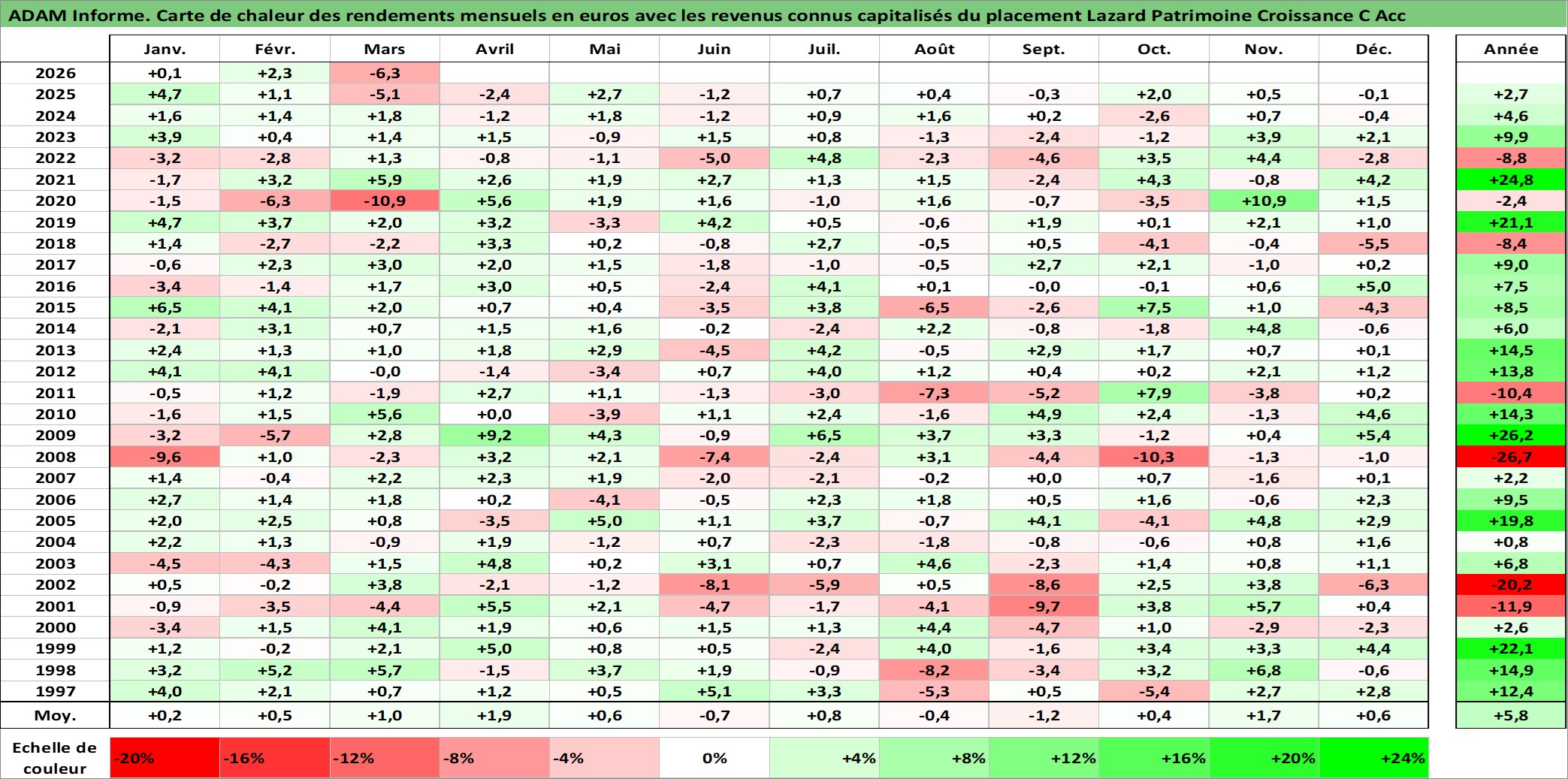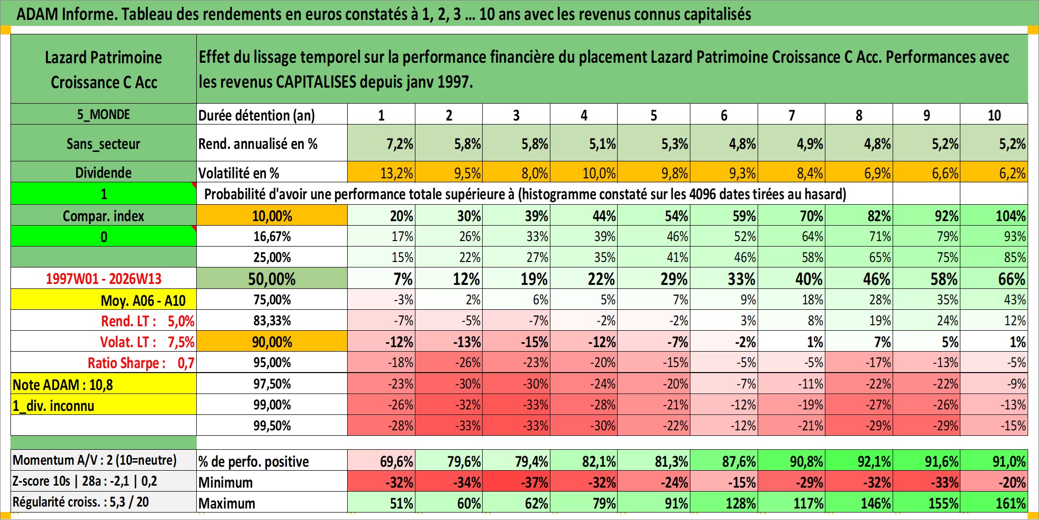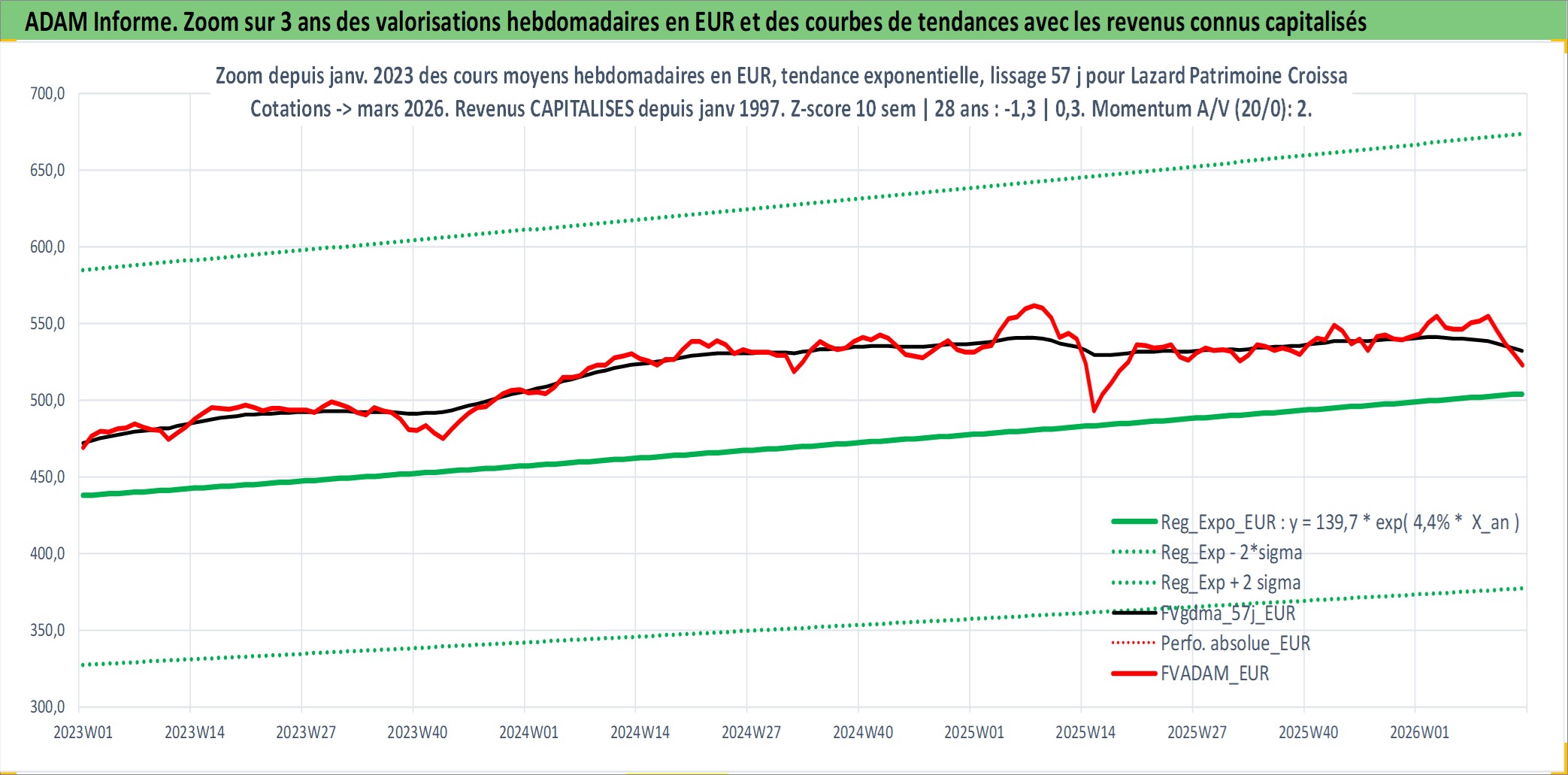 Site dédié aux investisseursPage dédiée sur site financeAnalyse des valorisations hebdomadaires du fonds Lazard Patrimoine Croissance C Acc. Cet actif est cote en EUR. Les valorisations couvrent les semaines 1997W01 a 2026W13. Les revenus de cet actif financier sont pris en compte depuis la semaine 1997W01. La note globale ESG de cet actif est estimee a 10.0 (apres rebasage entre 0 et 20).