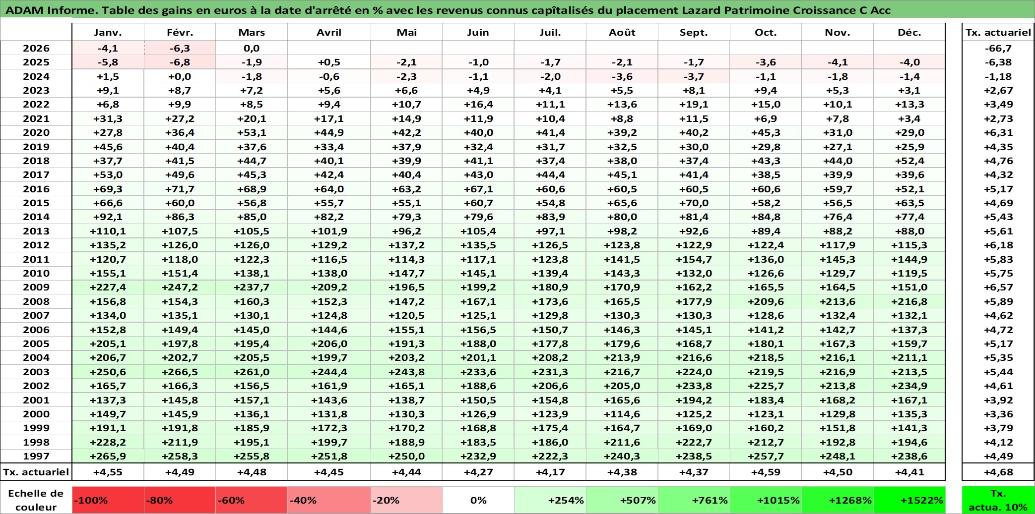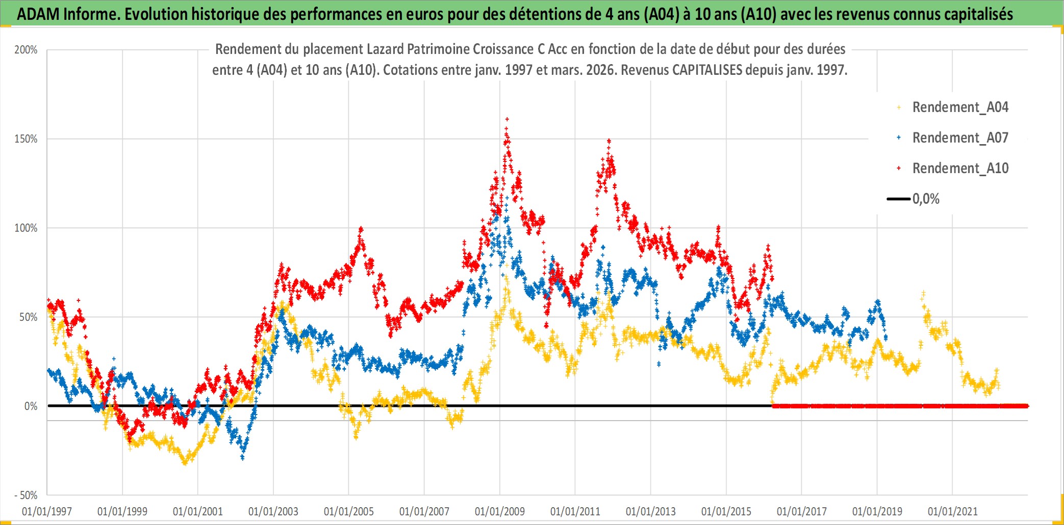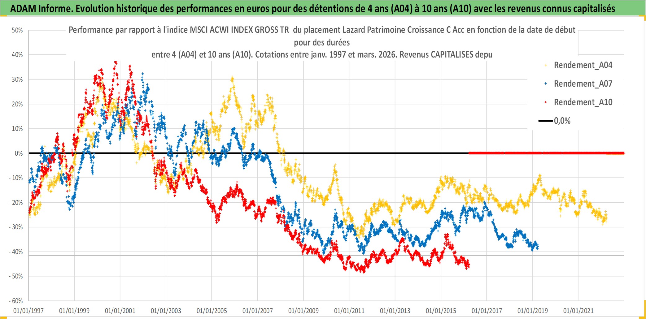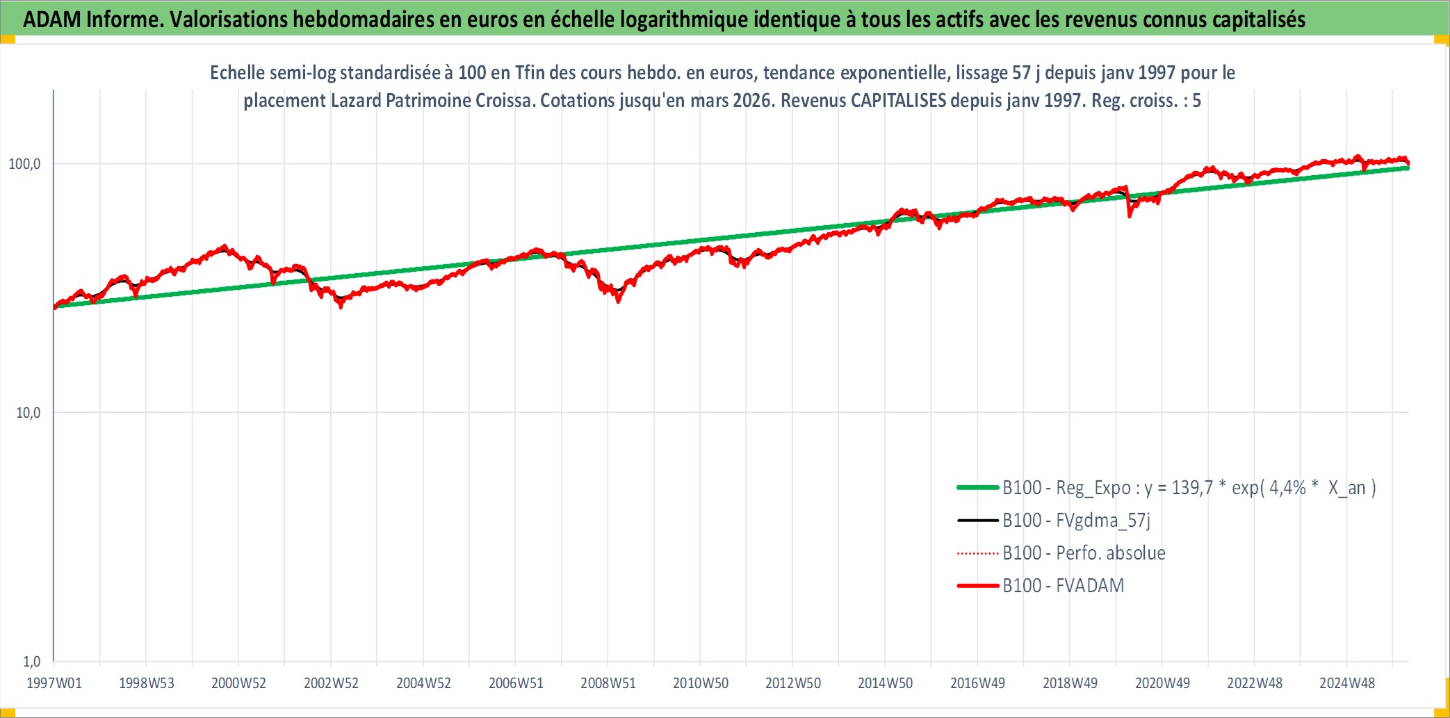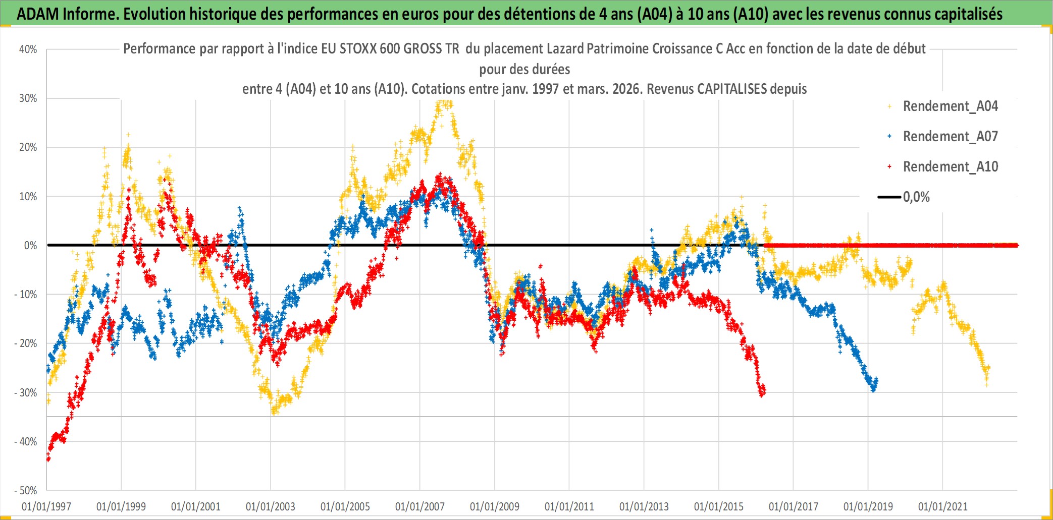Site dédié aux investisseursPage dédiée sur site financeAnalyse des valorisations hebdomadaires du fonds Lazard Patrimoine Croissance C Acc. Cet actif est cote en EUR. Les valorisations couvrent les semaines 1997W01 a 2026W13. Les revenus de cet actif financier sont pris en compte depuis la semaine 1997W01. La note globale ESG de cet actif est estimee a 10.0 (apres rebasage entre 0 et 20).