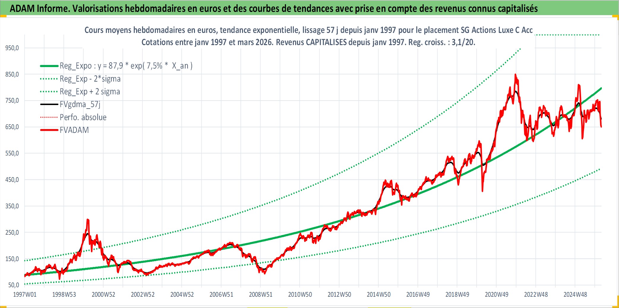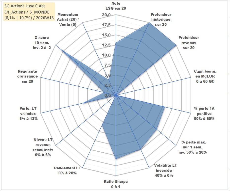 Site dédié aux investisseursPage dédiée sur site financeAnalyse des valorisations hebdomadaires du fonds SG Actions Luxe C Acc. Cet actif est cote en EUR. Les valorisations couvrent les semaines 1997W01 a 2026W13. Les revenus de cet actif financier sont pris en compte depuis la semaine 1997W01. La note globale ESG de cet actif est estimee a 13.0 (apres rebasage entre 0 et 20).