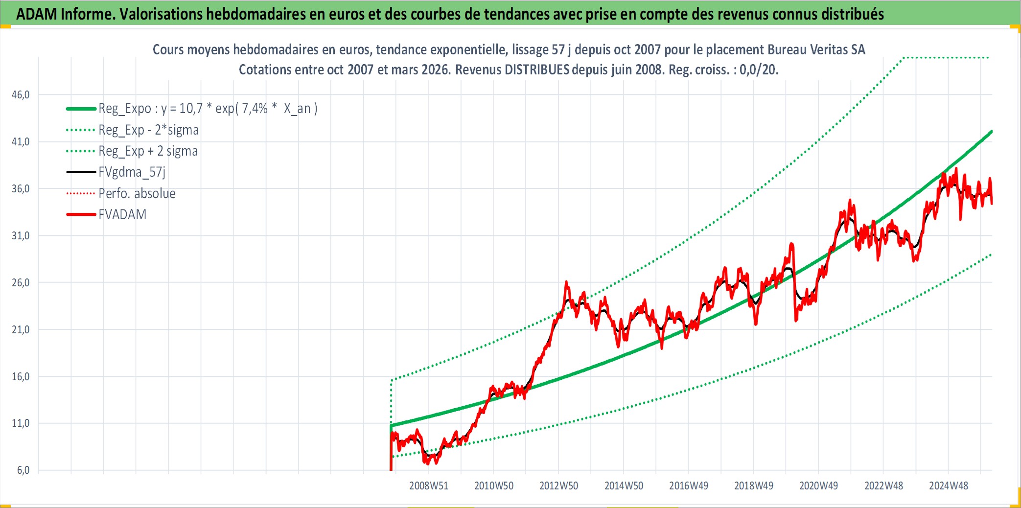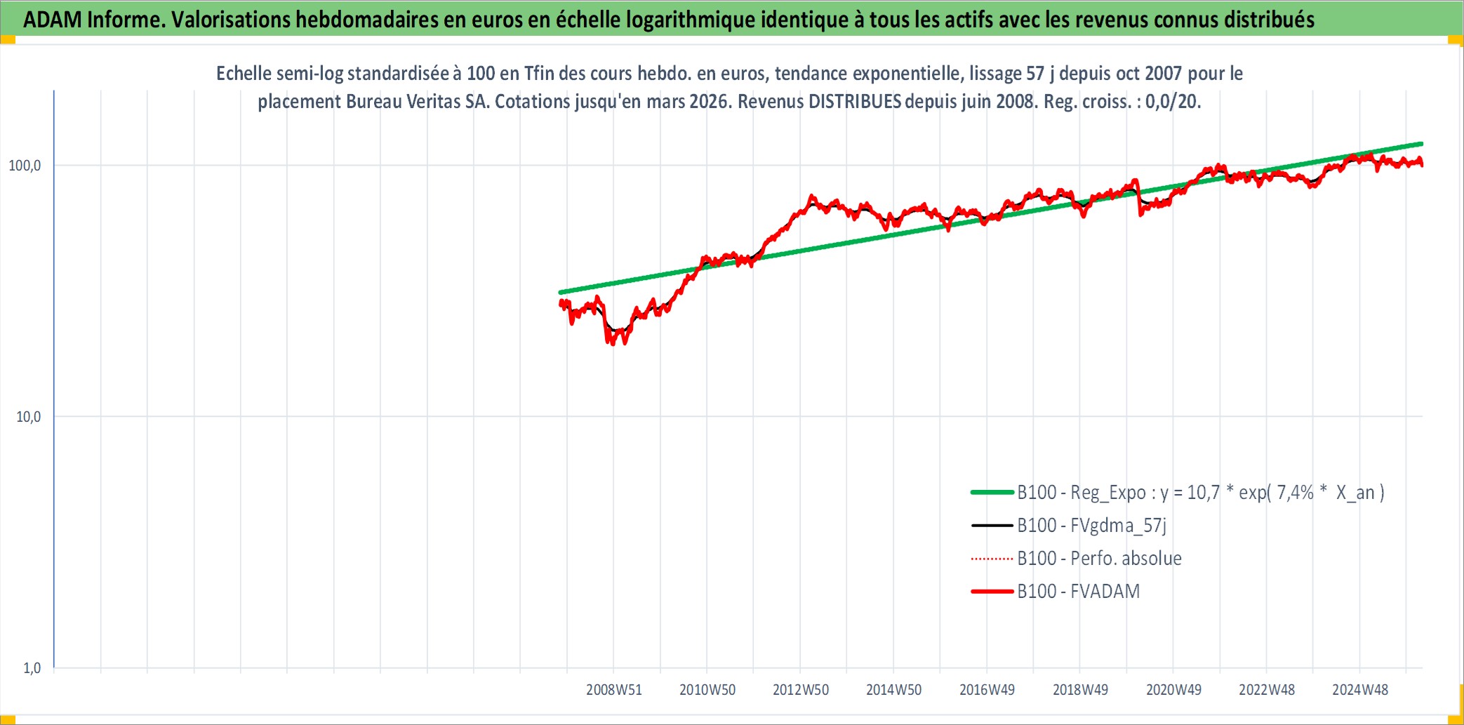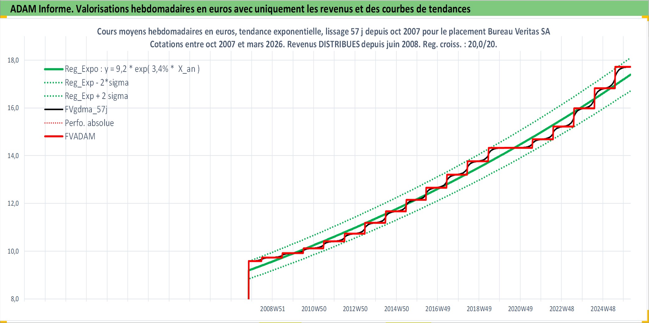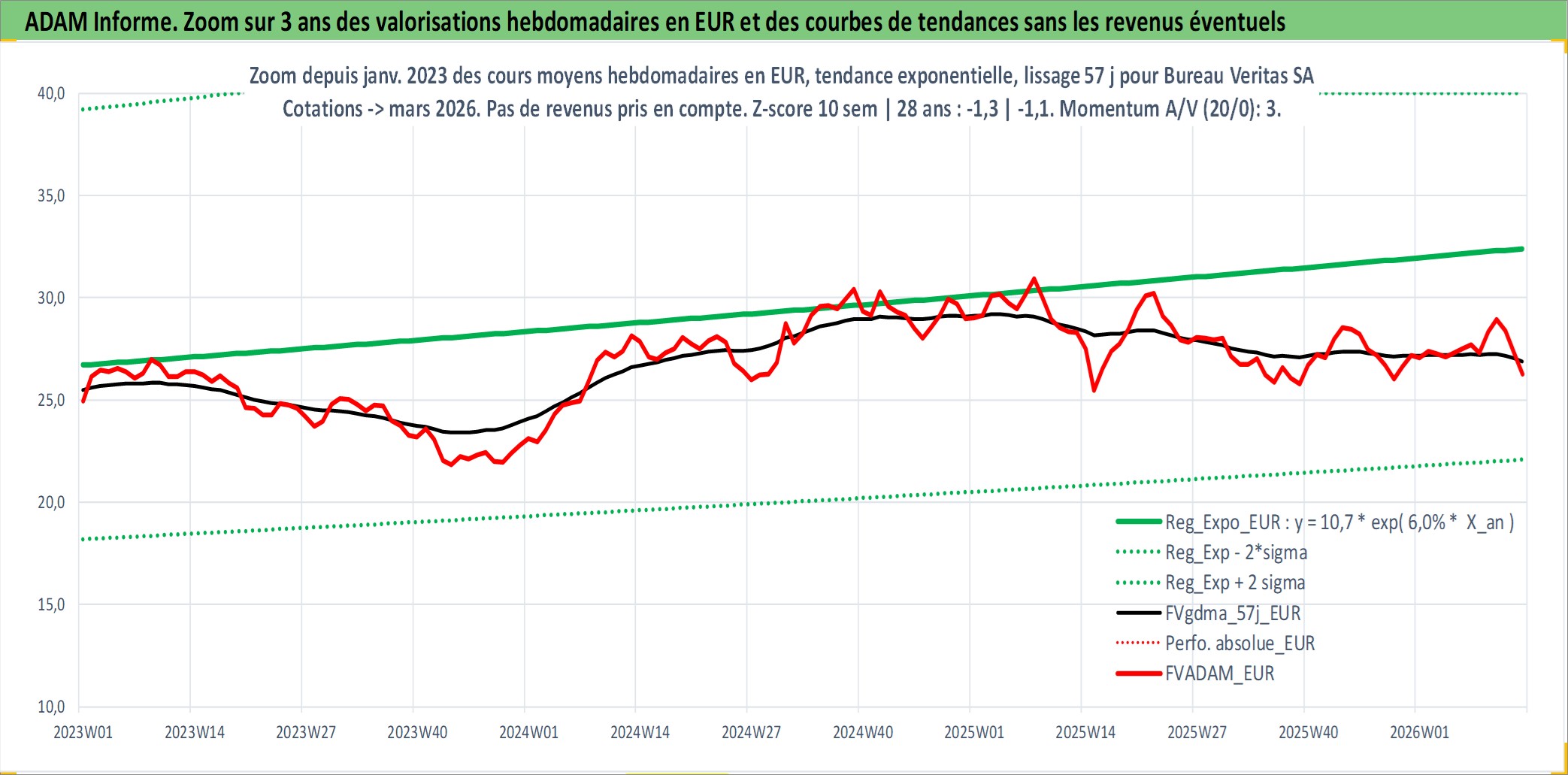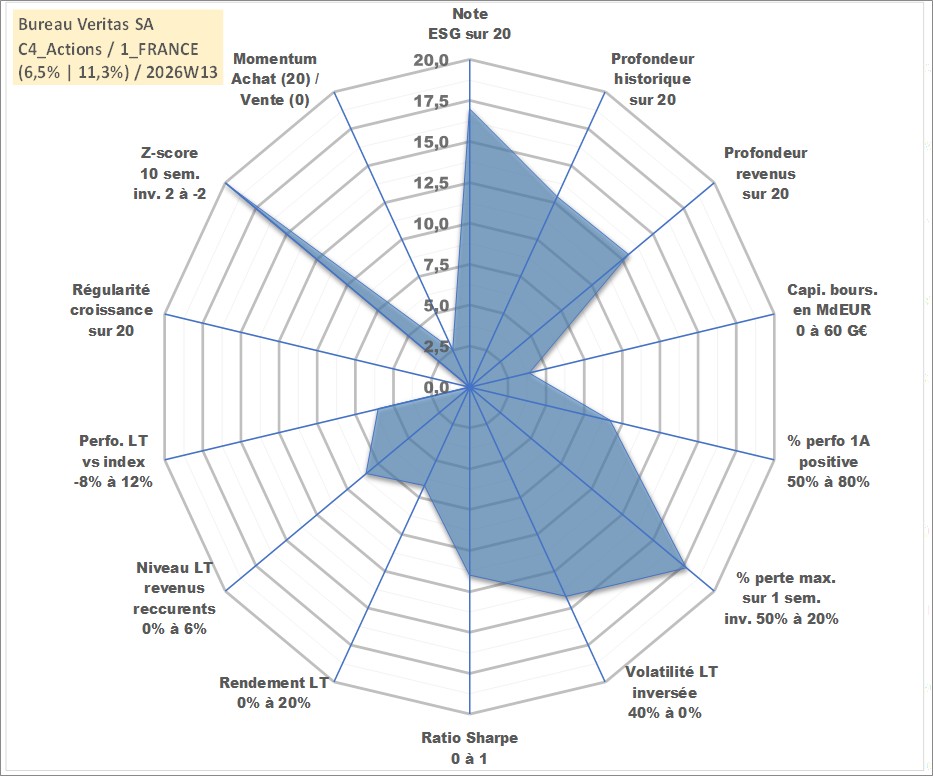 Site dédié aux investisseursPage dédiée sur site financeAnalyse des valorisations hebdomadaires de l'action Bureau Veritas SA. Cet actif est cote en EUR. Les valorisations couvrent les semaines 2007W43 a 2026W13. Les revenus de cet actif financier sont pris en compte depuis la semaine 2008W24. La note globale ESG de cet actif est estimee a 17.0 (apres rebasage entre 0 et 20).